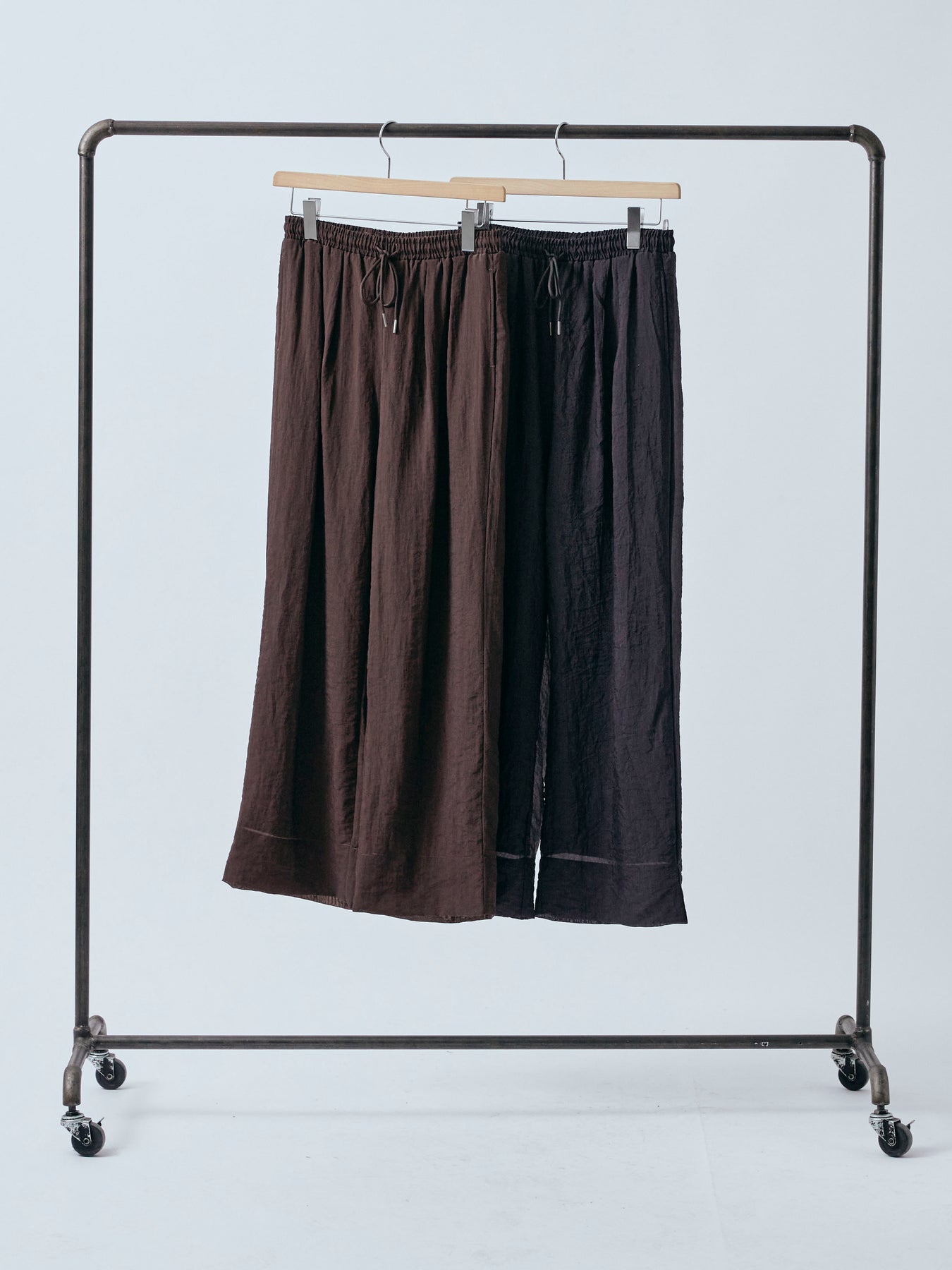 ほどよい光沢感とシボ感が魅力のシャイニースラブ素材を使用したワイドパンツ。 動くたびに揺れる軽やかな生地感と、シアーな透け感が抜け感をプラスします。 ウエストはゴム+ドローストリング仕様でストレスフリーな穿き心地。 Tシャツやブラウスはもちろん、ワンピースとのレイヤードにも活躍する1本です。