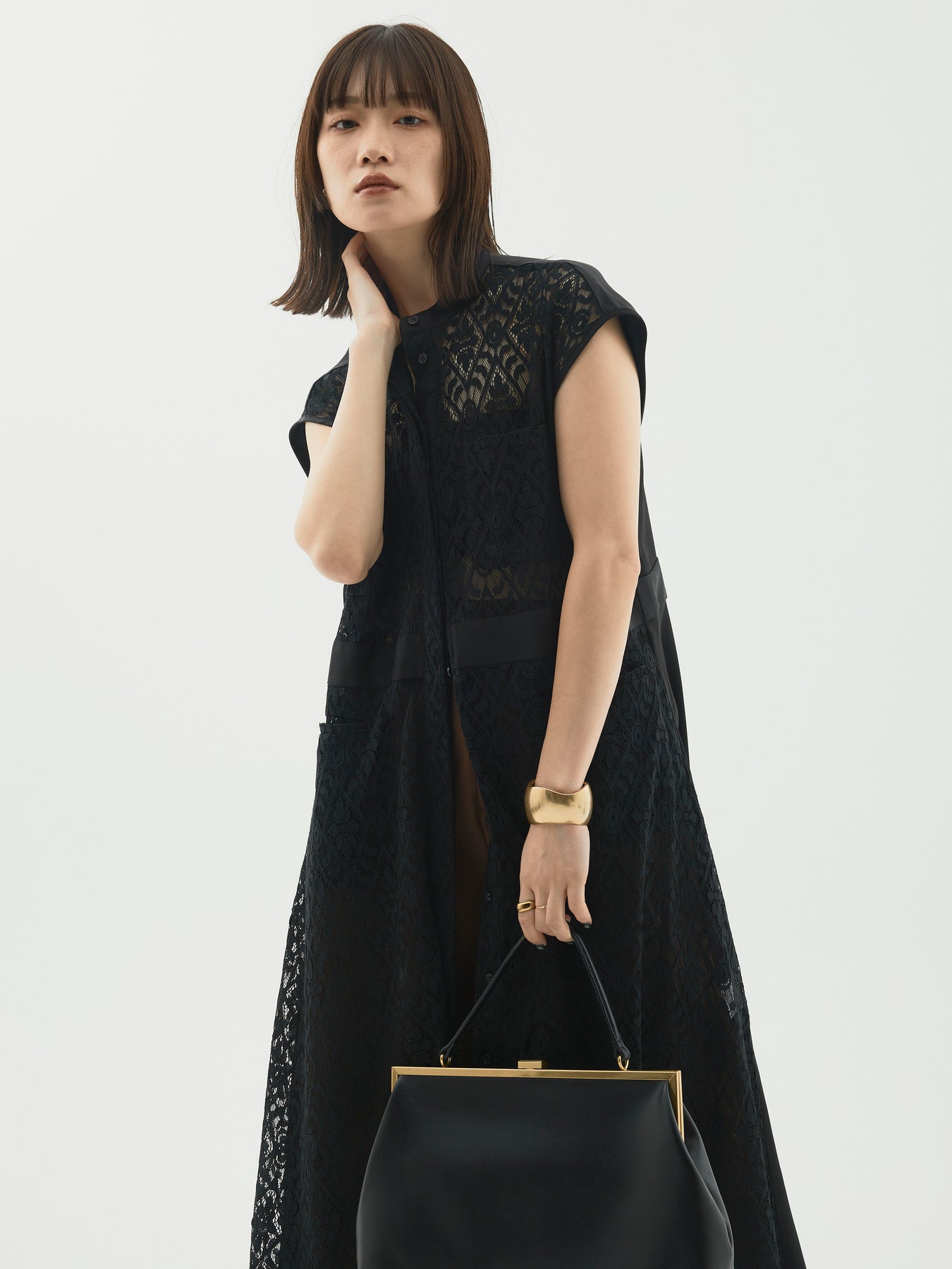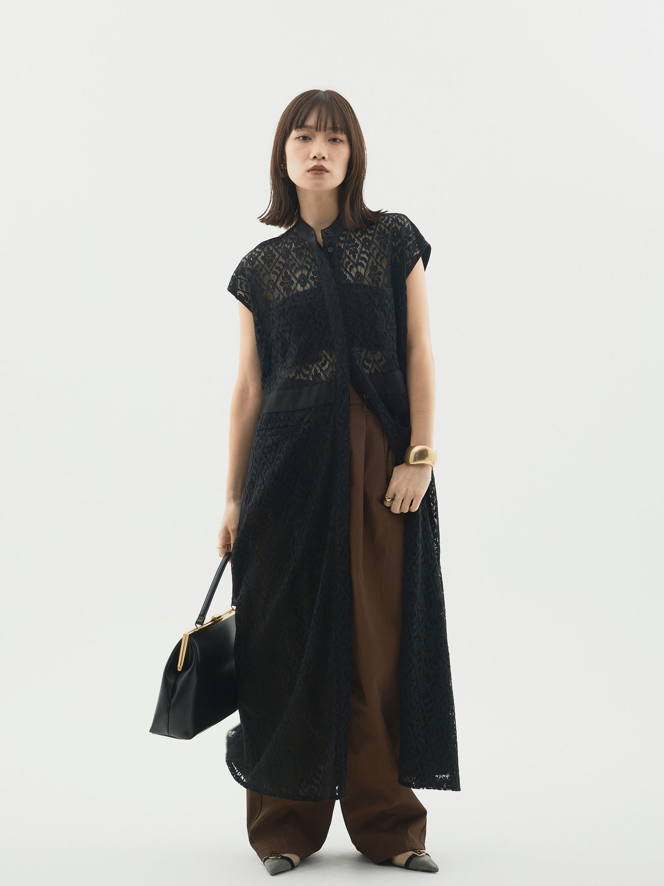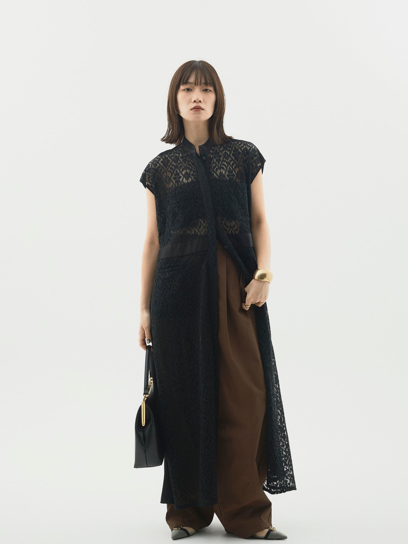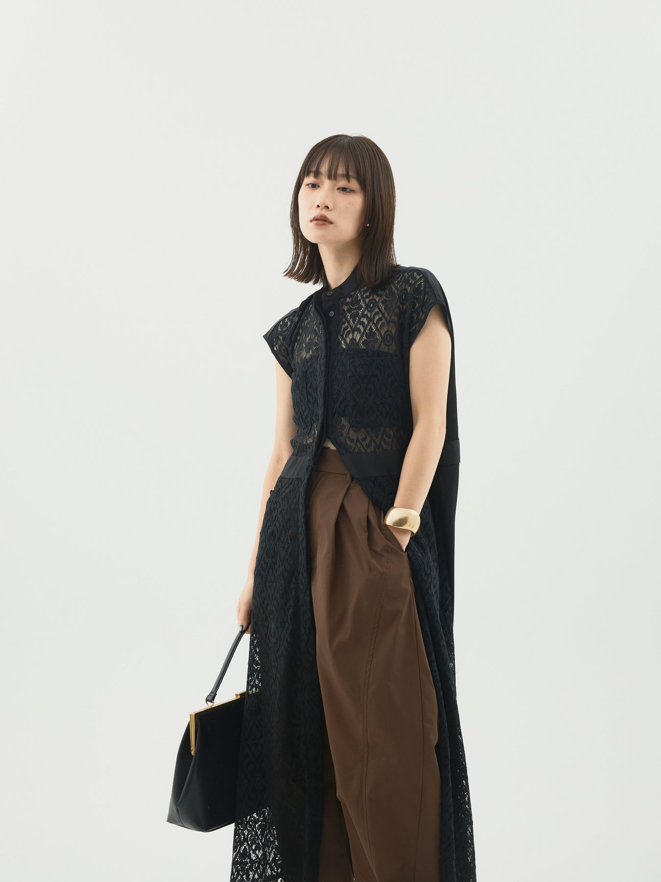 繊細なレースと微光沢のサテン地が組み合わさったロングワンピース。透け感のあるレースで軽やかな雰囲気を演出しつつ、フロントボタンとサテン切替で上品さをプラス。羽織りとしても使える前開き仕様で、コーディネートの幅が広がります。タンクトップやキャミソールとのレイヤードスタイルにも最適です。デイリーからオケージョンまで活躍する1着。
