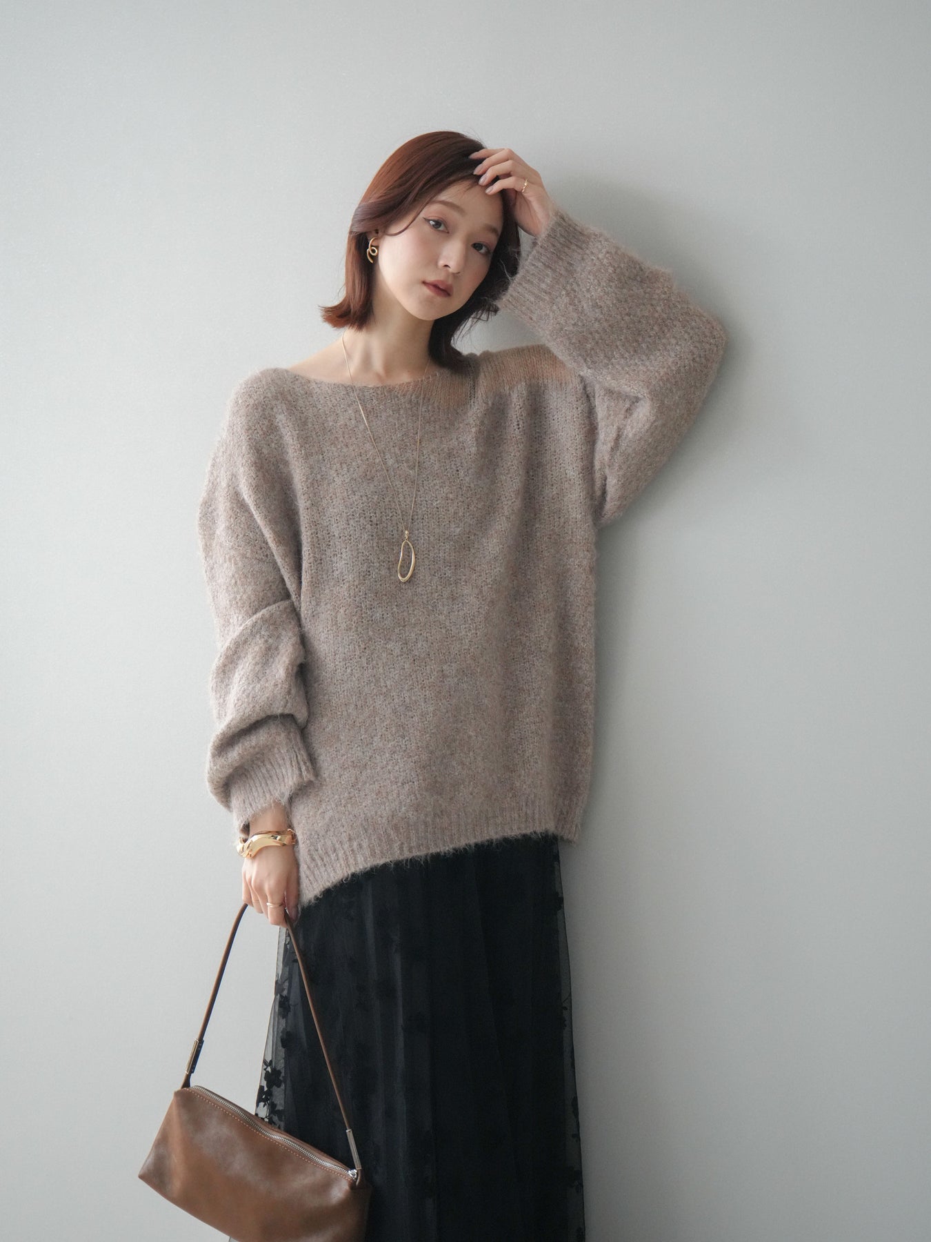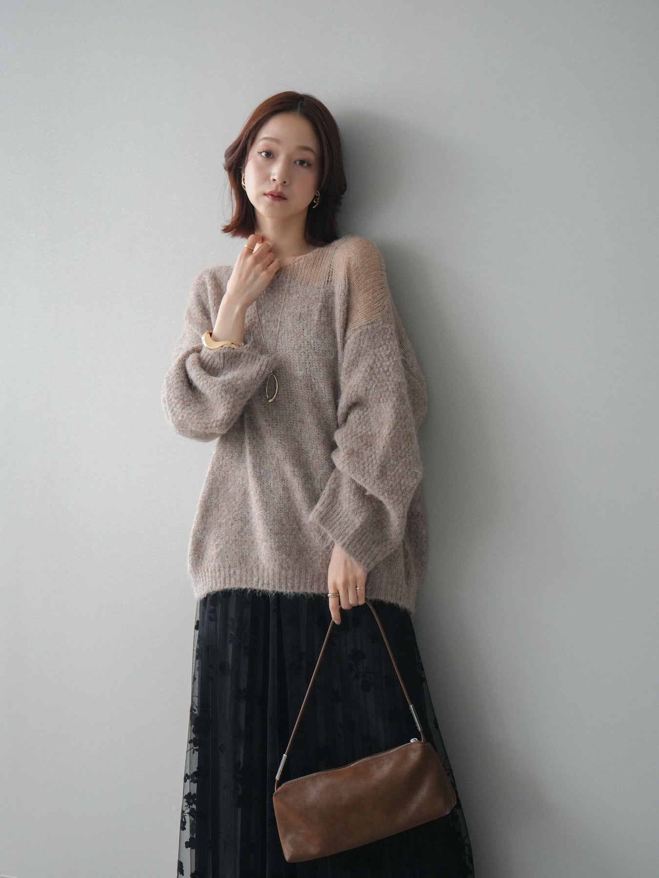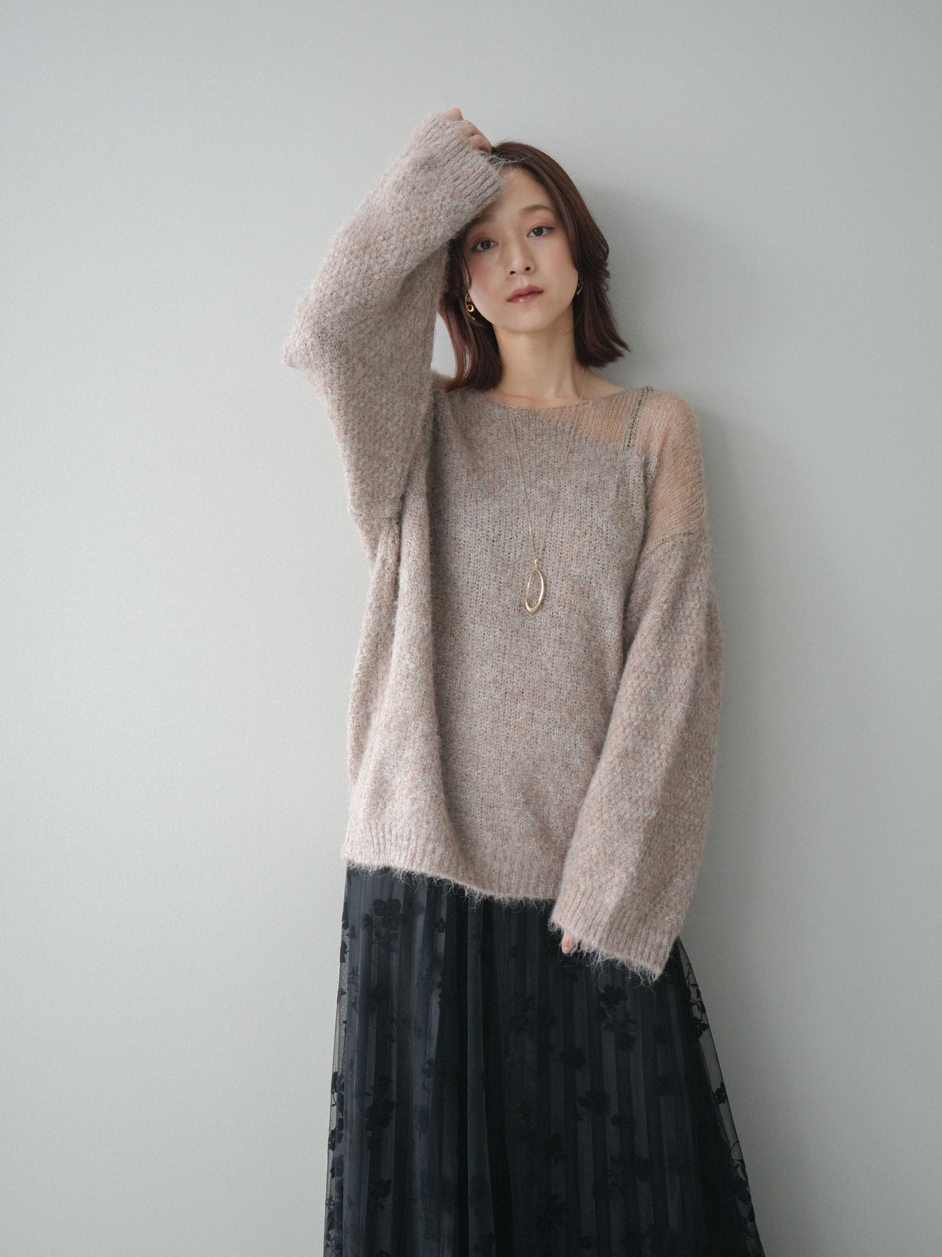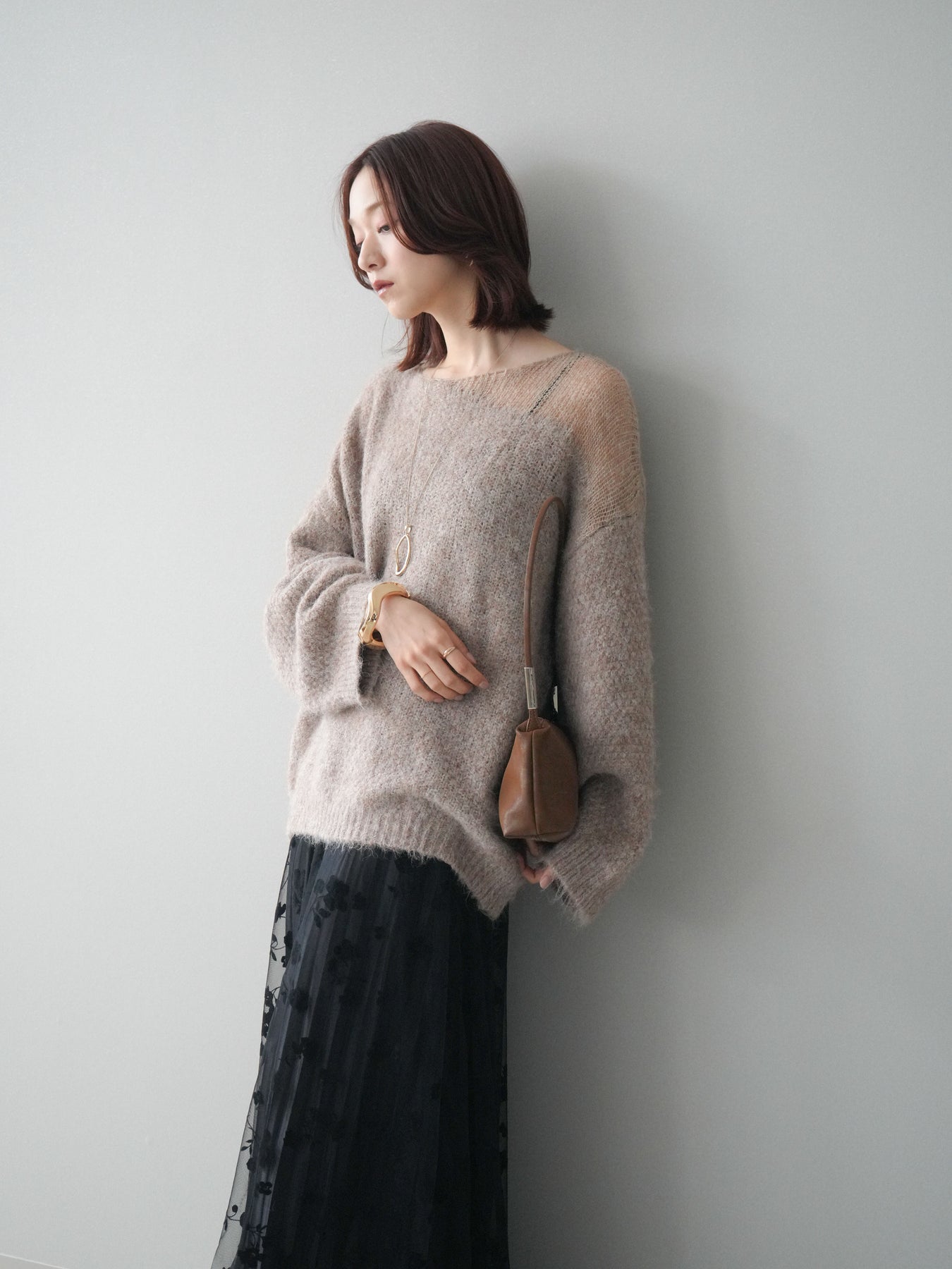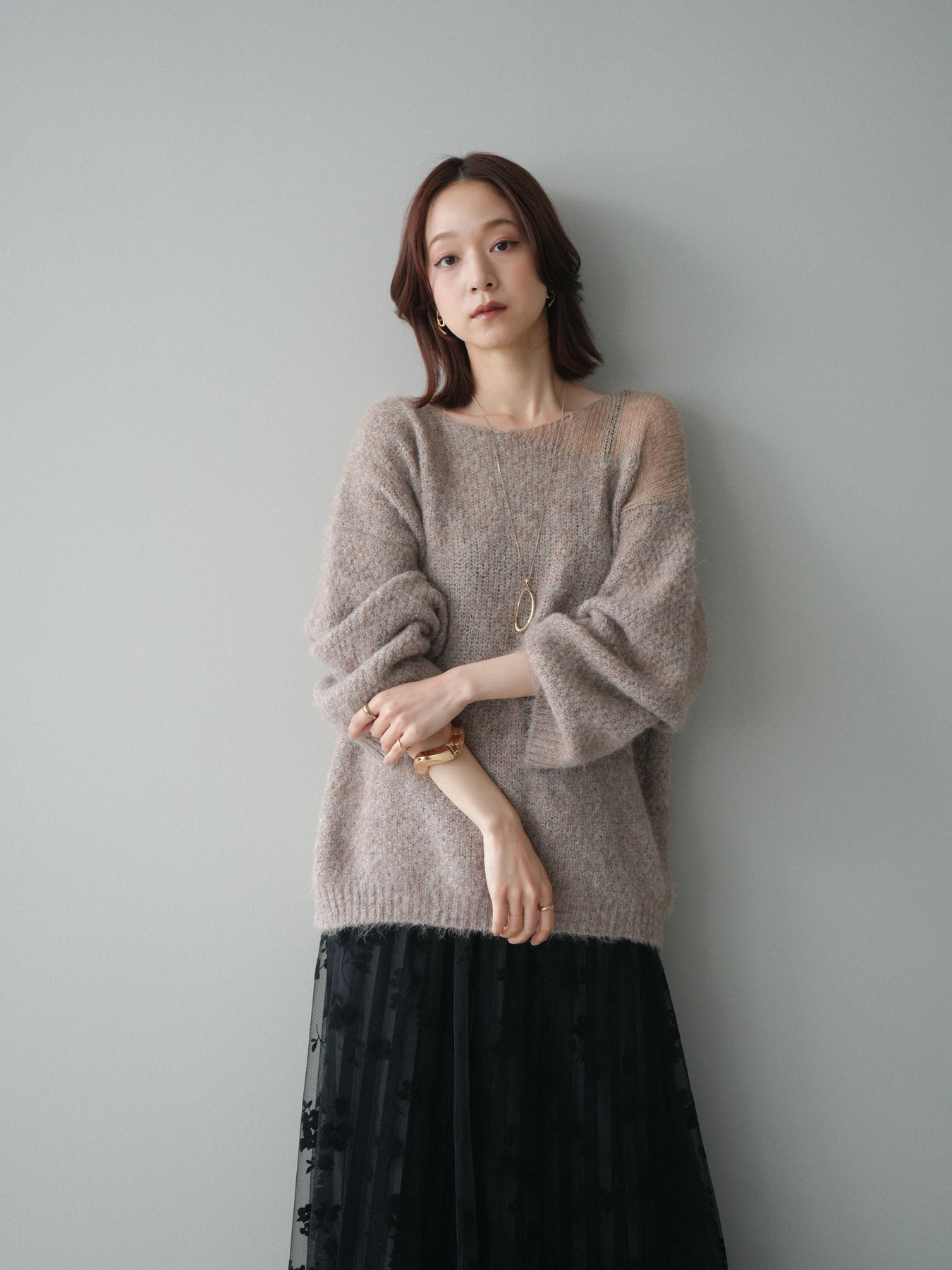 ふんわりとした柔らかなニットに透かし編みデザインをさりげなく組み合わせた、表情豊かなプルオーバー。ほんのりと見える編地の切り替えが抜け感を演出し、シンプルな中にも奥行きのある印象に仕上げています。ゆったりとしたシルエットがリラクシーな着心地を叶えつつ、女性らしいニュアンスをプラス。デニムにもスカートにも合わせやすく、デイリーに着回しやすい万能な一枚です。 ※ボトムス、キャミソール(インナー)以外の商品は一律でインナーは付属していません。