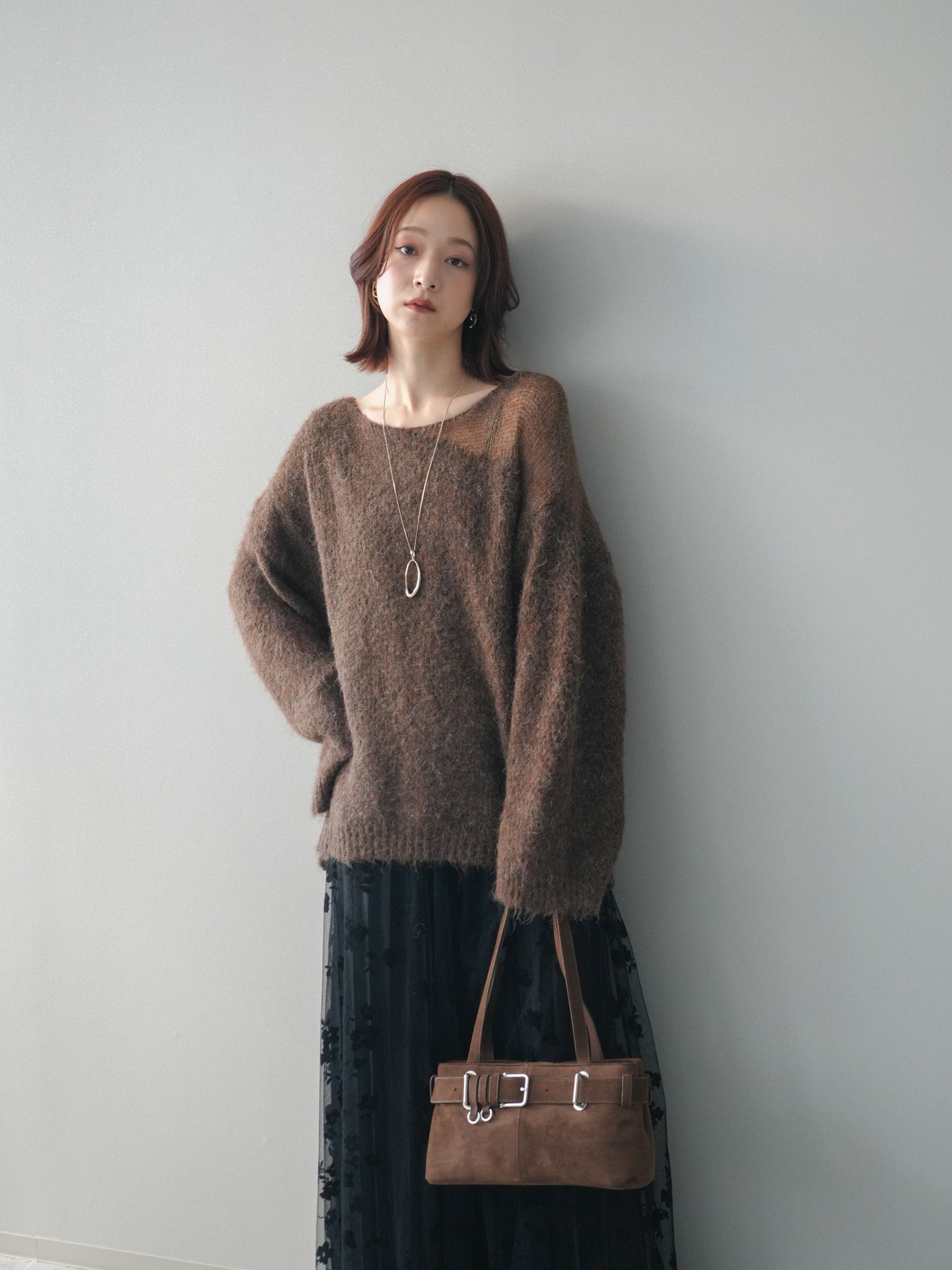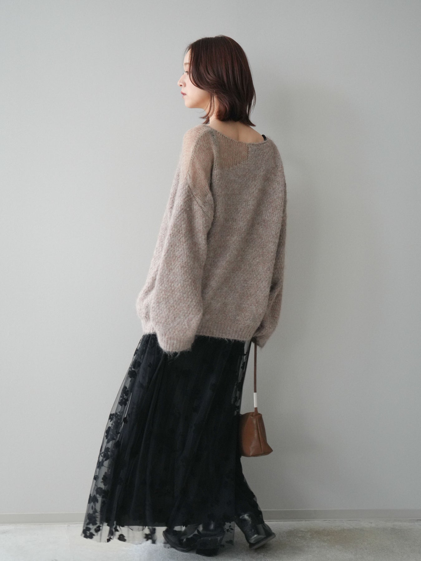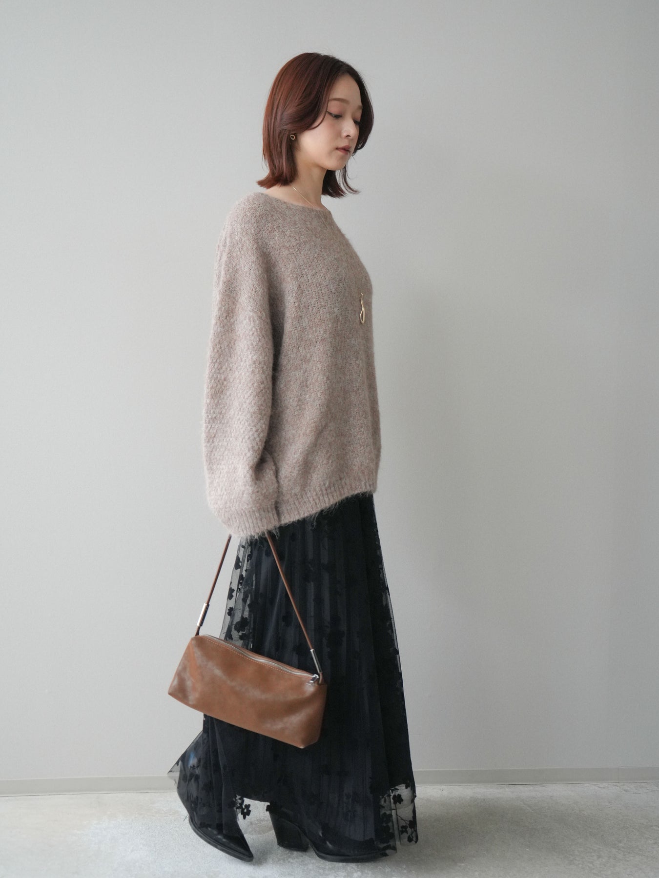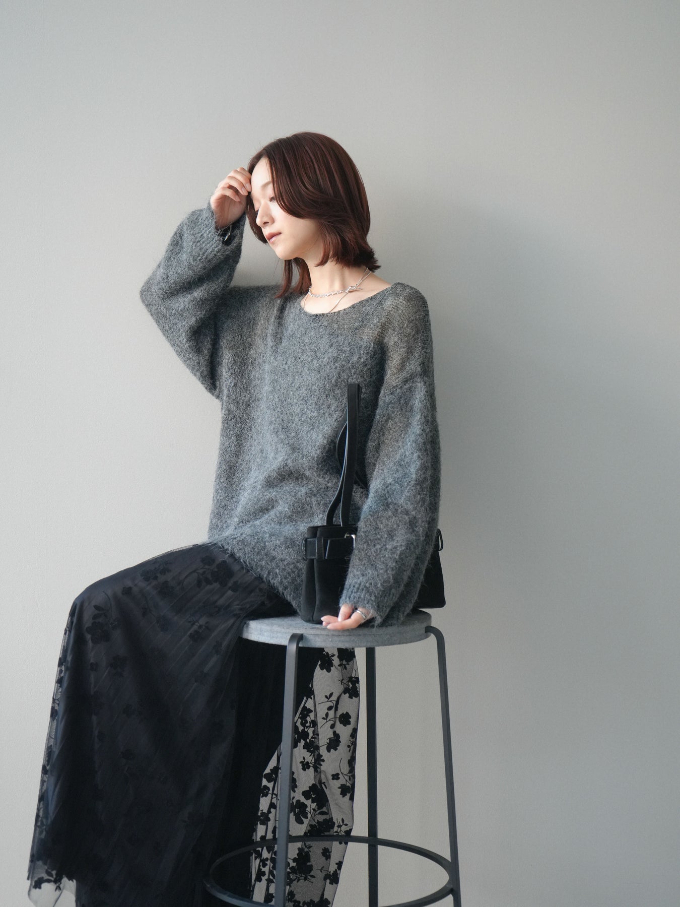 ふんわりとした柔らかなニットに透かし編みデザインをさりげなく組み合わせた、表情豊かなプルオーバー。ほんのりと見える編地の切り替えが抜け感を演出し、シンプルな中にも奥行きのある印象に仕上げています。ゆったりとしたシルエットがリラクシーな着心地を叶えつつ、女性らしいニュアンスをプラス。デニムにもスカートにも合わせやすく、デイリーに着回しやすい万能な一枚です。 ※ボトムス、キャミソール(インナー)以外の商品は一律でインナーは付属していません。