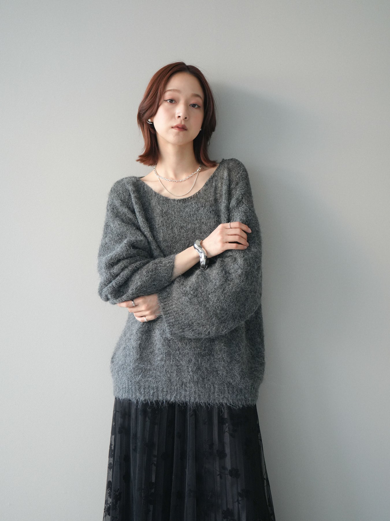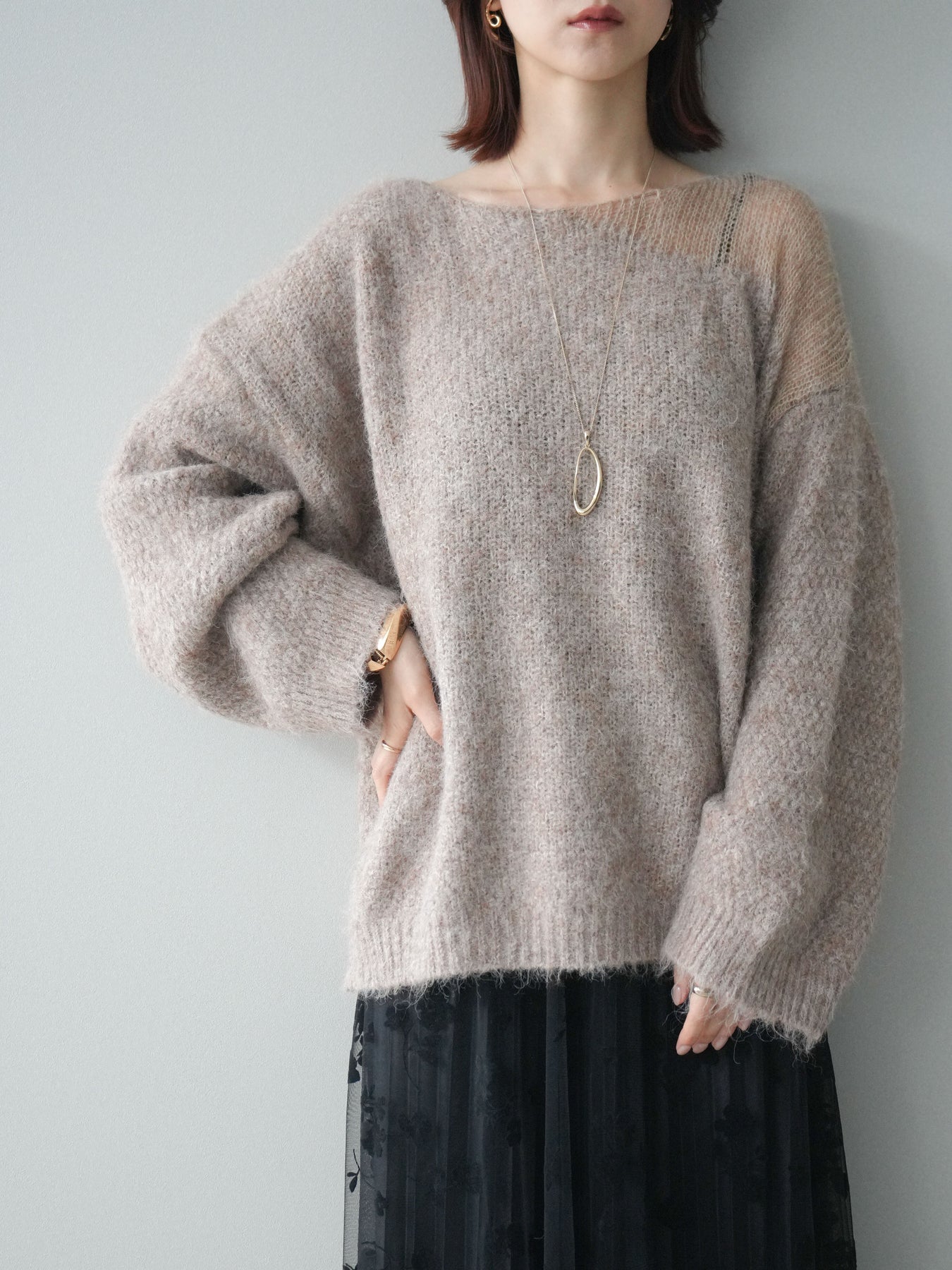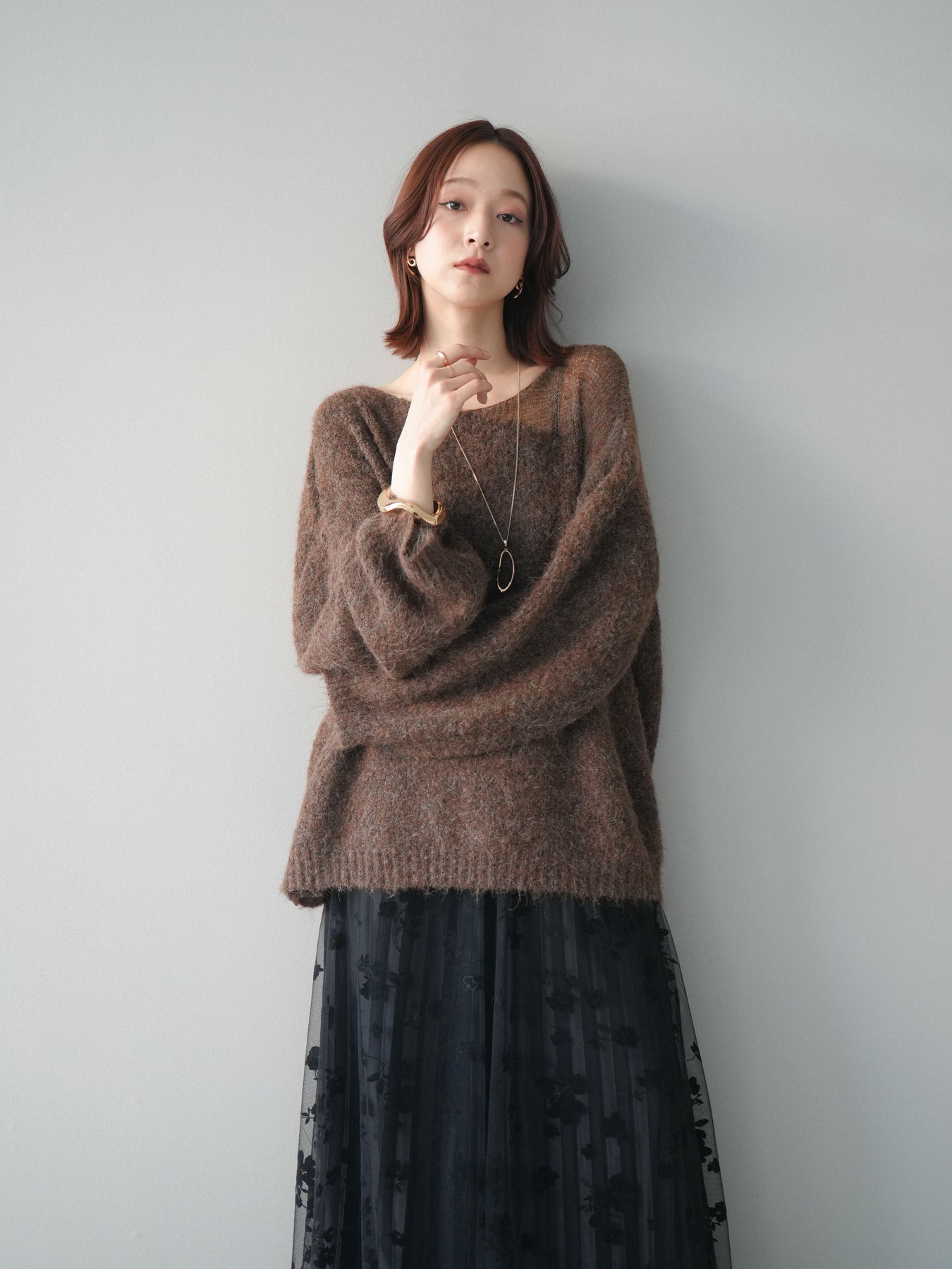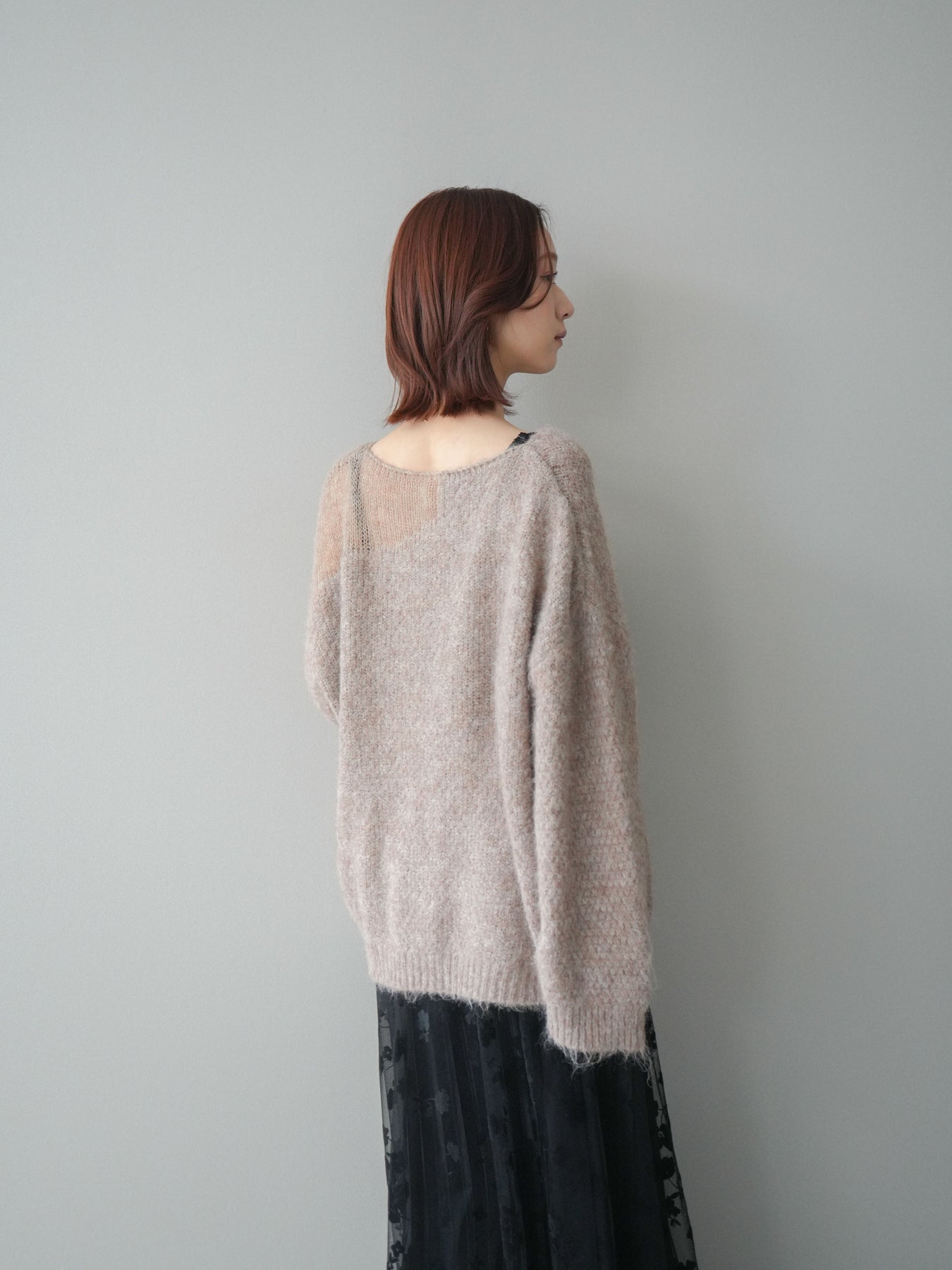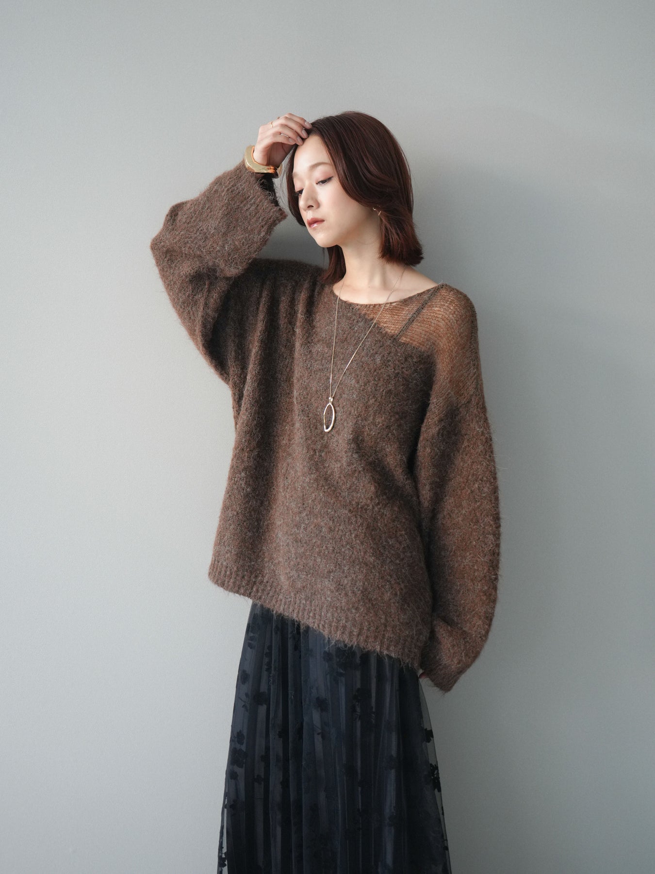 ふんわりとした柔らかなニットに透かし編みデザインをさりげなく組み合わせた、表情豊かなプルオーバー。ほんのりと見える編地の切り替えが抜け感を演出し、シンプルな中にも奥行きのある印象に仕上げています。ゆったりとしたシルエットがリラクシーな着心地を叶えつつ、女性らしいニュアンスをプラス。デニムにもスカートにも合わせやすく、デイリーに着回しやすい万能な一枚です。 ※ボトムス、キャミソール(インナー)以外の商品は一律でインナーは付属していません。