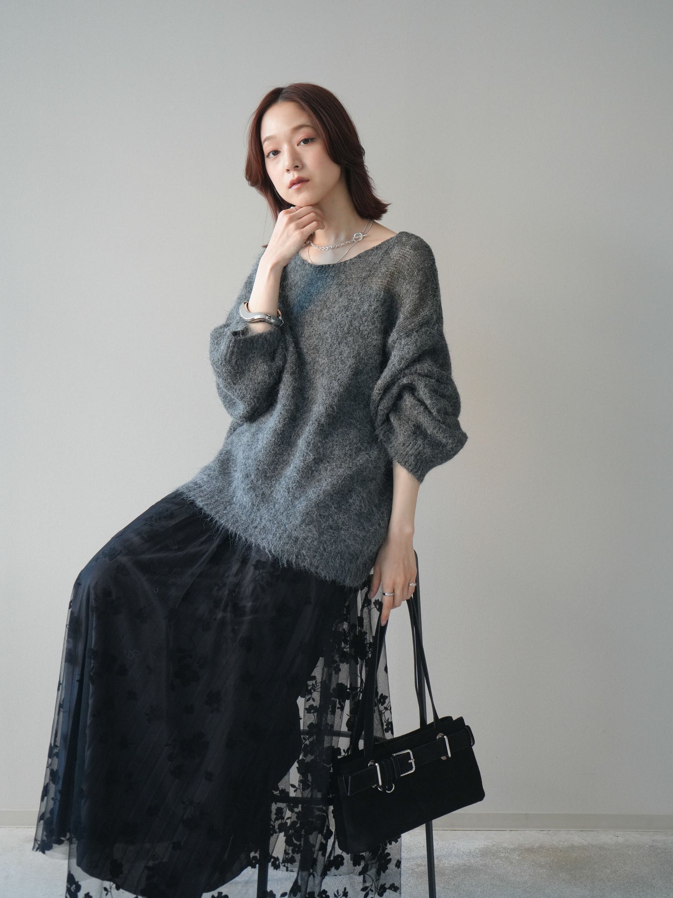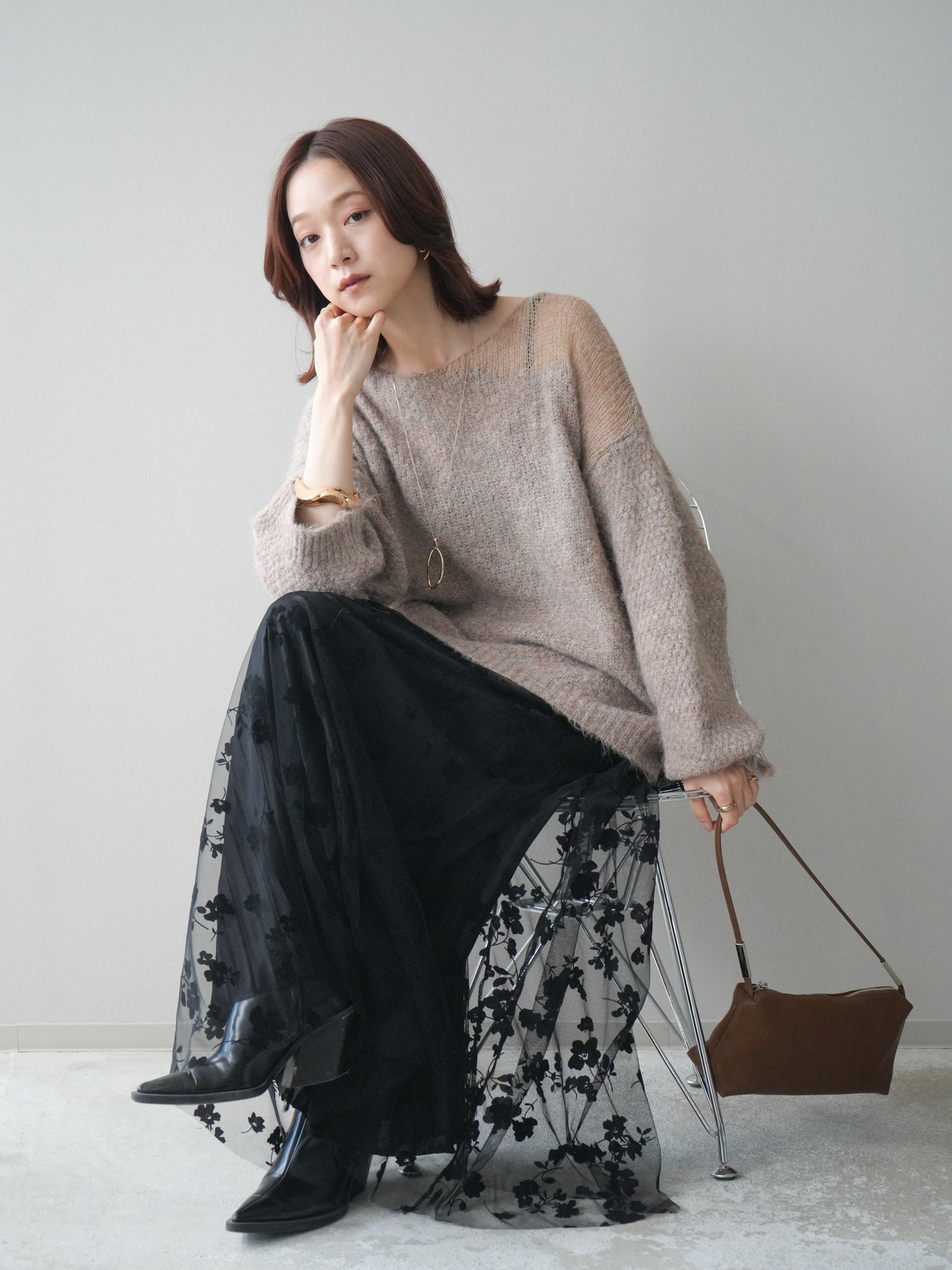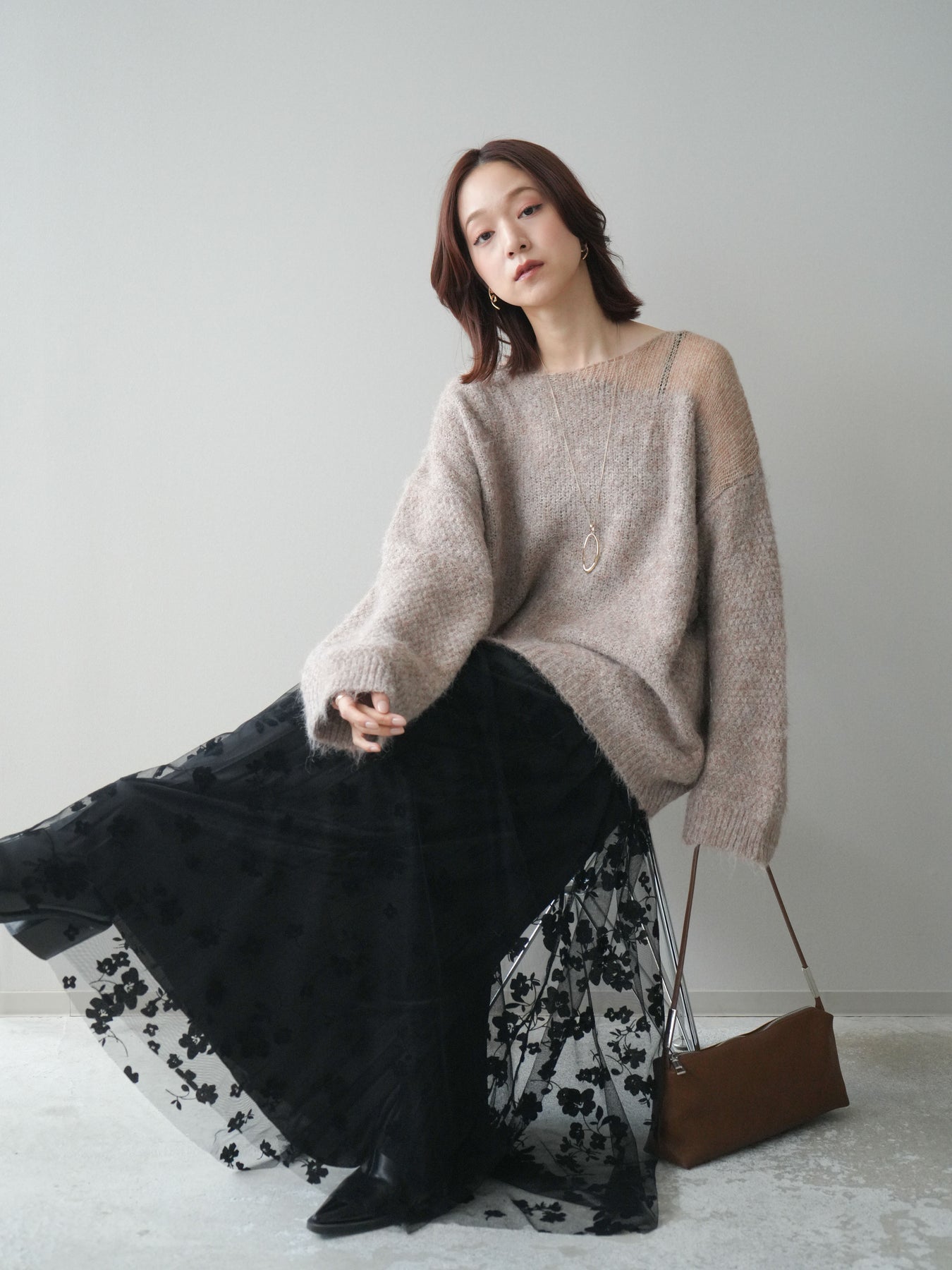 [SET]透かしデザインニットプルオーバー+フラワーフロッキーチュールプリーツスカート(2set)