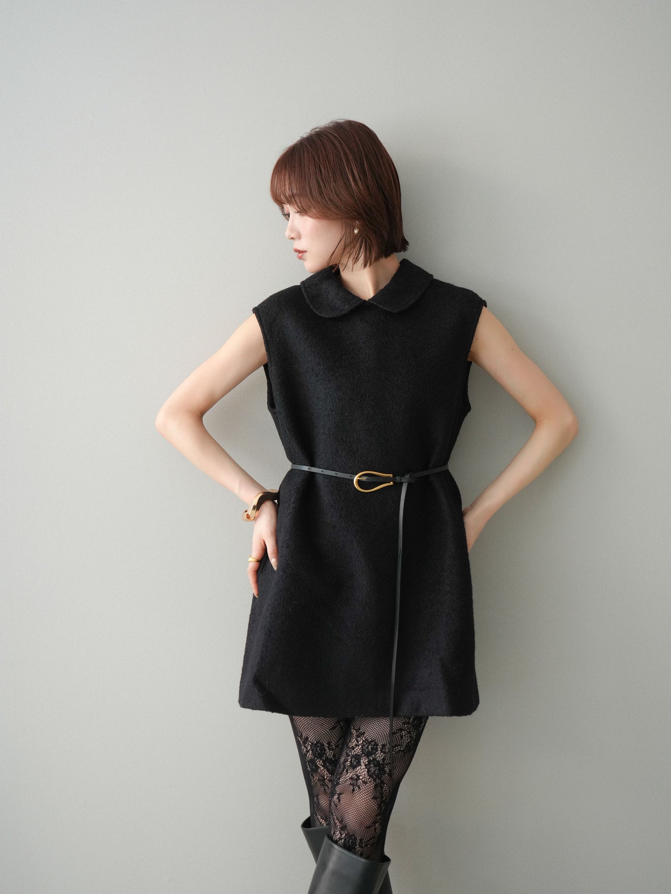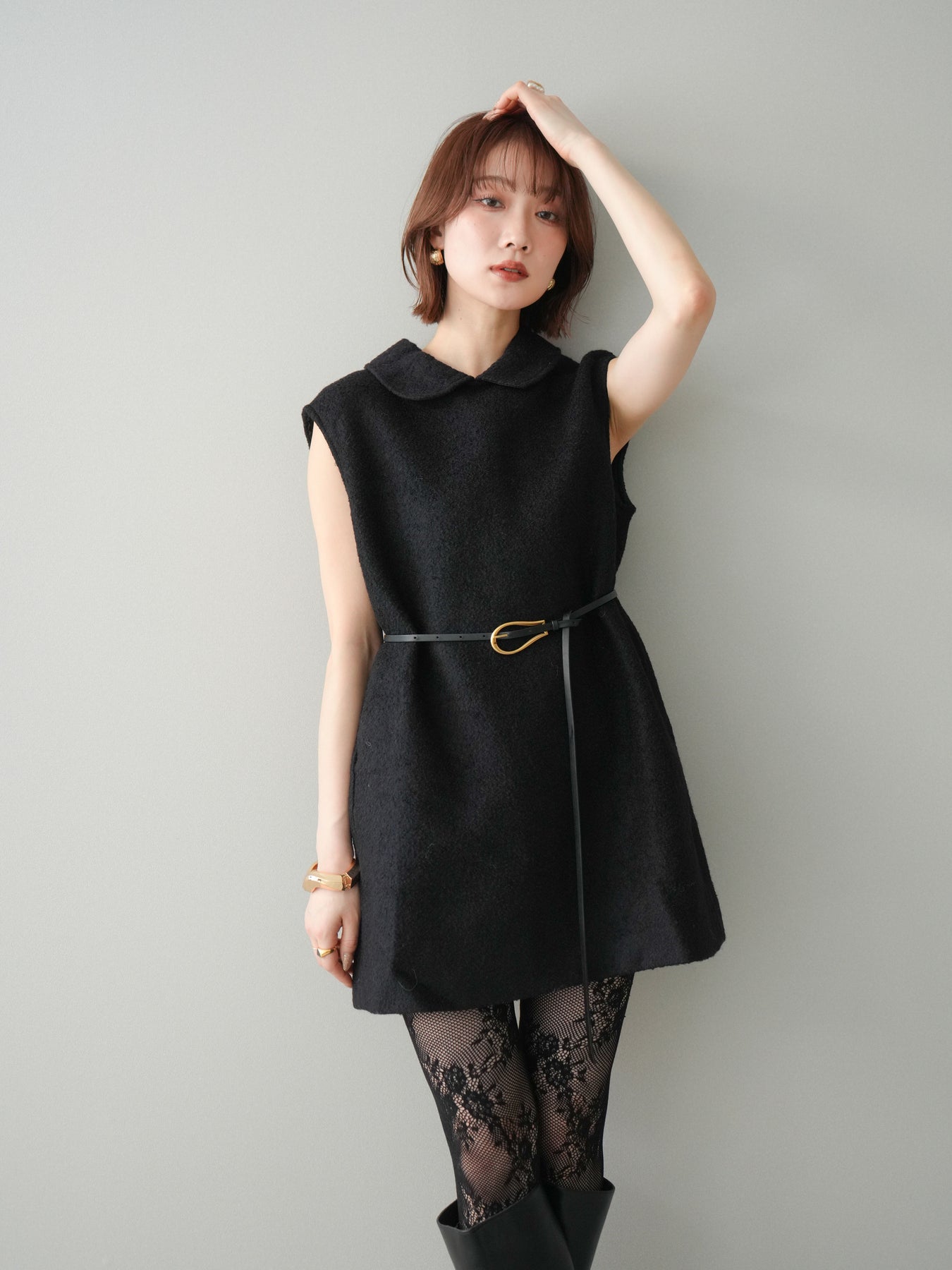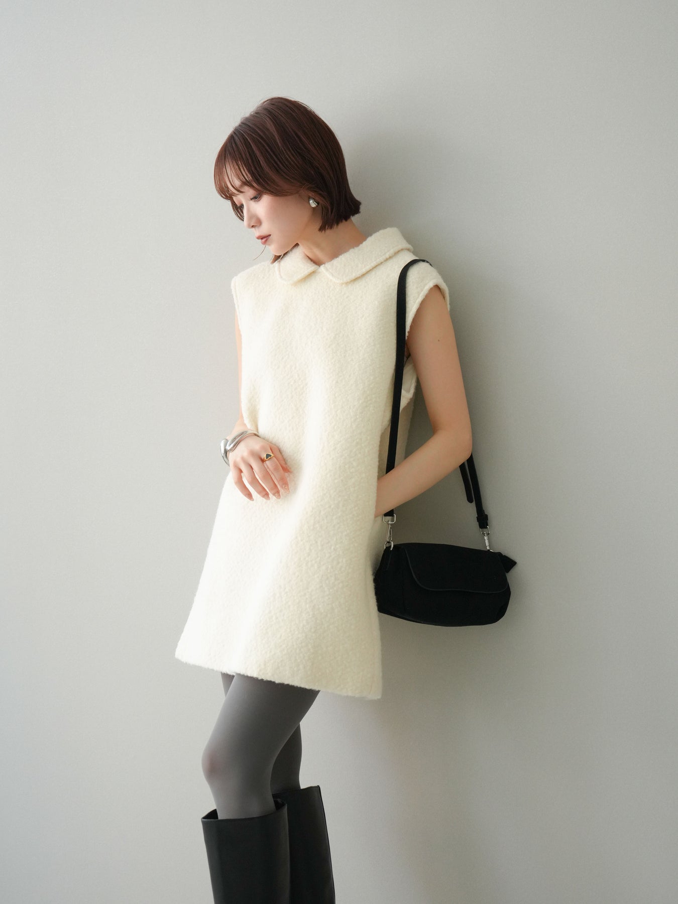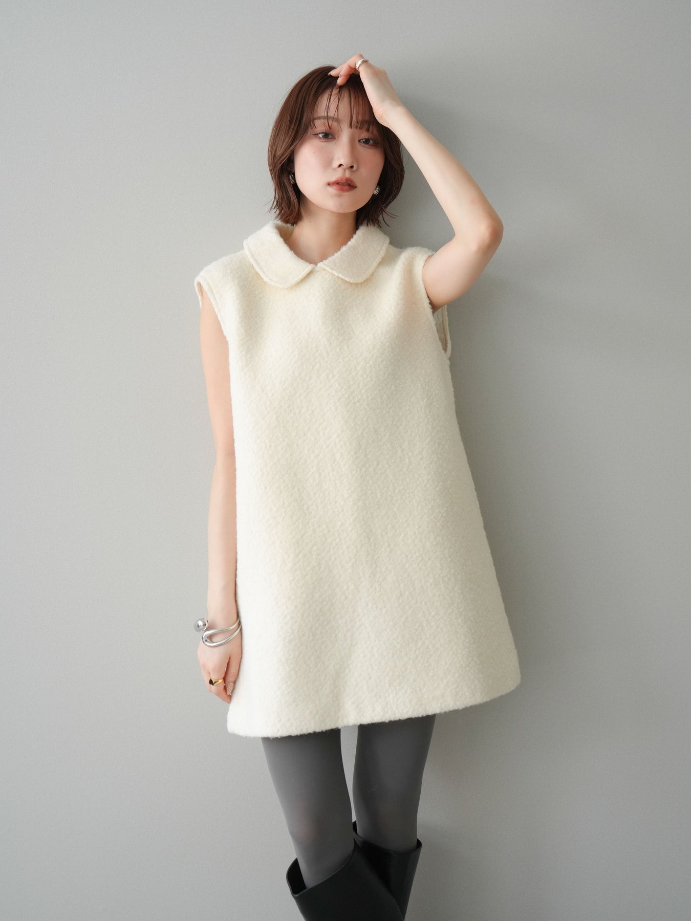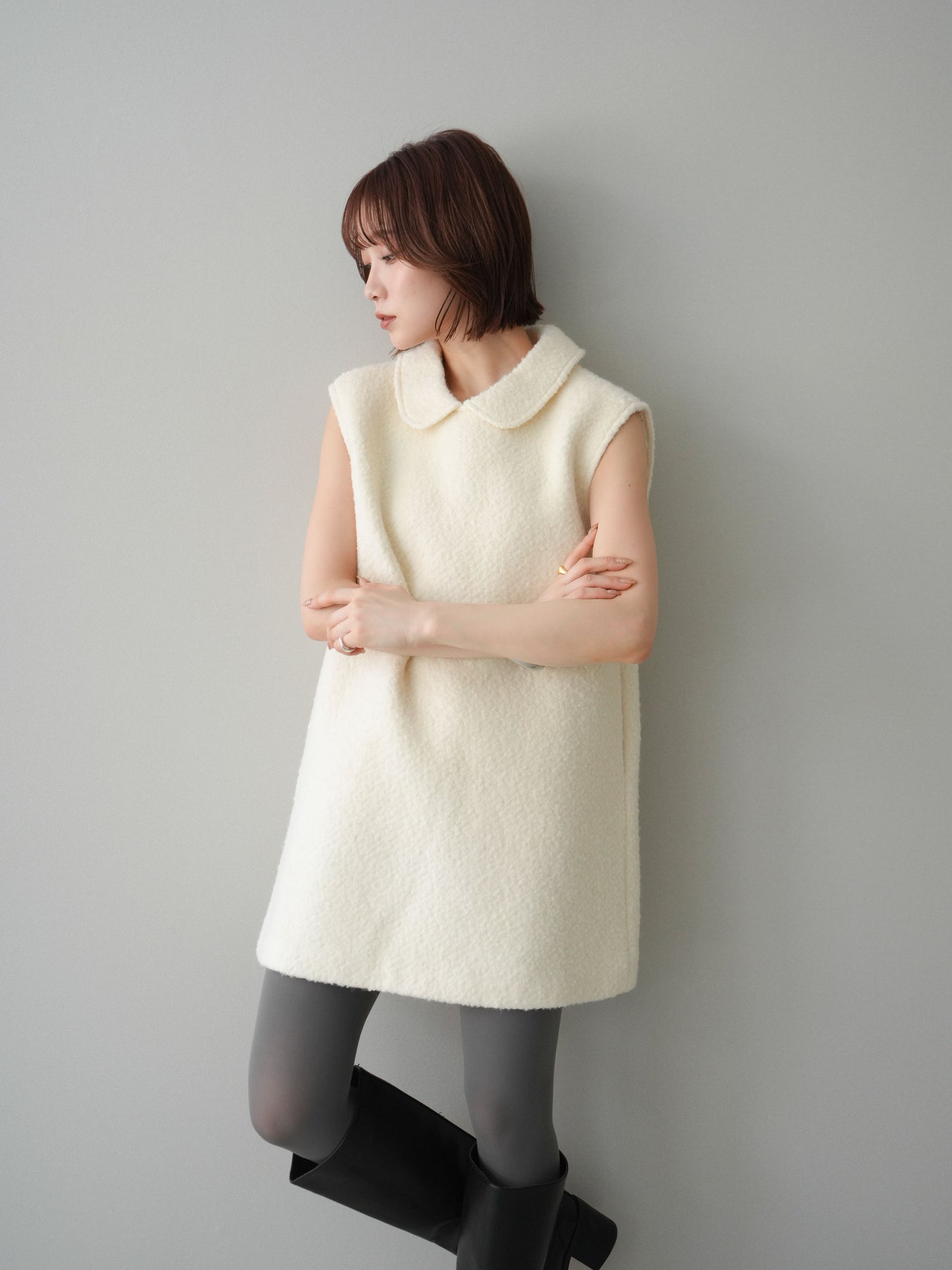 表情のあるブークレ素材が上品な印象を与える、襟付きデザインのミニワンピース。 柔らかな凹凸感のある生地が立体感を生み、シンプルながらも存在感のある一着に仕上がっています。 コンパクトな襟がきちんと感をプラスし、レイヤード次第で幅広いスタイリングが楽しめるデザイン。 程よくゆとりのあるシルエットで、体のラインを拾いすぎず、バランス良く着こなせます。 一枚ではもちろん、ボトムと合わせたレイヤードスタイルもおすすめのアイテムです。 ※ボトムス、キャミソール(インナー)以外の商品は一律でインナーは付属していません。