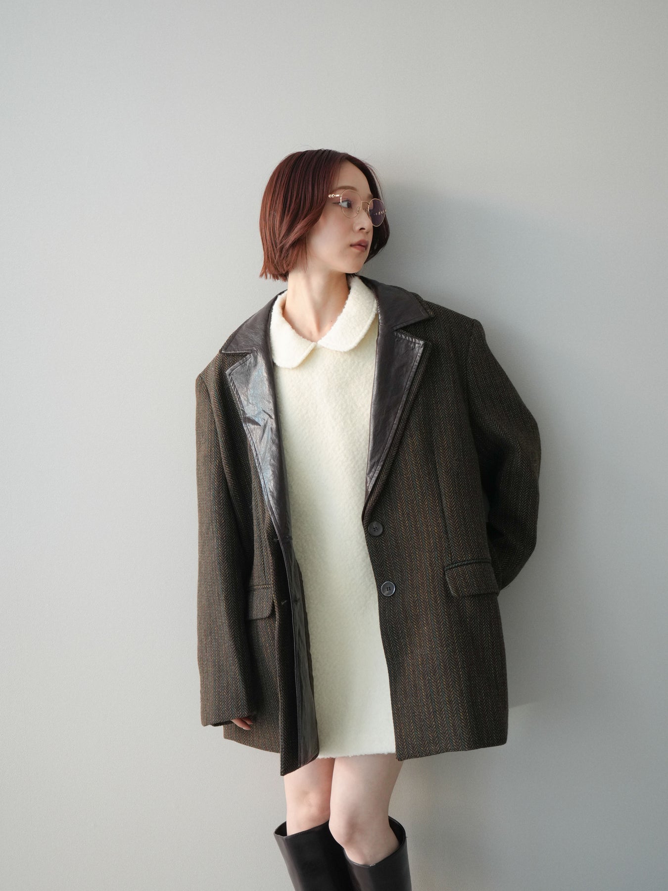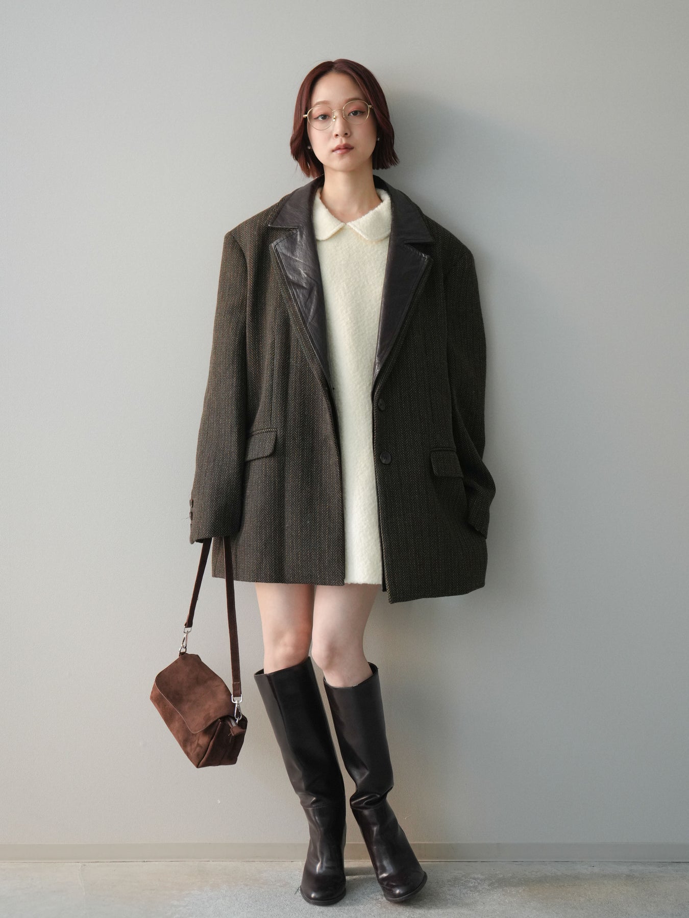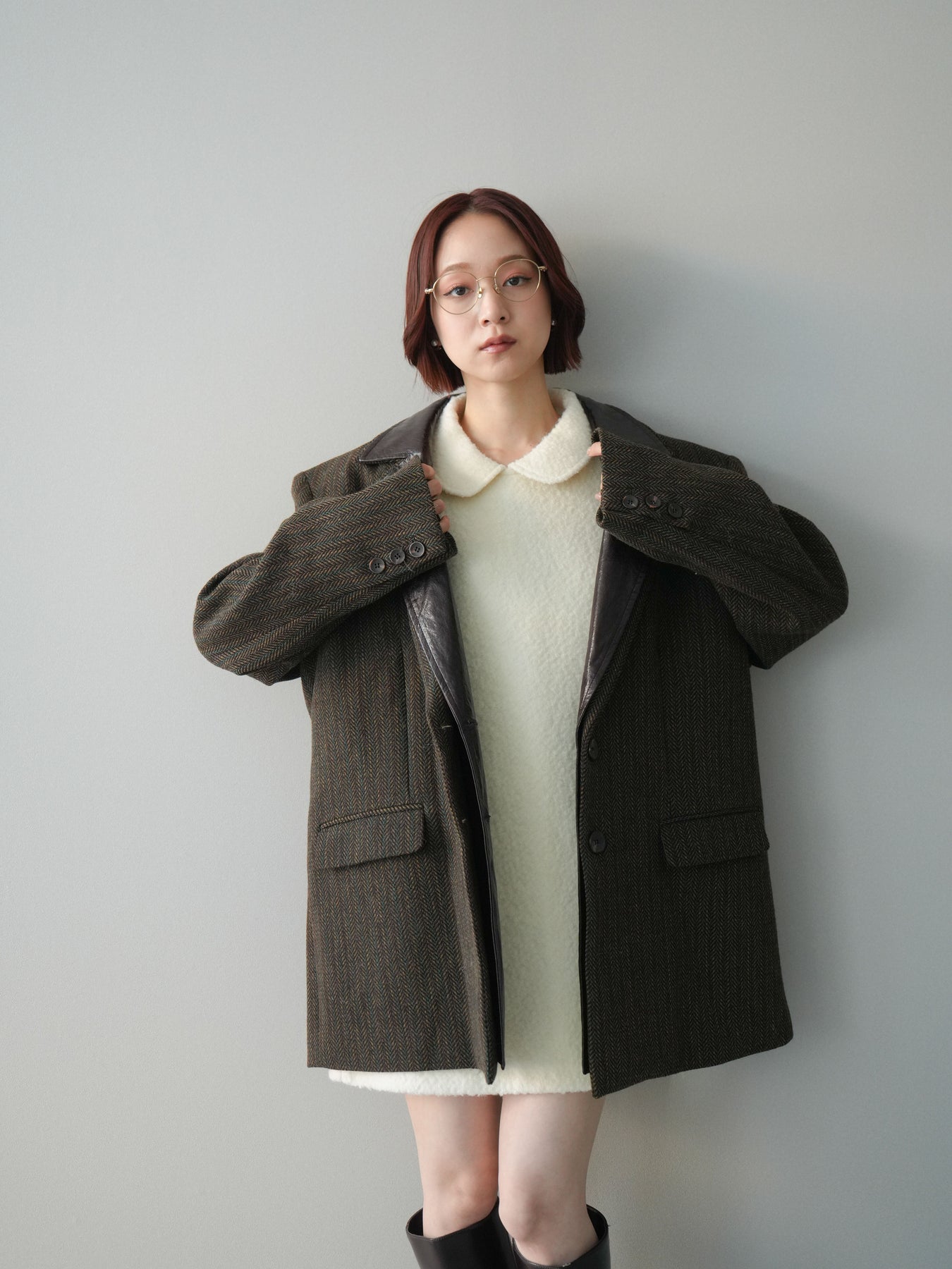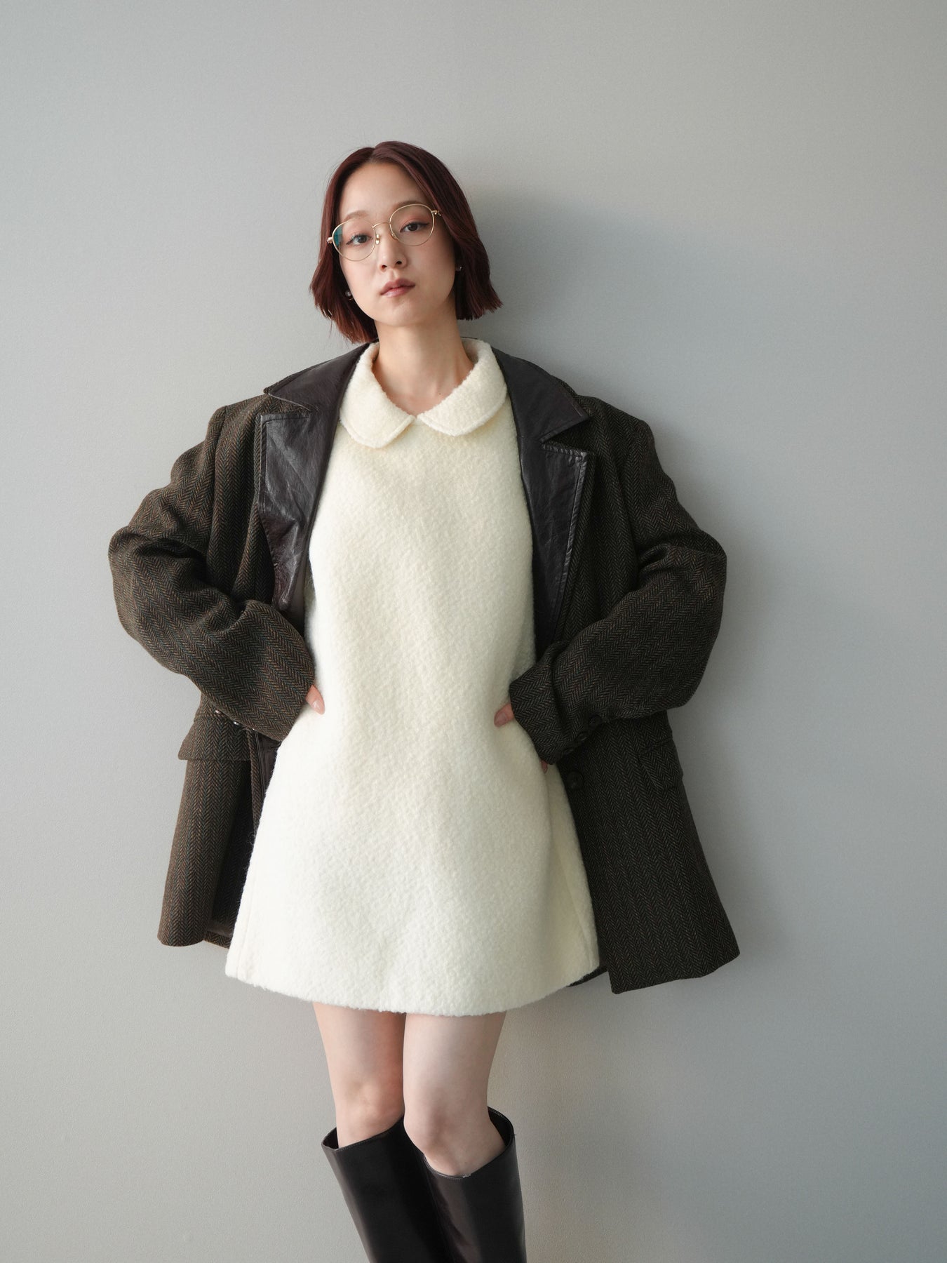 [SET]襟付きブークレミニワンピース+レイヤードデザインツイードテーラードジャケット(2set)