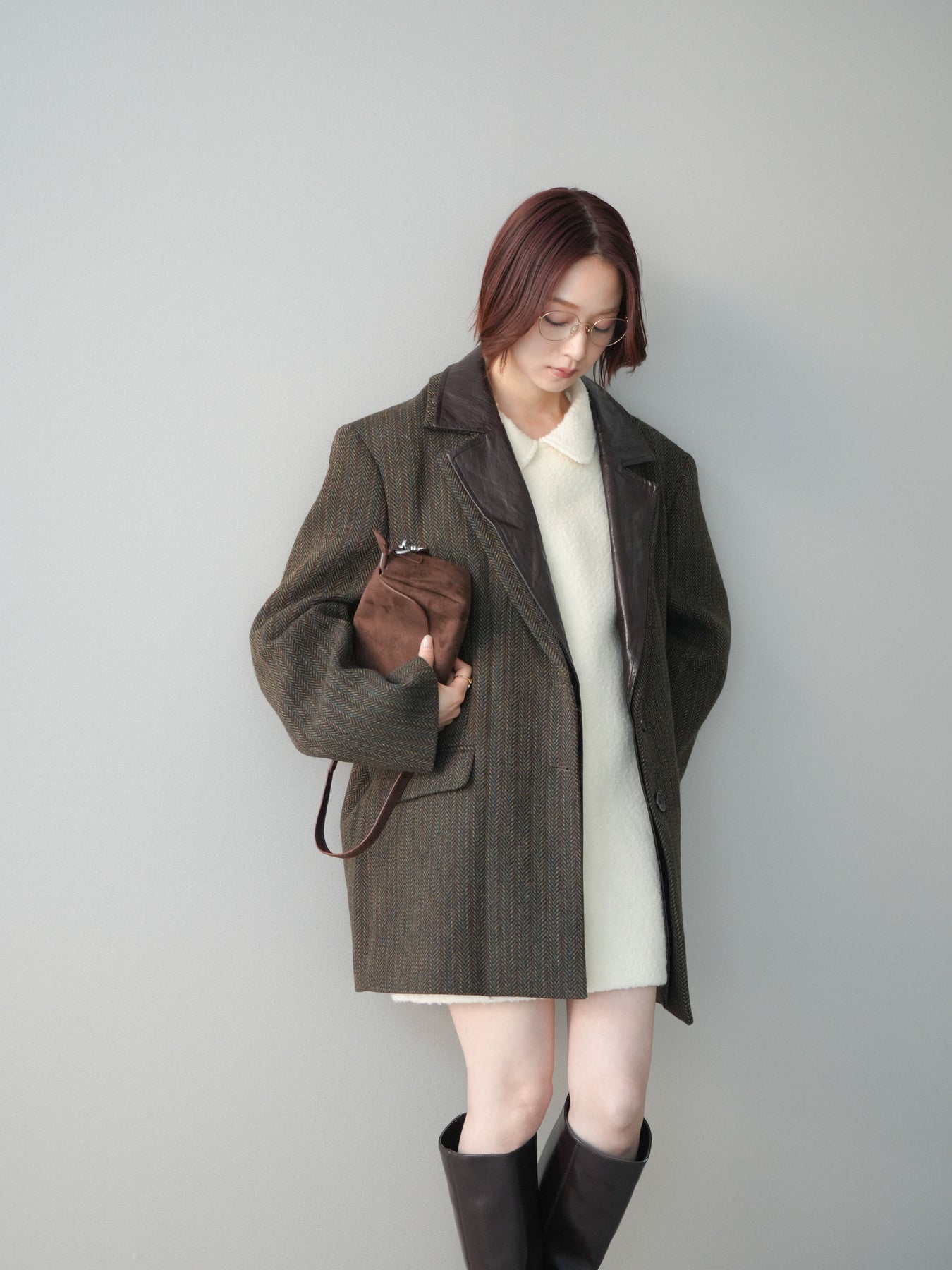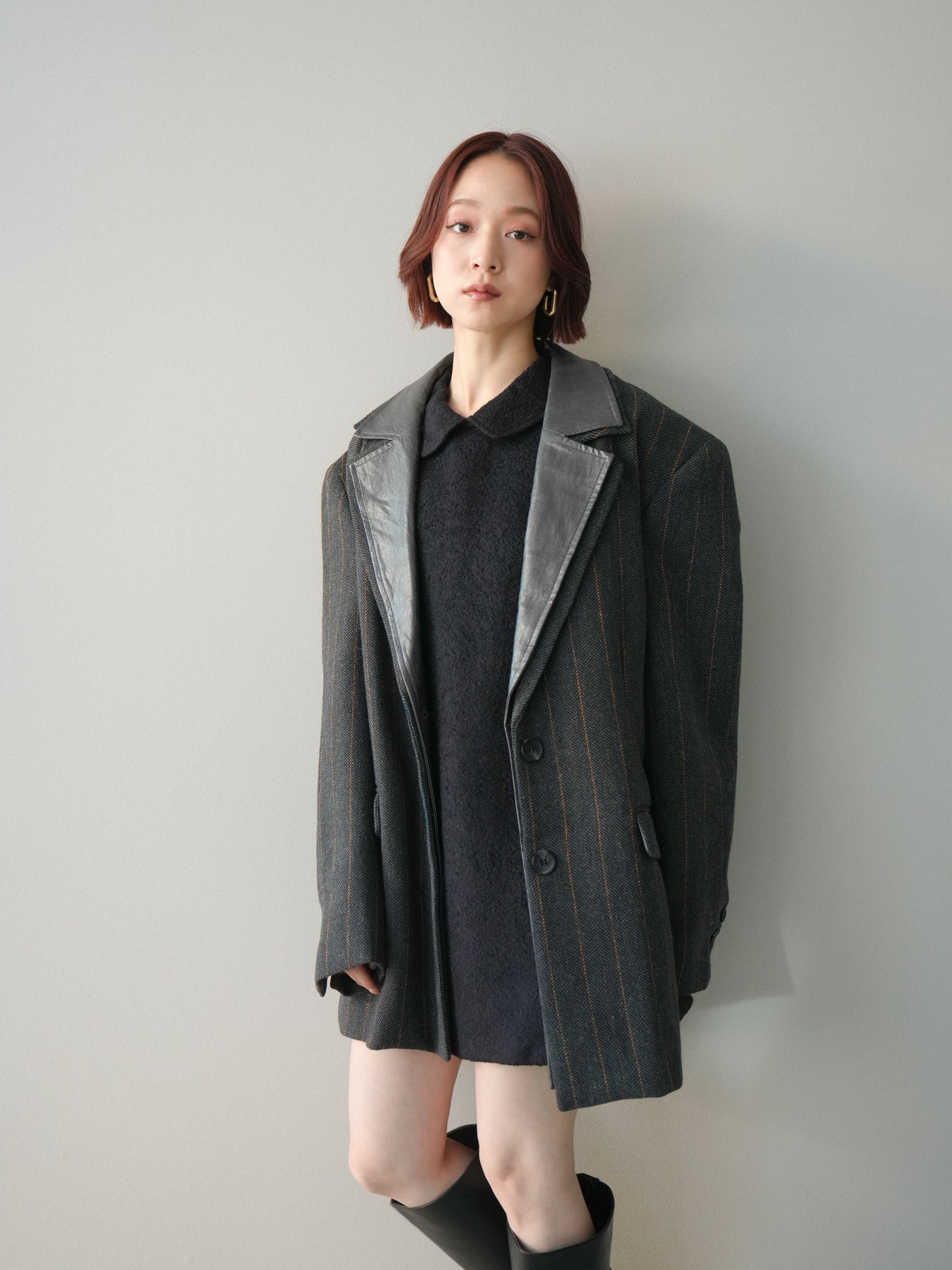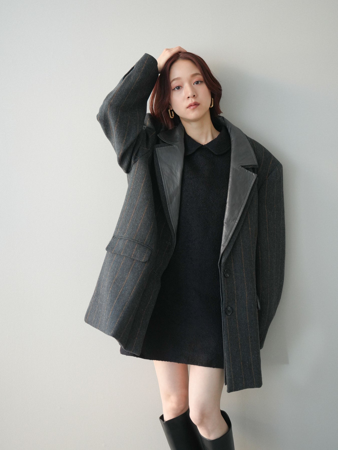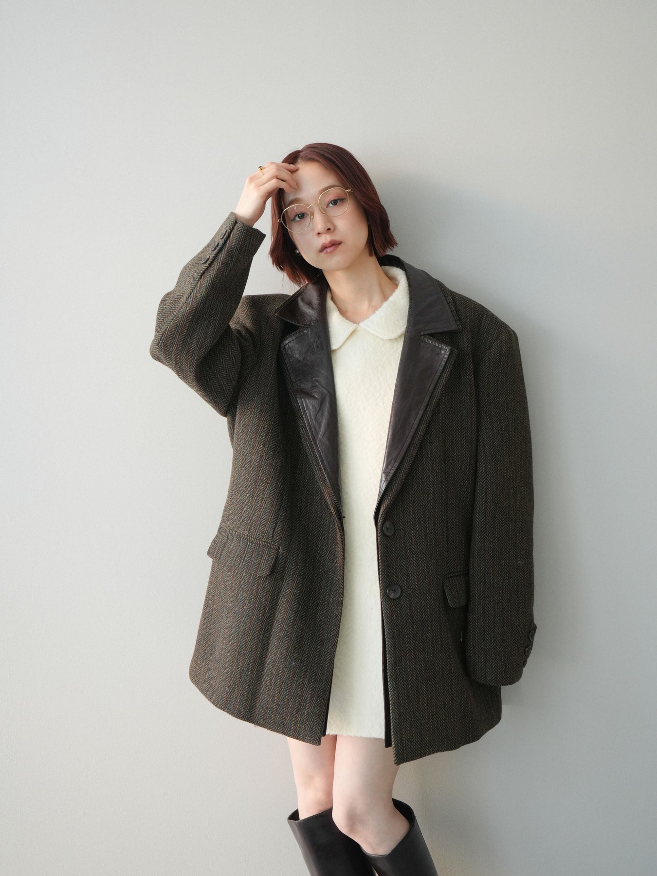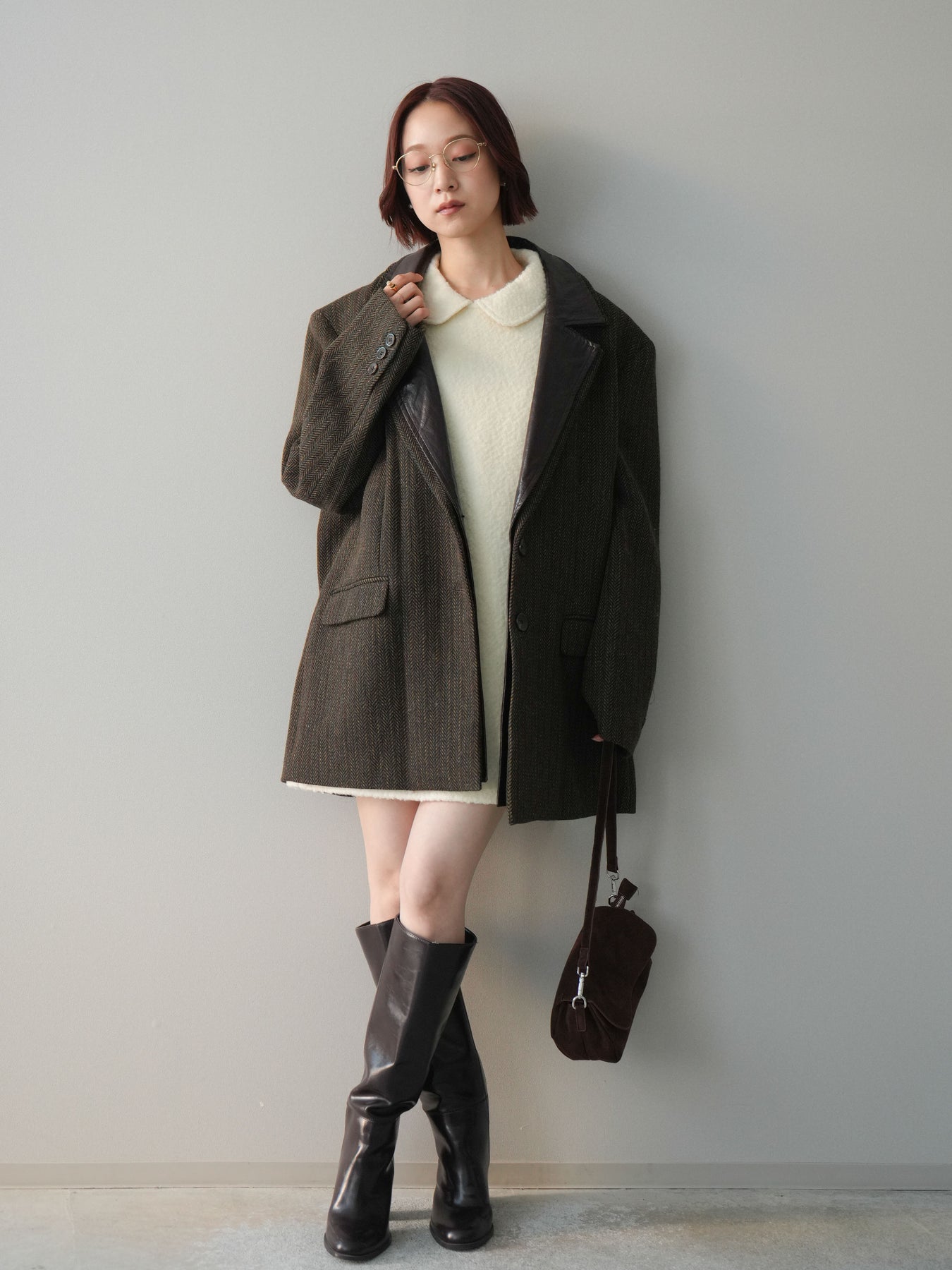[SET]襟付きブークレミニワンピース+レイヤードデザインツイードテーラードジャケット(2set)