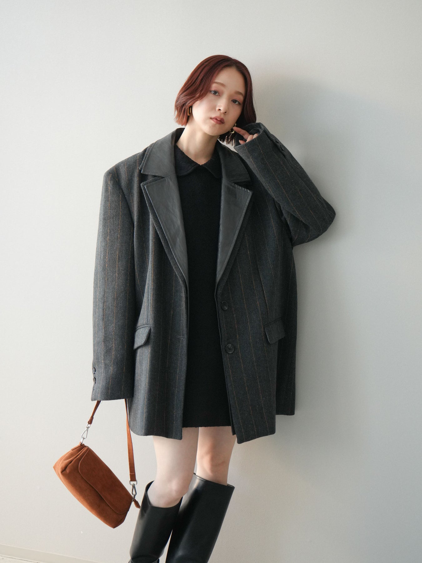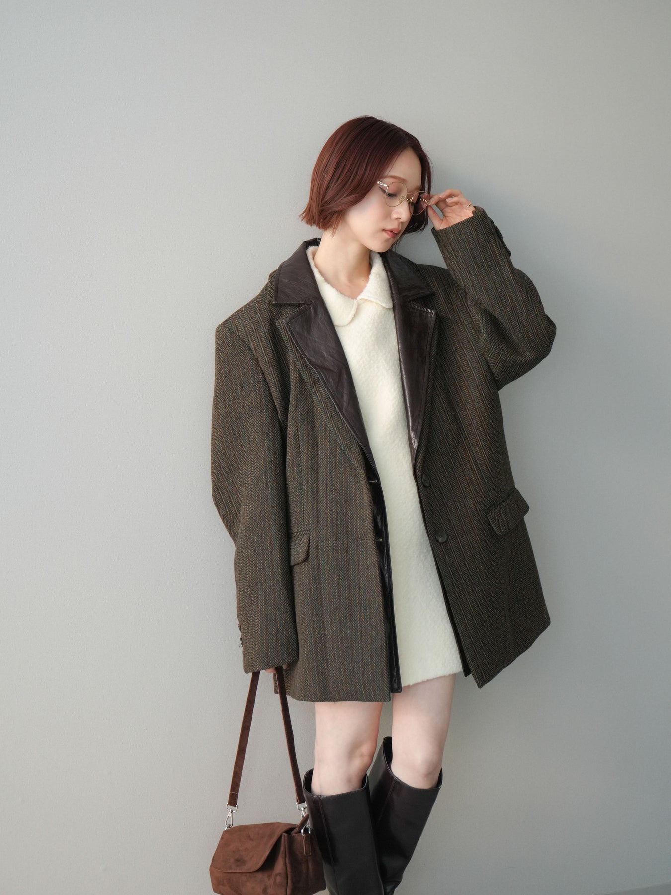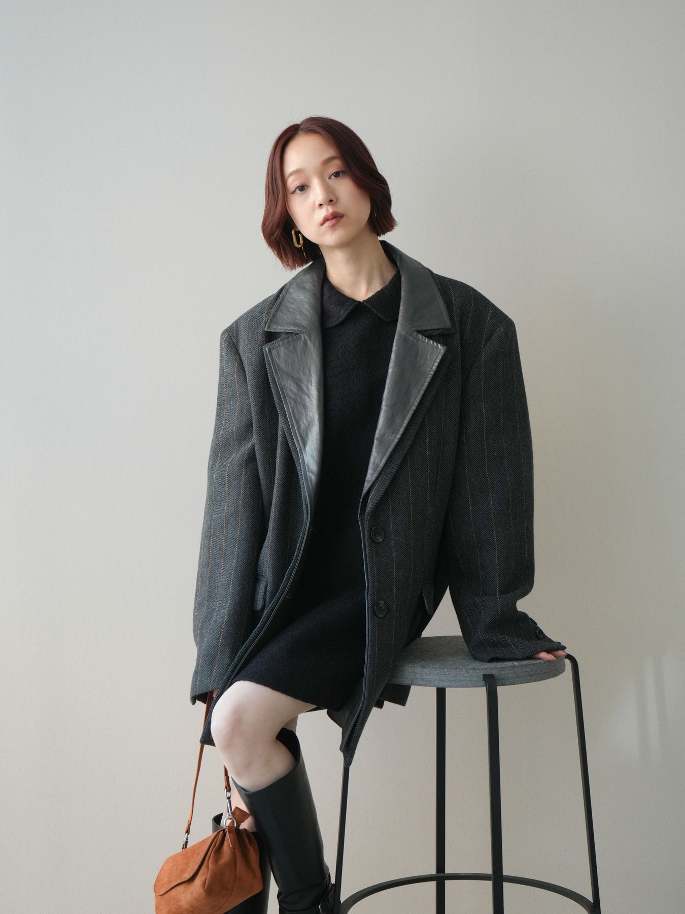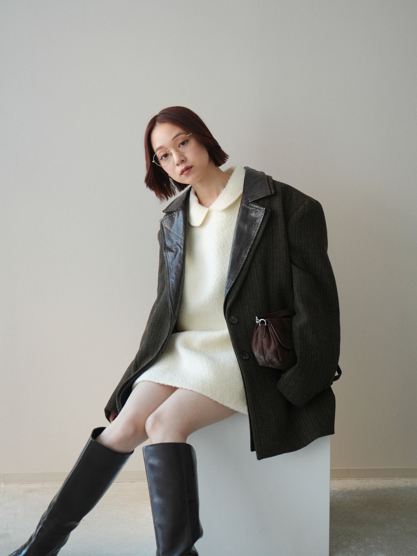 [SET]襟付きブークレミニワンピース+レイヤードデザインツイードテーラードジャケット(2set)