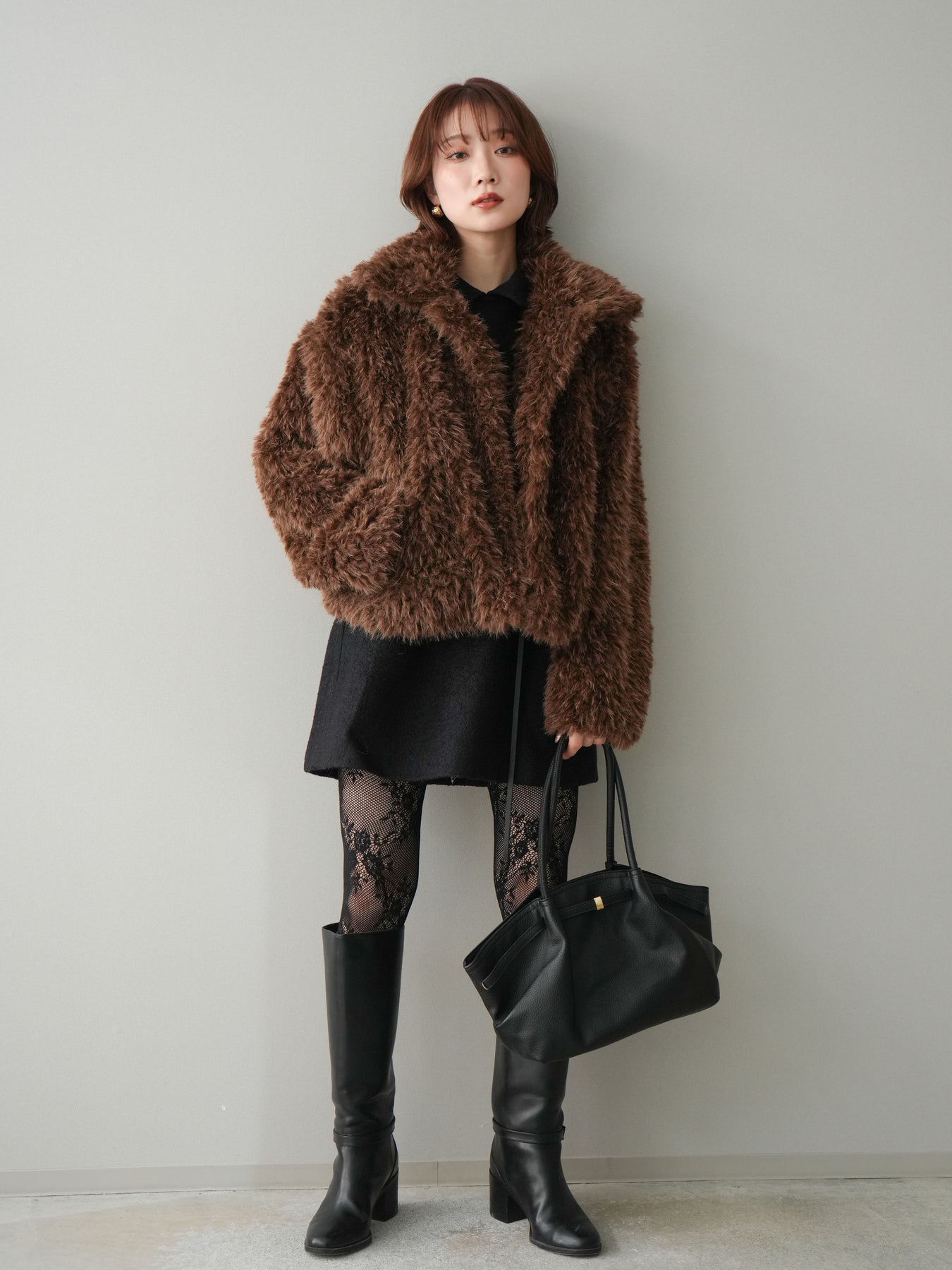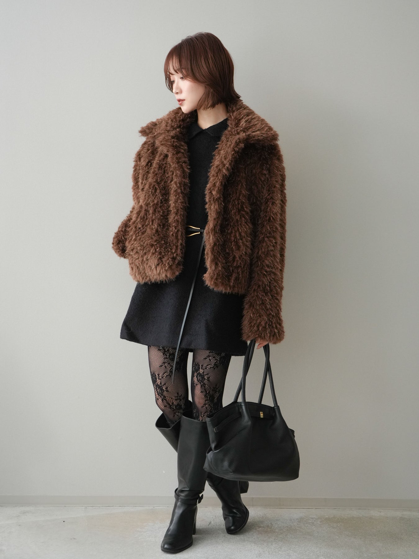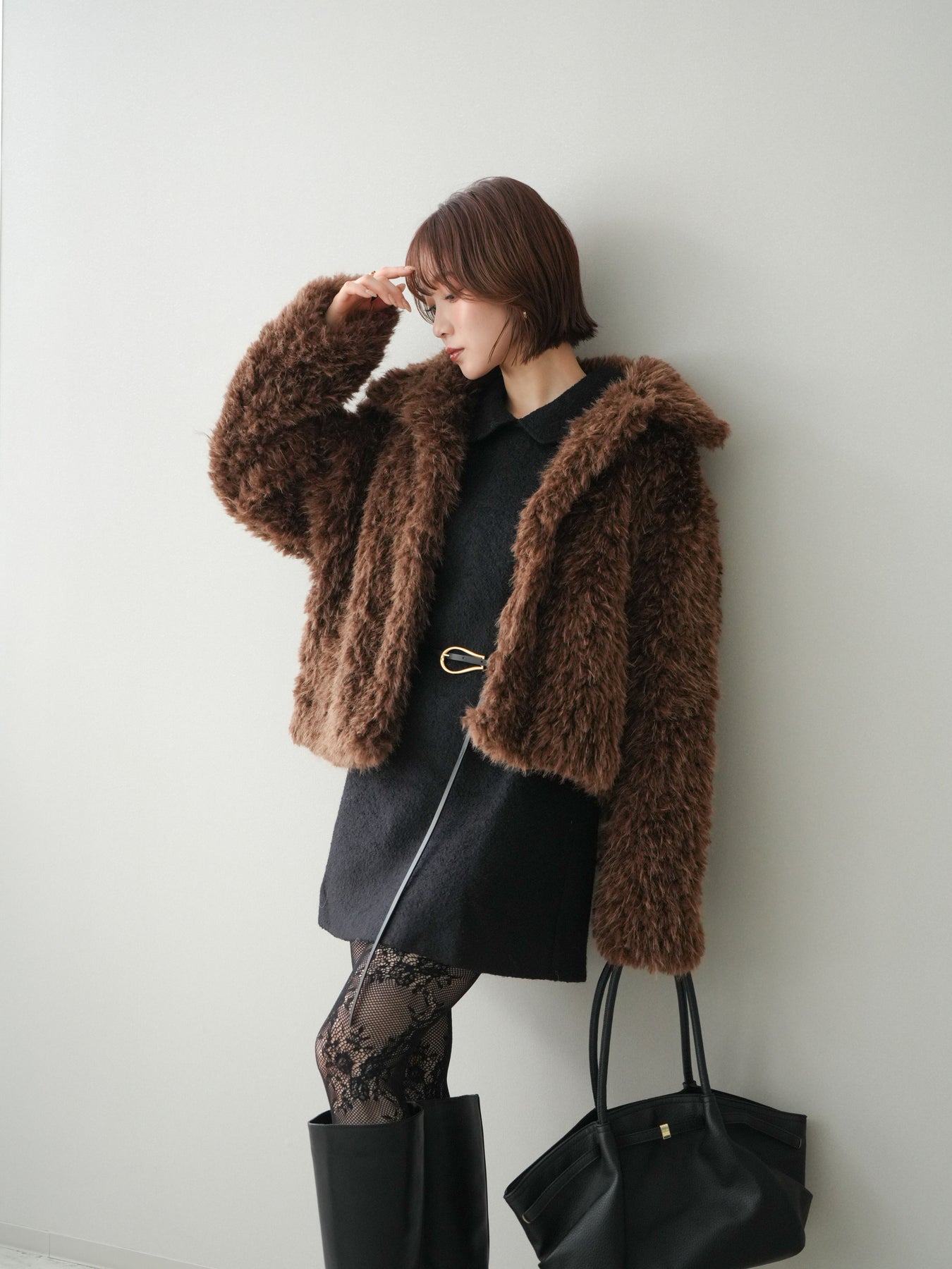 ふんわりとしたフェイクファー素材が存在感を放つ、襟付きデザインのショートブルゾン。 毛足のある柔らかな質感がシーズンムードを高め、羽織るだけでスタイリングに華やかさをプラスします。 コンパクトな丈感でバランスが取りやすく、ワンピースやハイウエストボトムとも好相性。 程よくゆとりのあるシルエットで、見た目以上に軽やかな着心地も魅力です。 デイリーからお出かけまで幅広く活躍する、主役級のアウターです。 ※ボトムス、キャミソール(インナー)以外の商品は一律でインナーは付属していません。