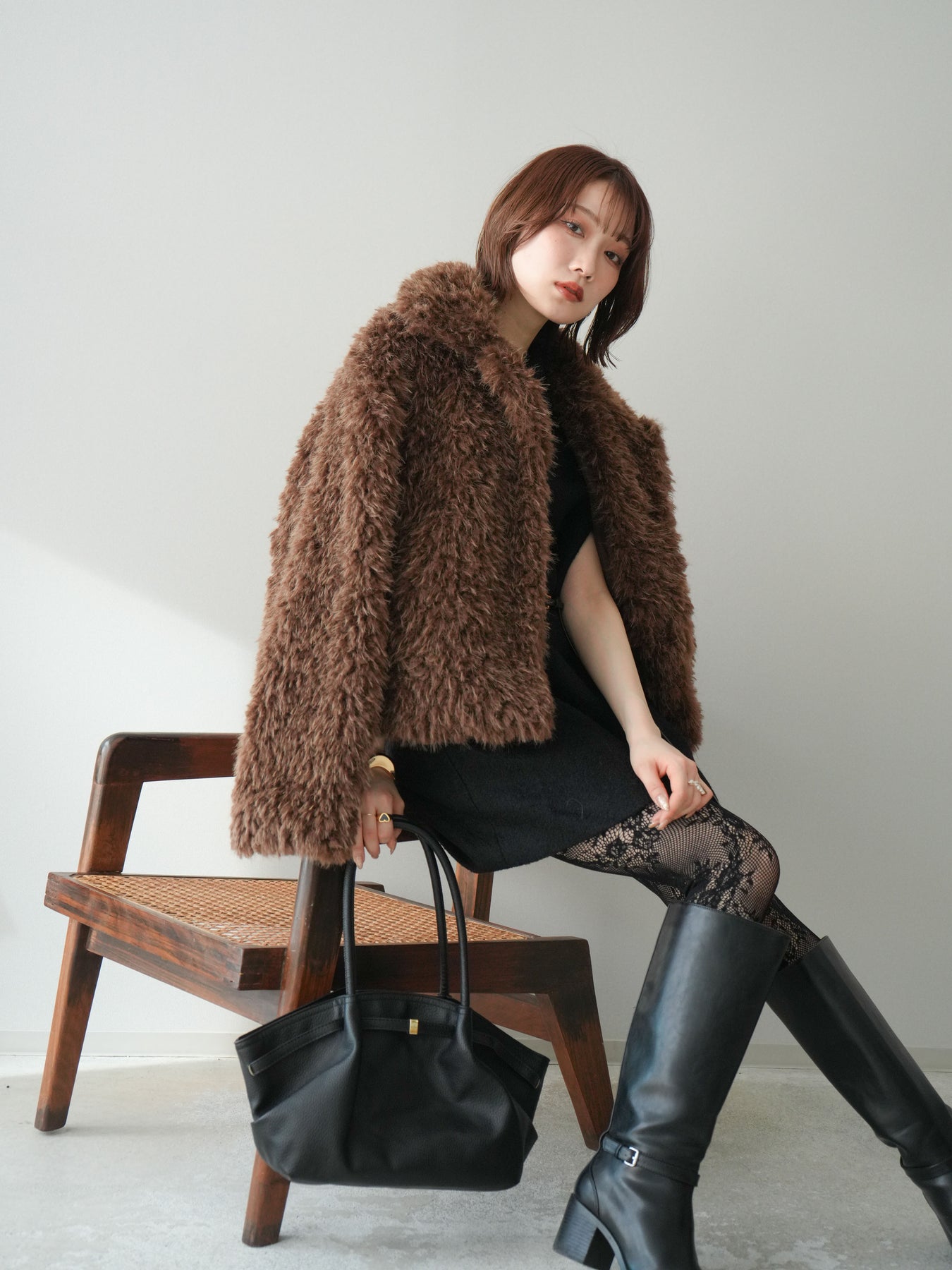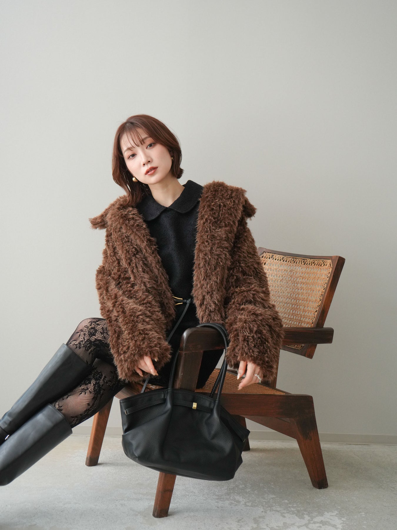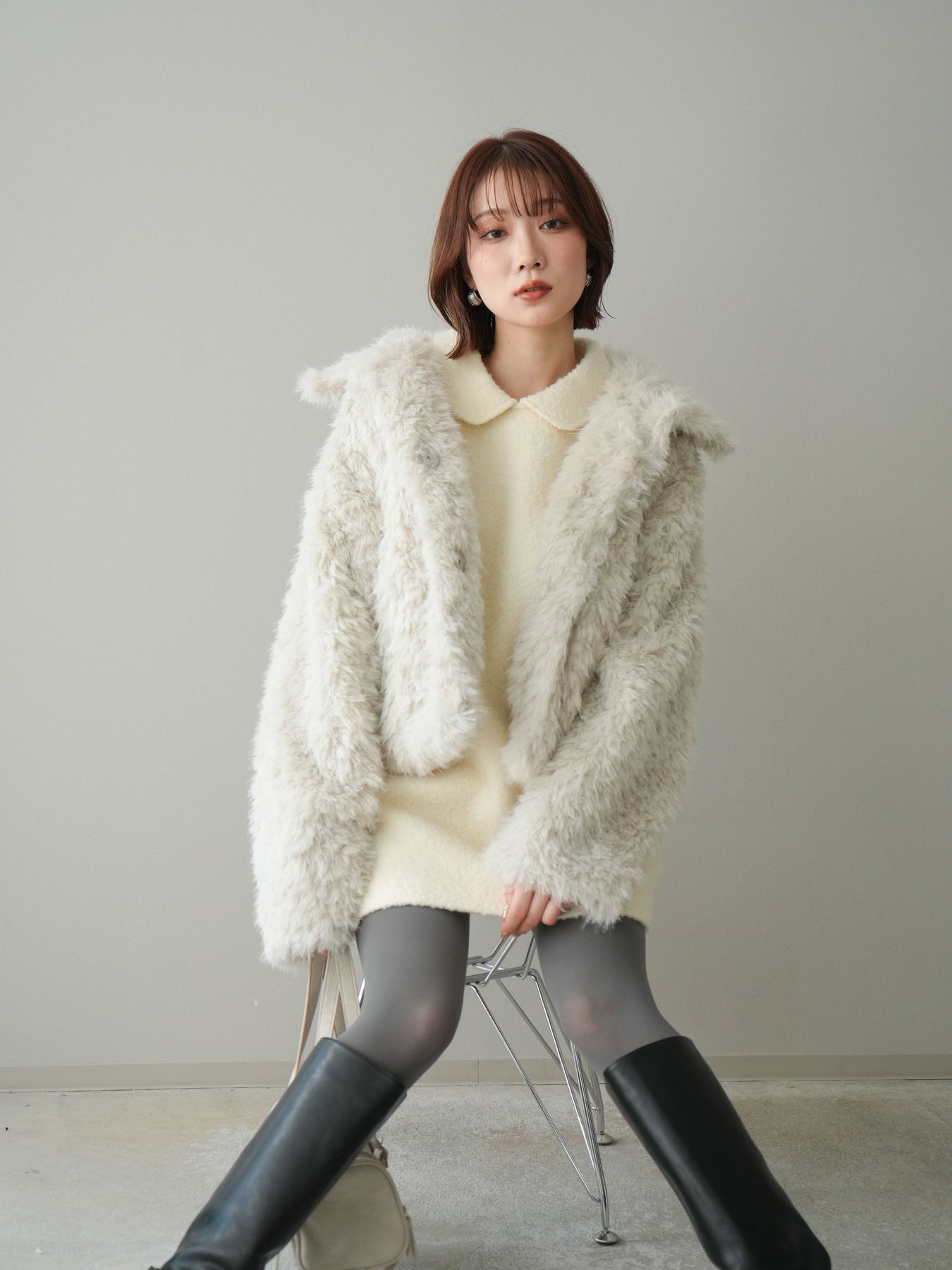 ふんわりとしたフェイクファー素材が存在感を放つ、襟付きデザインのショートブルゾン。 毛足のある柔らかな質感がシーズンムードを高め、羽織るだけでスタイリングに華やかさをプラスします。 コンパクトな丈感でバランスが取りやすく、ワンピースやハイウエストボトムとも好相性。 程よくゆとりのあるシルエットで、見た目以上に軽やかな着心地も魅力です。 デイリーからお出かけまで幅広く活躍する、主役級のアウターです。 ※ボトムス、キャミソール(インナー)以外の商品は一律でインナーは付属していません。