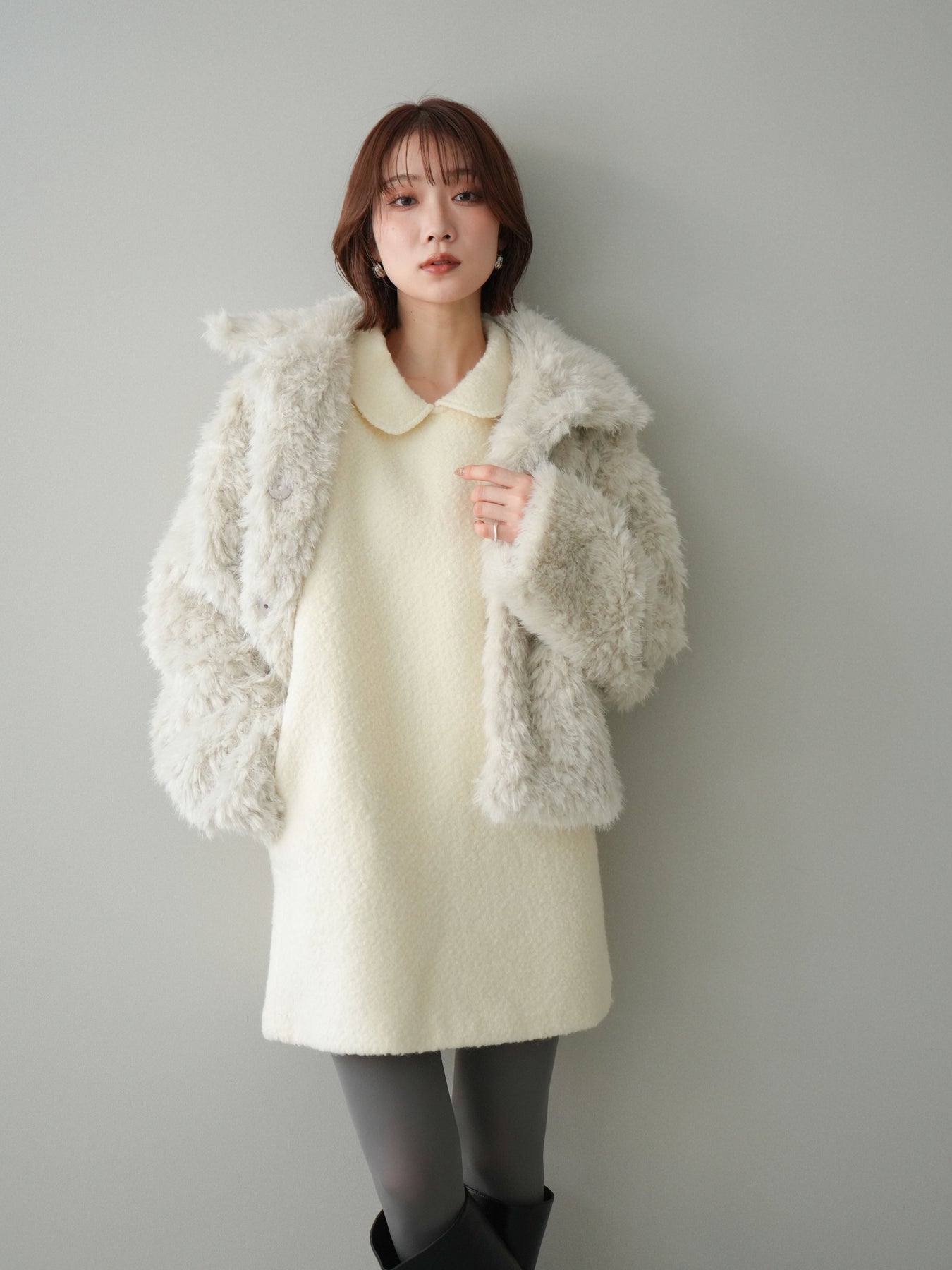 [SET]襟付きブークレミニワンピース+フェイクファー襟付きショートブルゾン(2set)