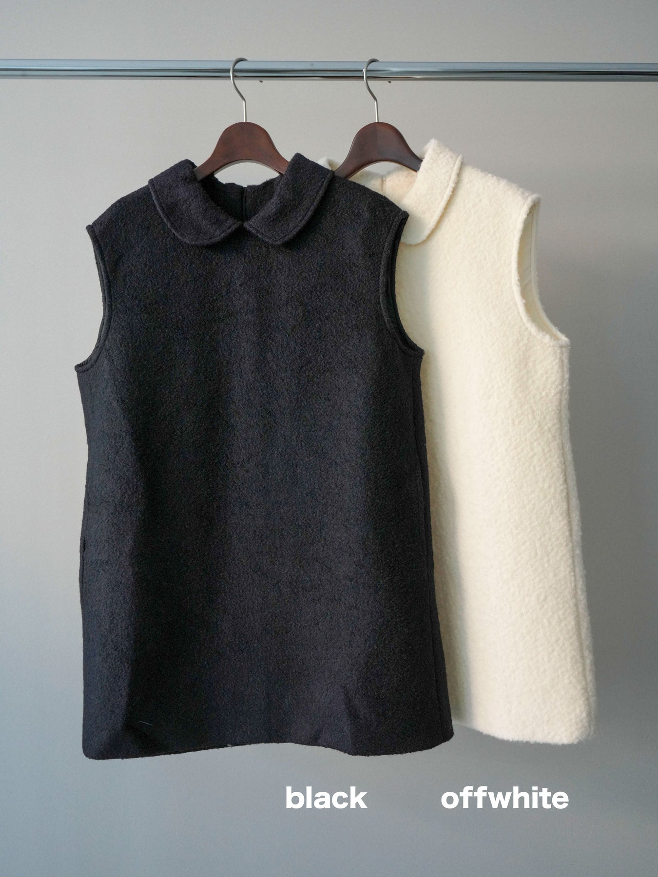表情のあるブークレ素材が上品な印象を与える、襟付きデザインのミニワンピース。 柔らかな凹凸感のある生地が立体感を生み、シンプルながらも存在感のある一着に仕上がっています。 コンパクトな襟がきちんと感をプラスし、レイヤード次第で幅広いスタイリングが楽しめるデザイン。 程よくゆとりのあるシルエットで、体のラインを拾いすぎず、バランス良く着こなせます。 一枚ではもちろん、ボトムと合わせたレイヤードスタイルもおすすめのアイテムです。 ※ボトムス、キャミソール(インナー)以外の商品は一律でインナーは付属していません。