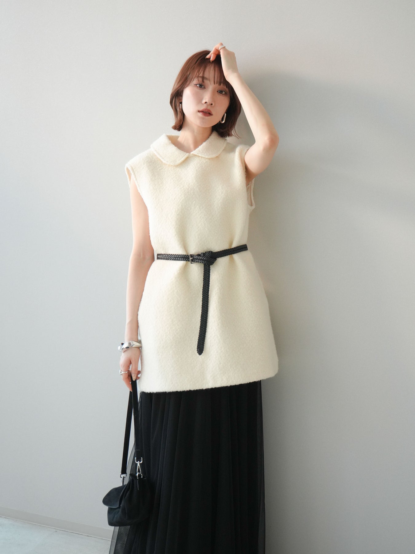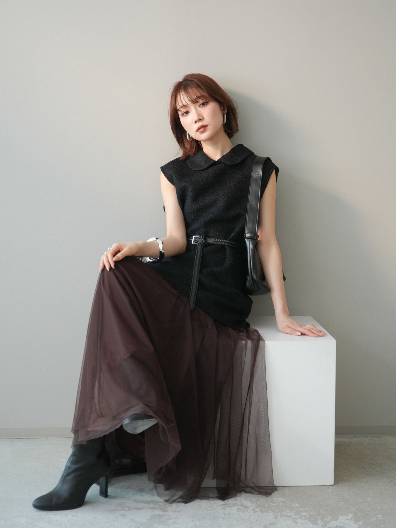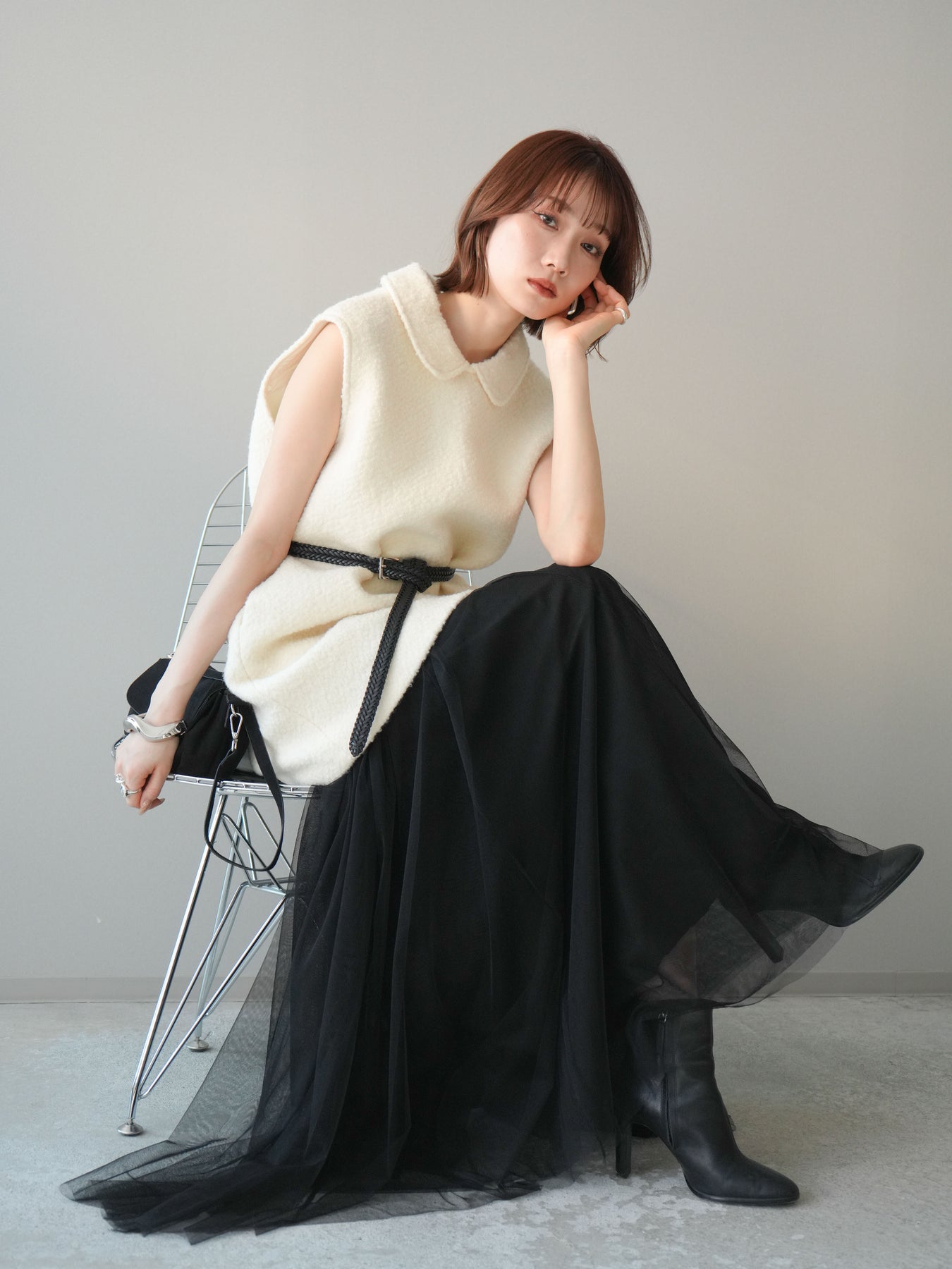 [SET]襟付きブークレミニワンピース+チュールボリュームスカート(2set)