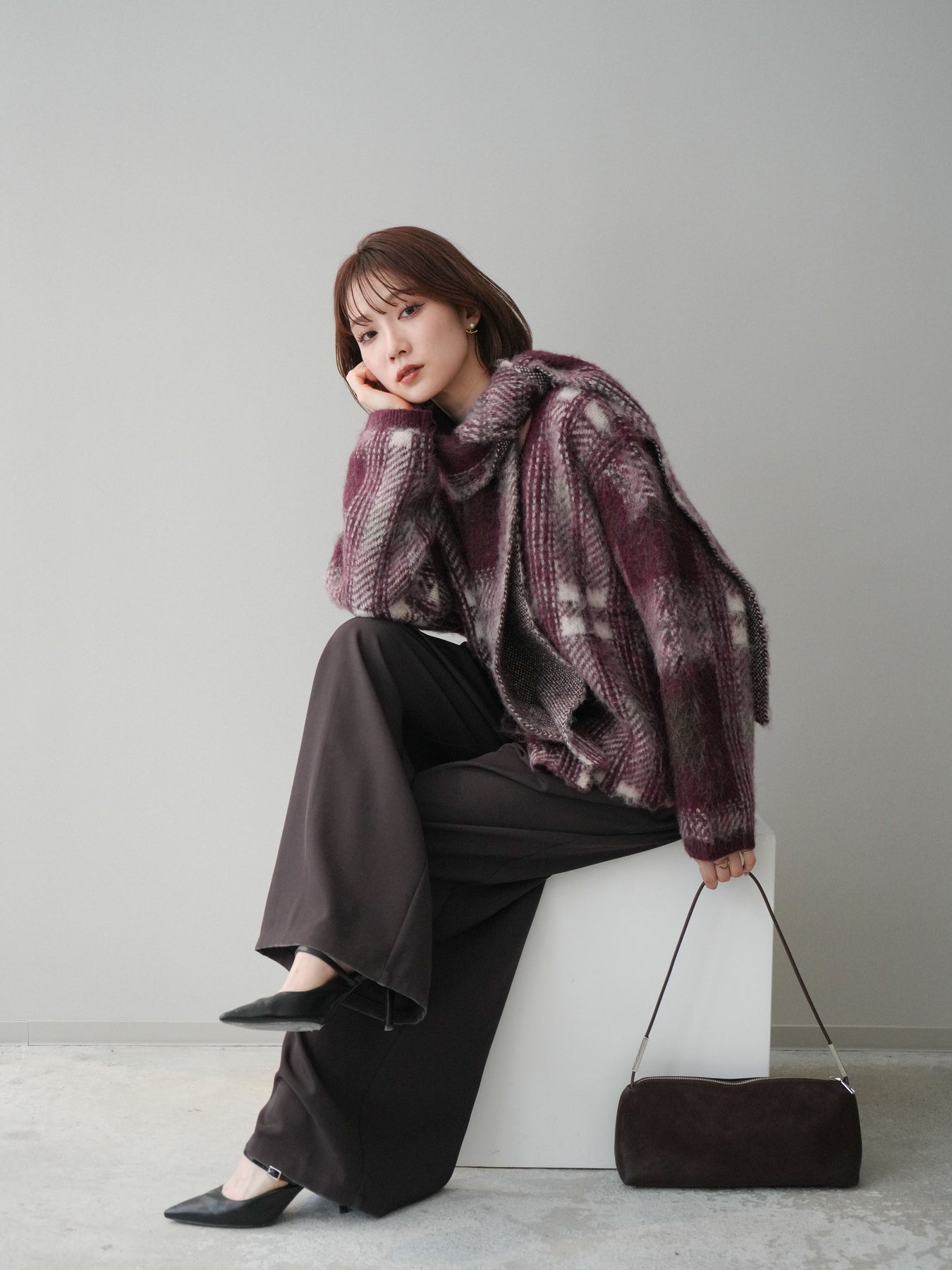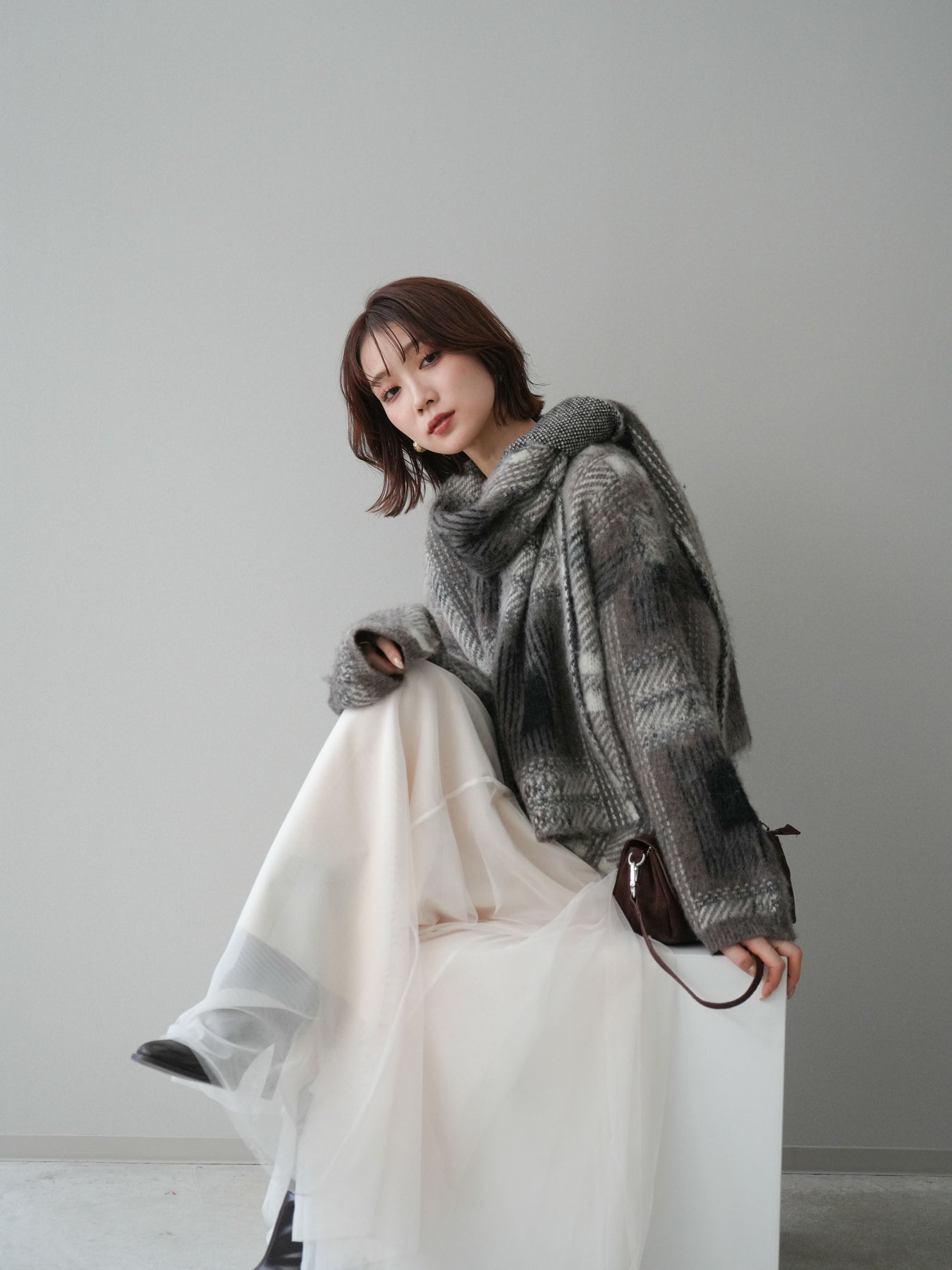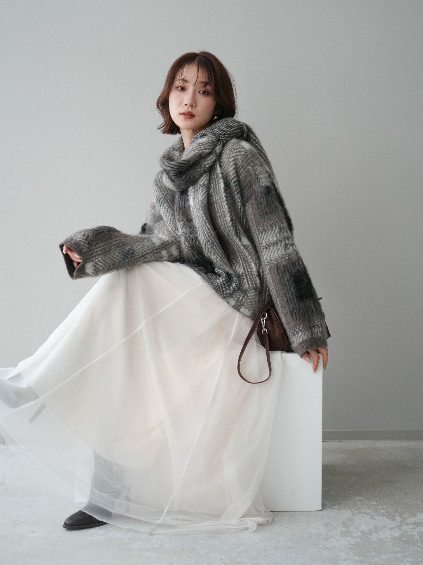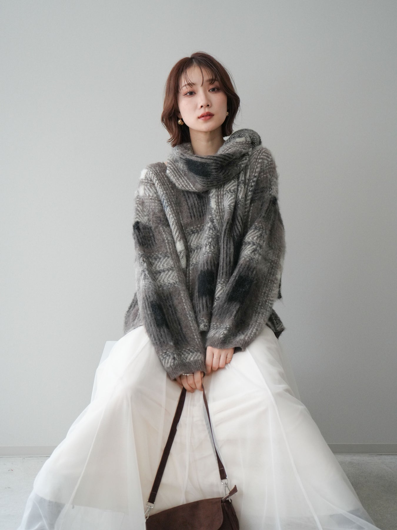 ふんわりとしたシャギー素材にチェック柄を重ねた、存在感のあるニットプルオーバー。 起毛感のある柔らかな風合いがシーズンムードを高め、着るだけで温もりのある印象を演出します。 同素材のストール付きデザインで、首元にアクセントを加えたり、アレンジを楽しめるのも魅力。 ゆったりとしたシルエットでリラックス感があり、ボトムを選ばずバランス良く着こなせます。 一枚で主役になるデザイン性と、実用性を兼ね備えたニットトップスです。 ※ボトムス、キャミソール(インナー)以外の商品は一律でインナーは付属していません。