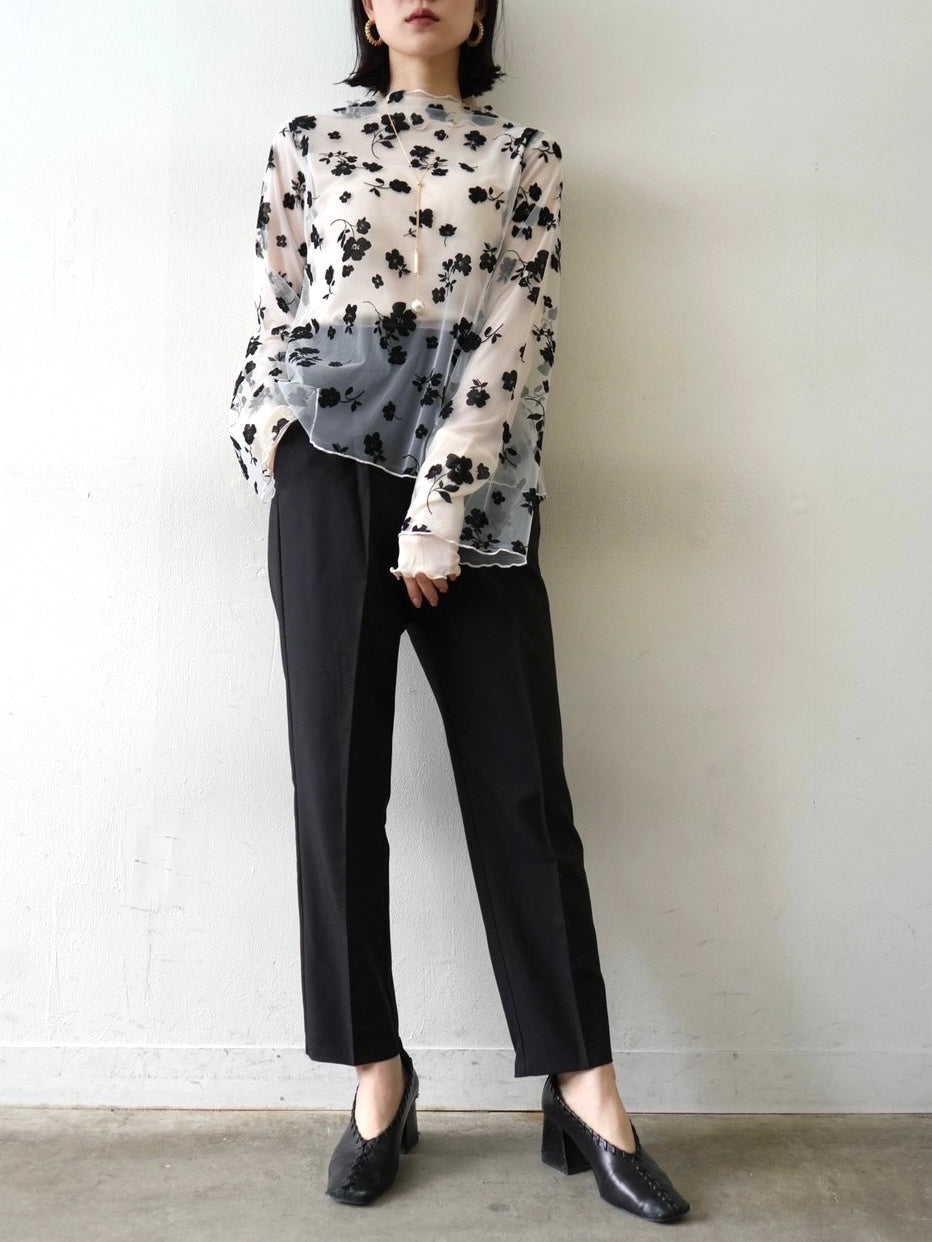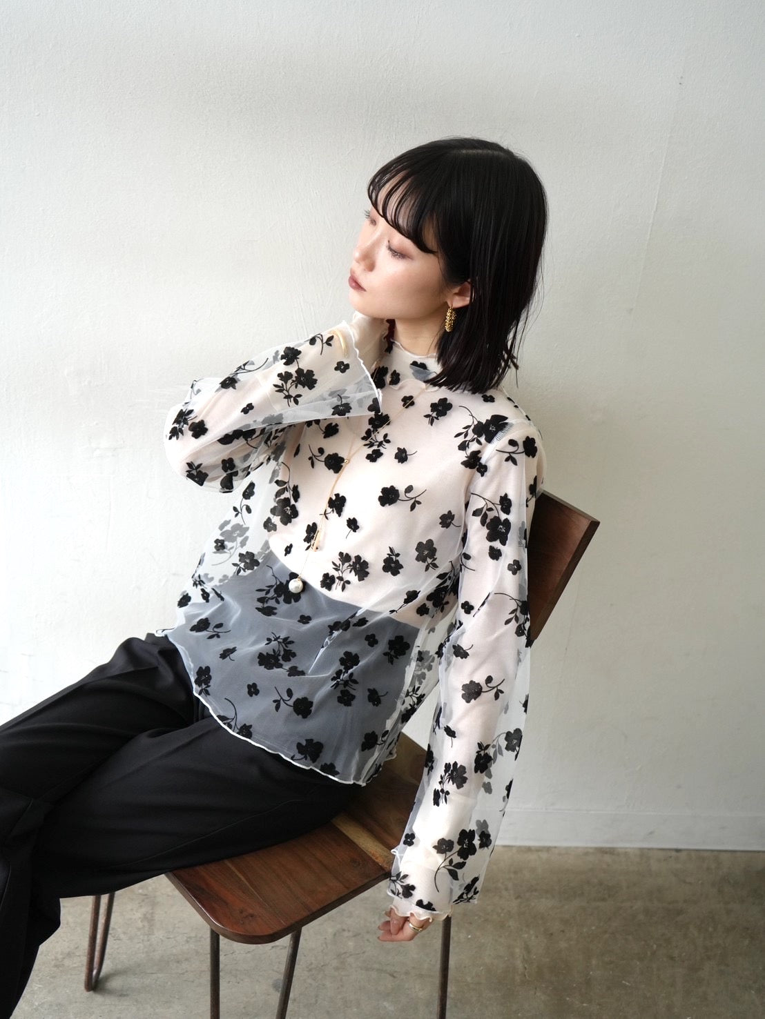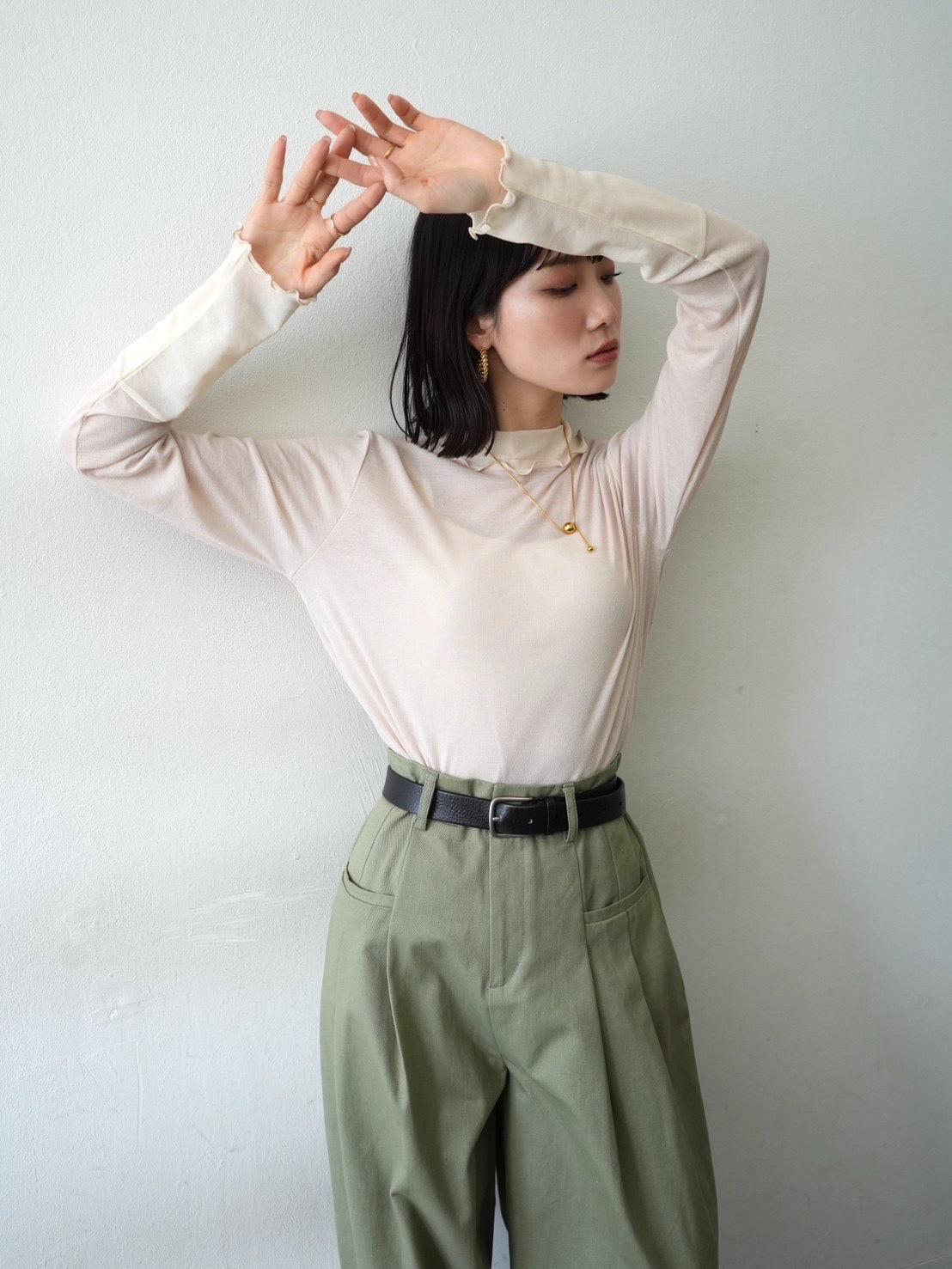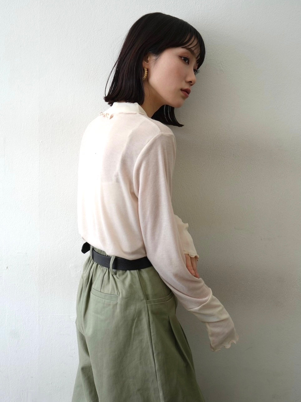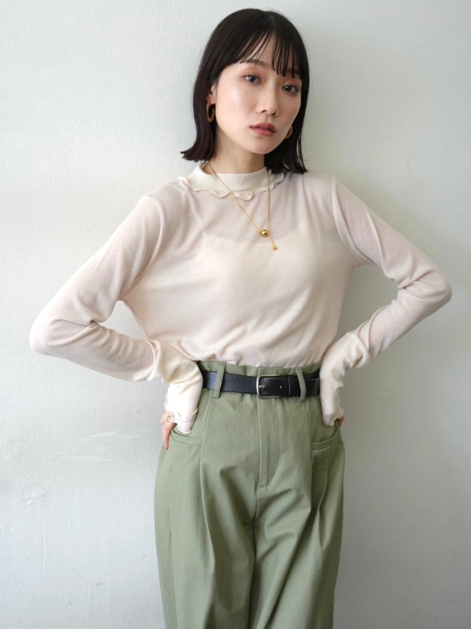 異素材切り替えのコットンガーゼトップスは、メローを施したフェミニンな一着です。柔らかな素材感で肌心地が良く、薄手なのでインナーとしても重宝します。長めの袖はクシュっと弛ませたり、重ねたニットの袖口から覗かせたりと、手元を印象的に見せることができ、着るだけおしゃれ見えするコーデが叶います。