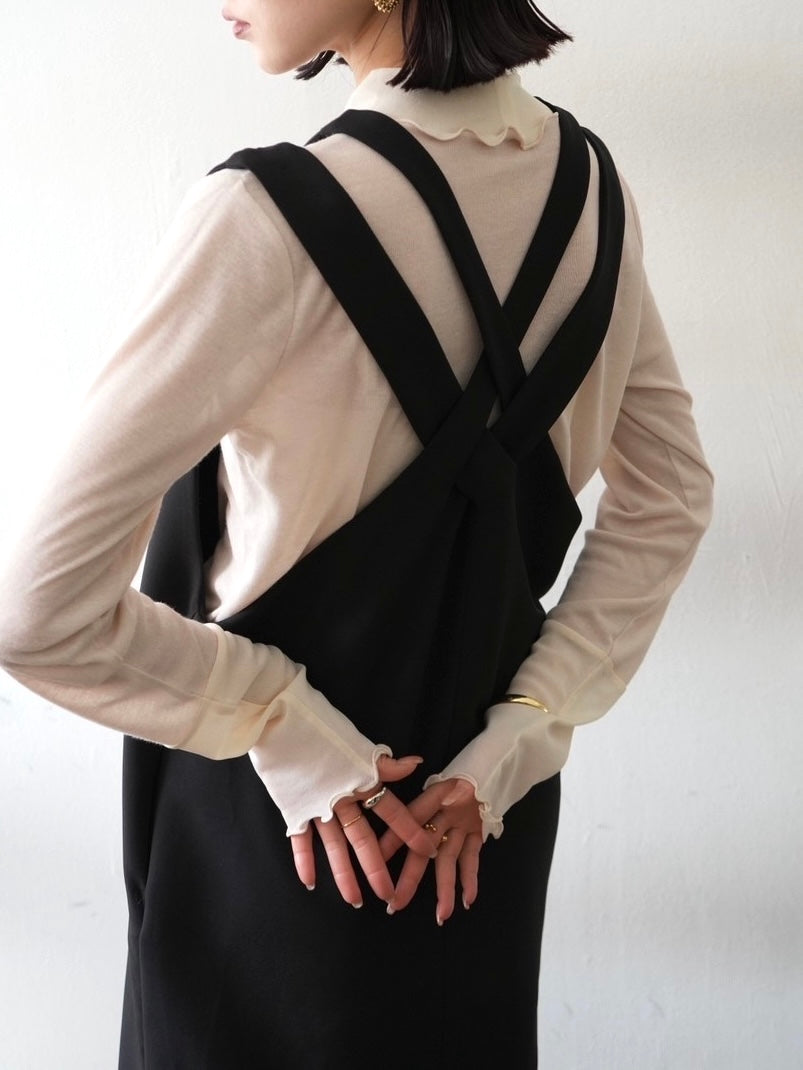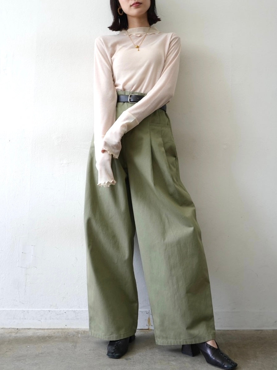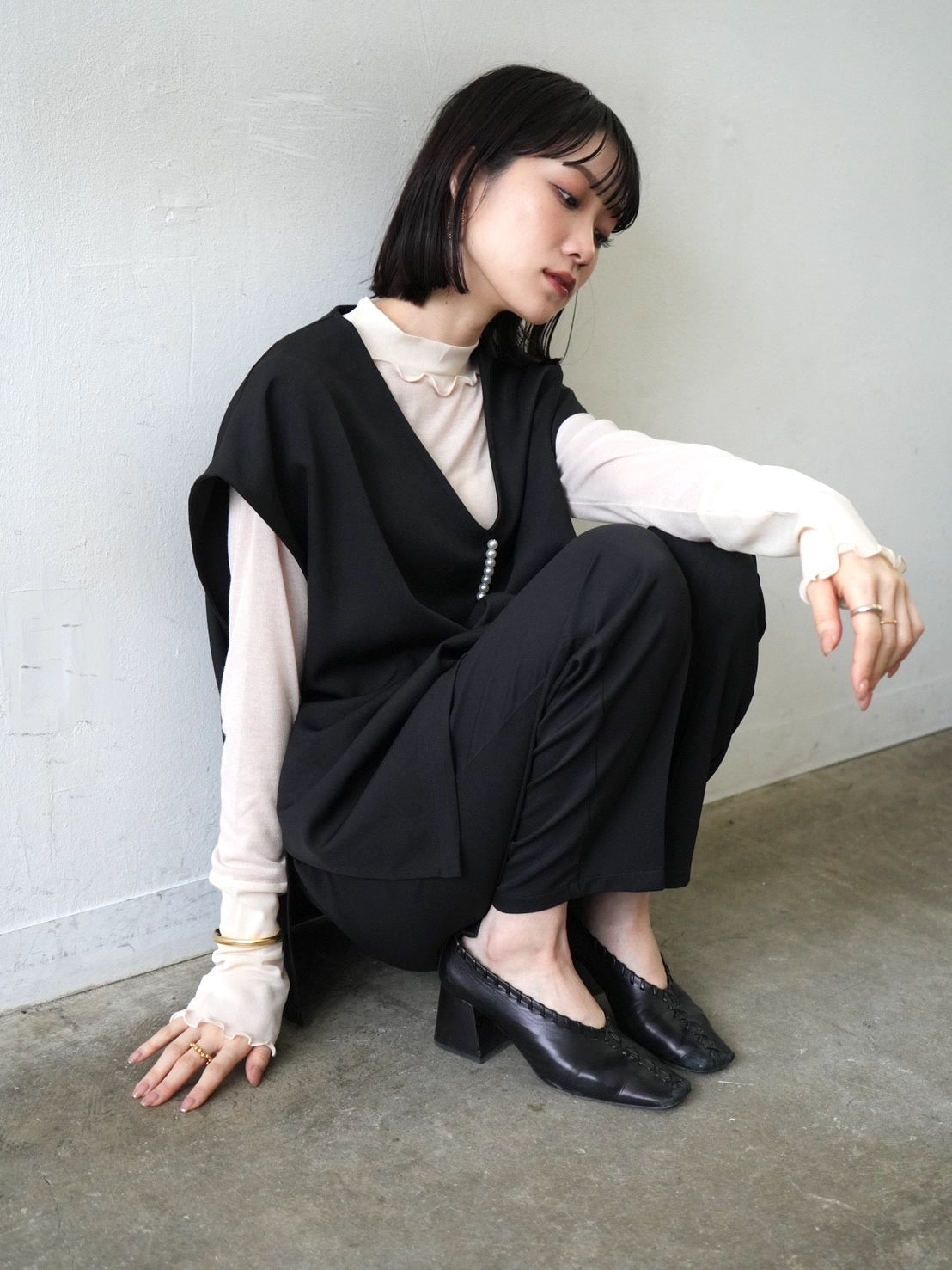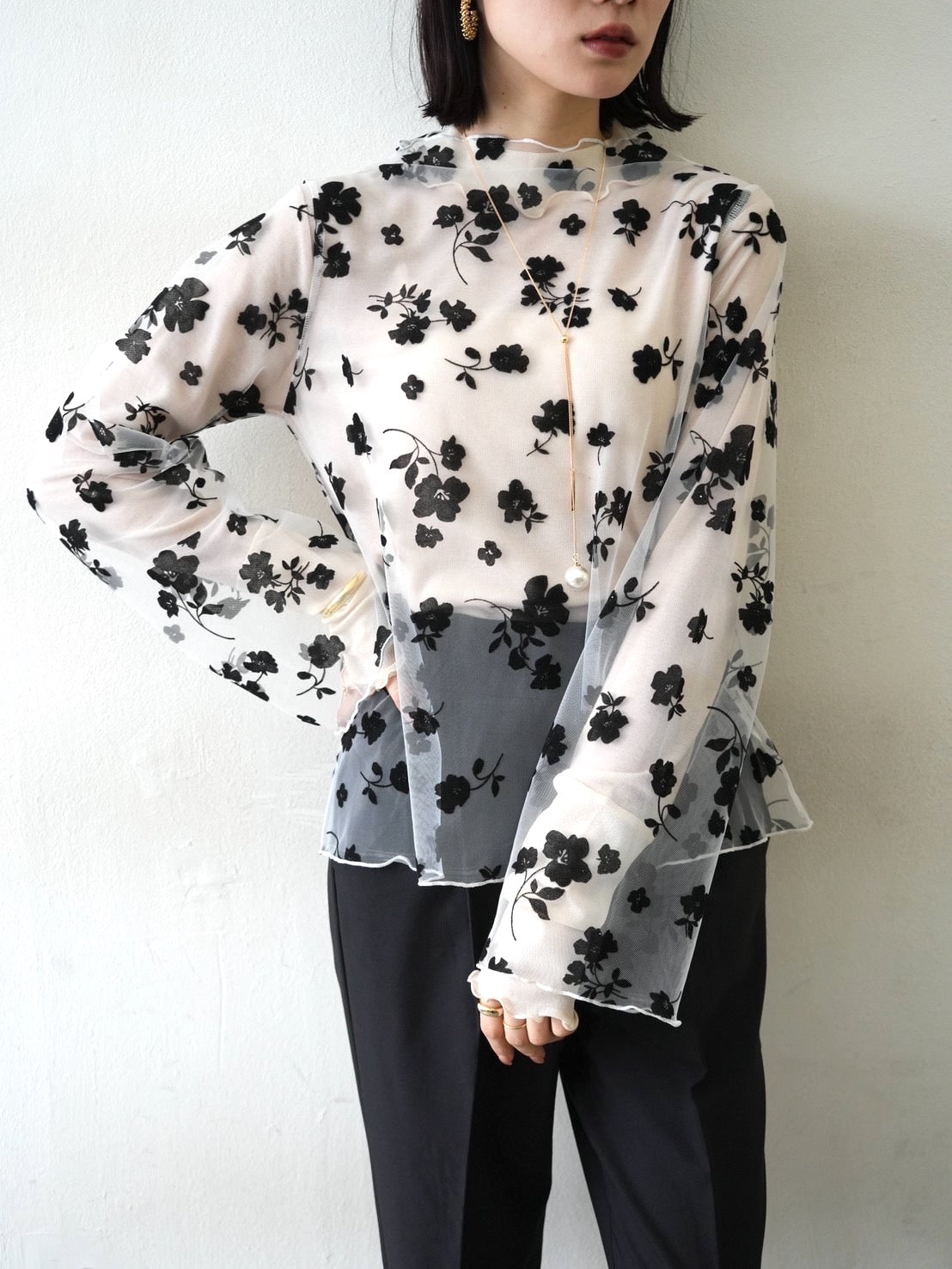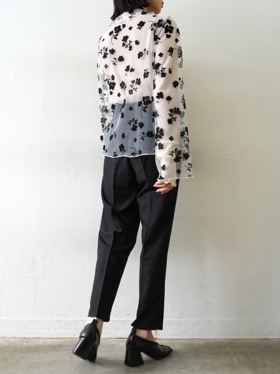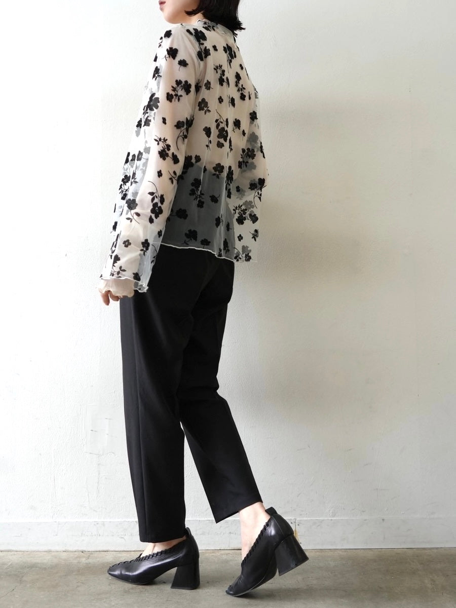 異素材切り替えのコットンガーゼトップスは、メローを施したフェミニンな一着です。柔らかな素材感で肌心地が良く、薄手なのでインナーとしても重宝します。長めの袖はクシュっと弛ませたり、重ねたニットの袖口から覗かせたりと、手元を印象的に見せることができ、着るだけおしゃれ見えするコーデが叶います。