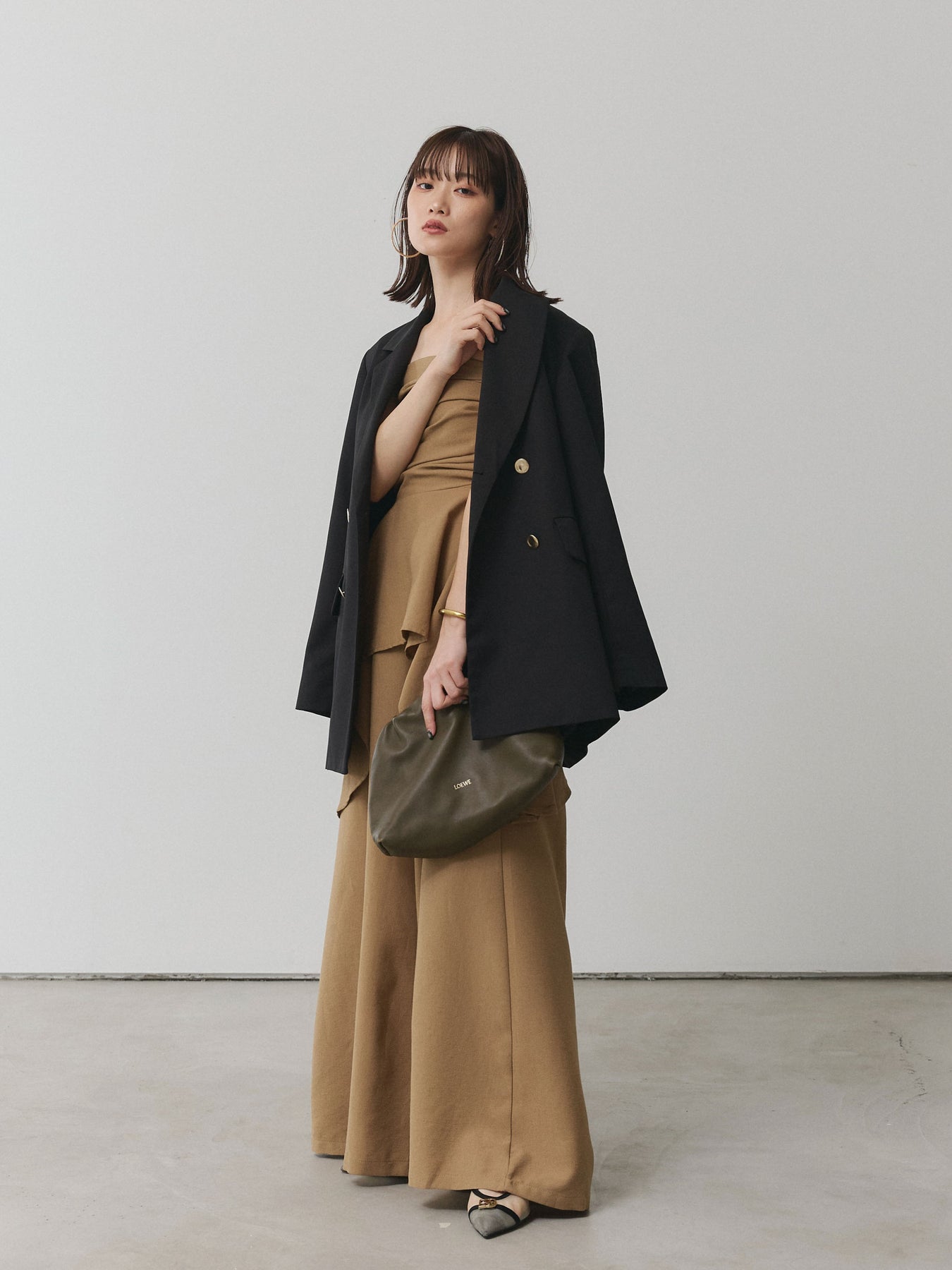 クラシカルなダブルブレストデザインを取り入れたオーバージャケット。程よくゆとりのあるシルエットがこなれ感を演出し、羽織るだけで洗練されたスタイルに仕上がります。光沢を抑えたマットな生地感が大人らしい落ち着きを与え、オンオフ問わず幅広いシーンで活躍。肩からさっとかけるだけでも存在感があり、ワイドパンツやスカートとの相性も抜群です。ゴールドボタンがアクセントとなり、シンプルながらも華やかさをプラス。トレンド感とクラシックさを兼ね備えた、ワードローブに一枚は持っておきたいアイテムです。 ※ボトムス、キャミソール(インナー)以外の商品は一律でインナーは付属していません。