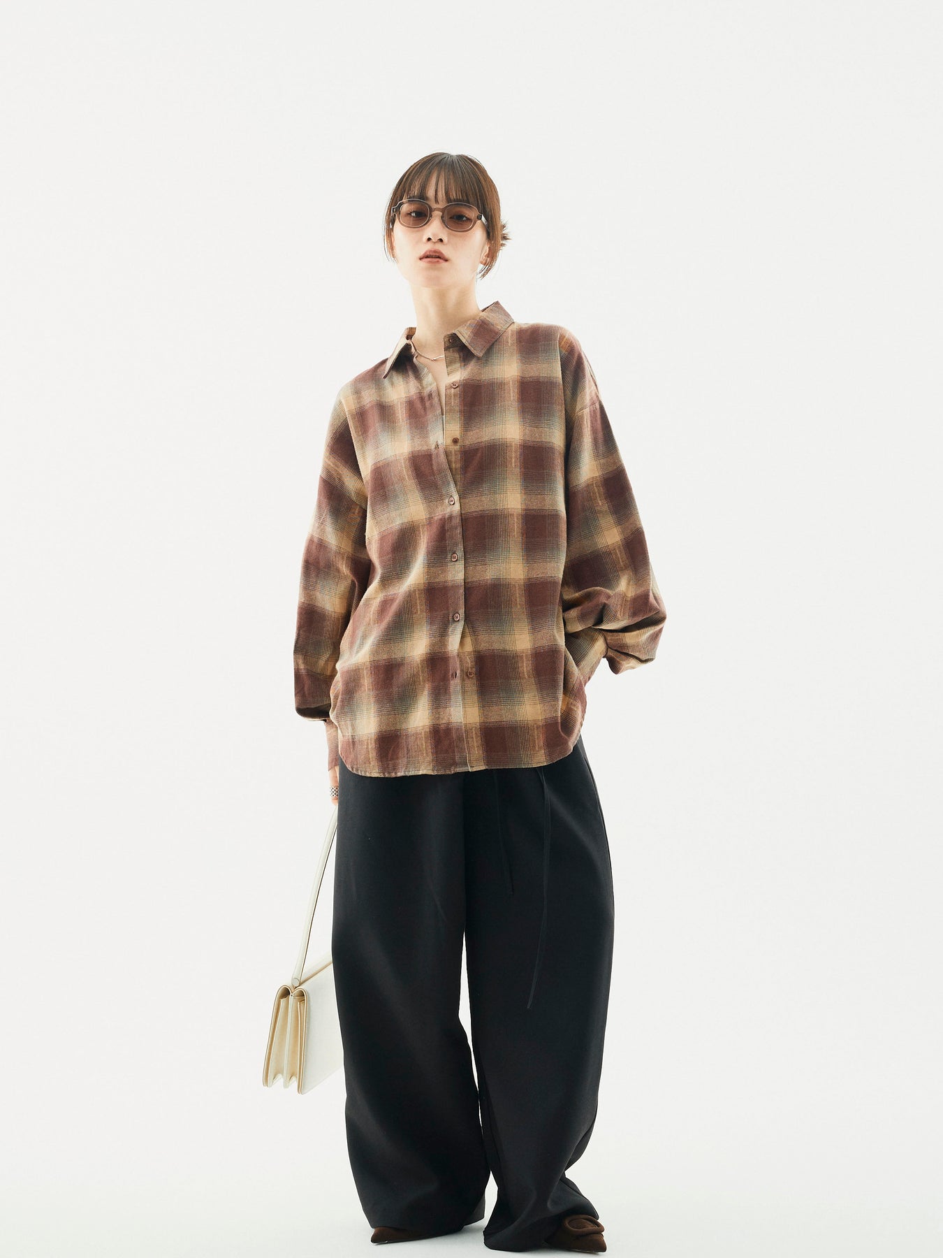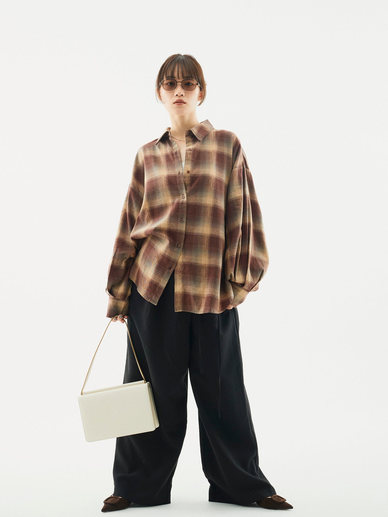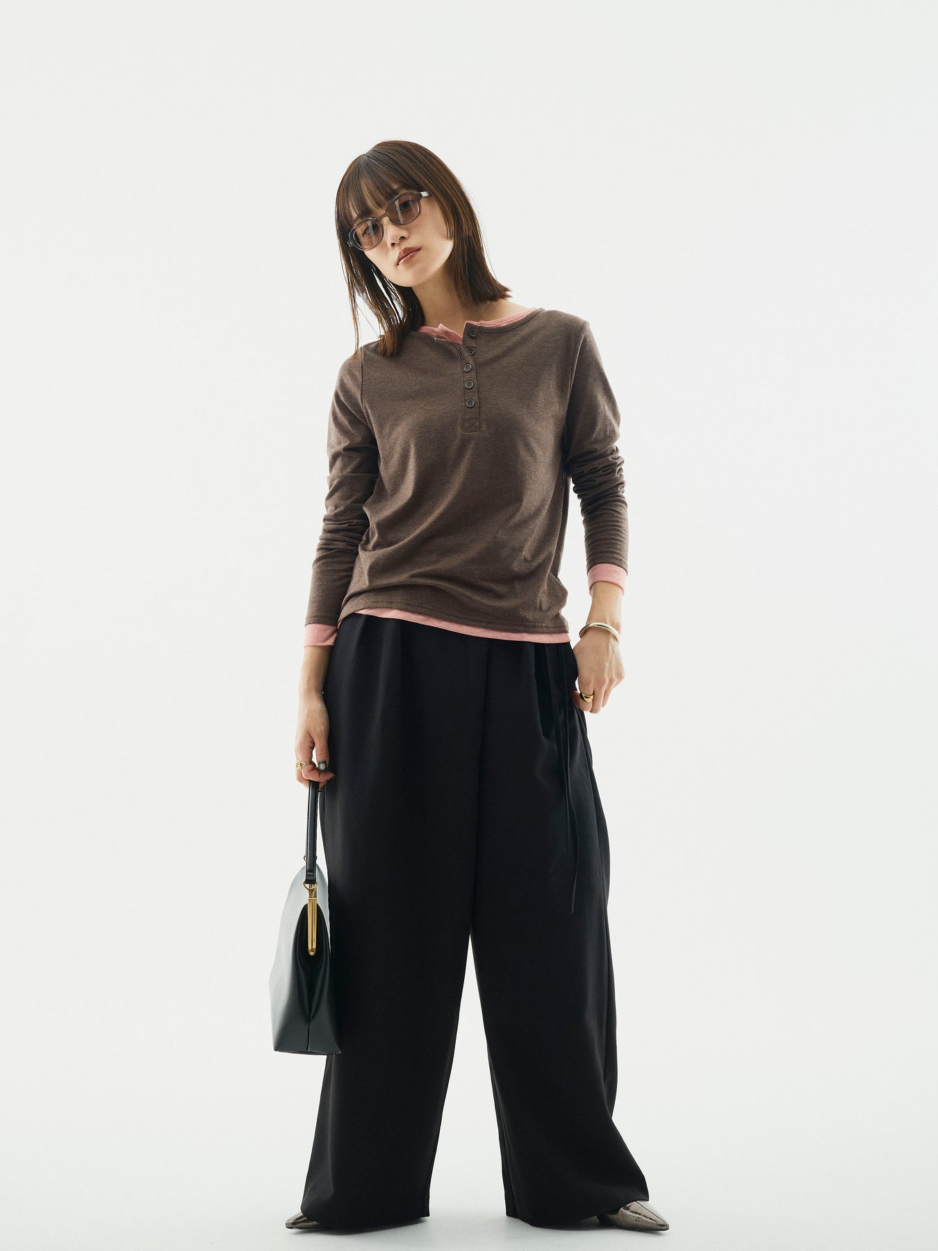 フロントにラップ風ディテールを効かせた、モード感漂うタックワイドパンツ。 ウエスト部分にあしらわれたラップデザインが、奥行きと立体感を生み出し、着こなしにさりげないアクセントをプラス。タック入りのワイドシルエットは体のラインを拾わず、スタイルアップ効果も抜群です。 さらりとした落ち感のある素材で、カジュアルからキレイめまで幅広く対応。トップスをインすることで、ウエストデザインが際立ち、コーディネートにメリハリが生まれます。 オンオフ問わず活躍する、頼れる1本です。