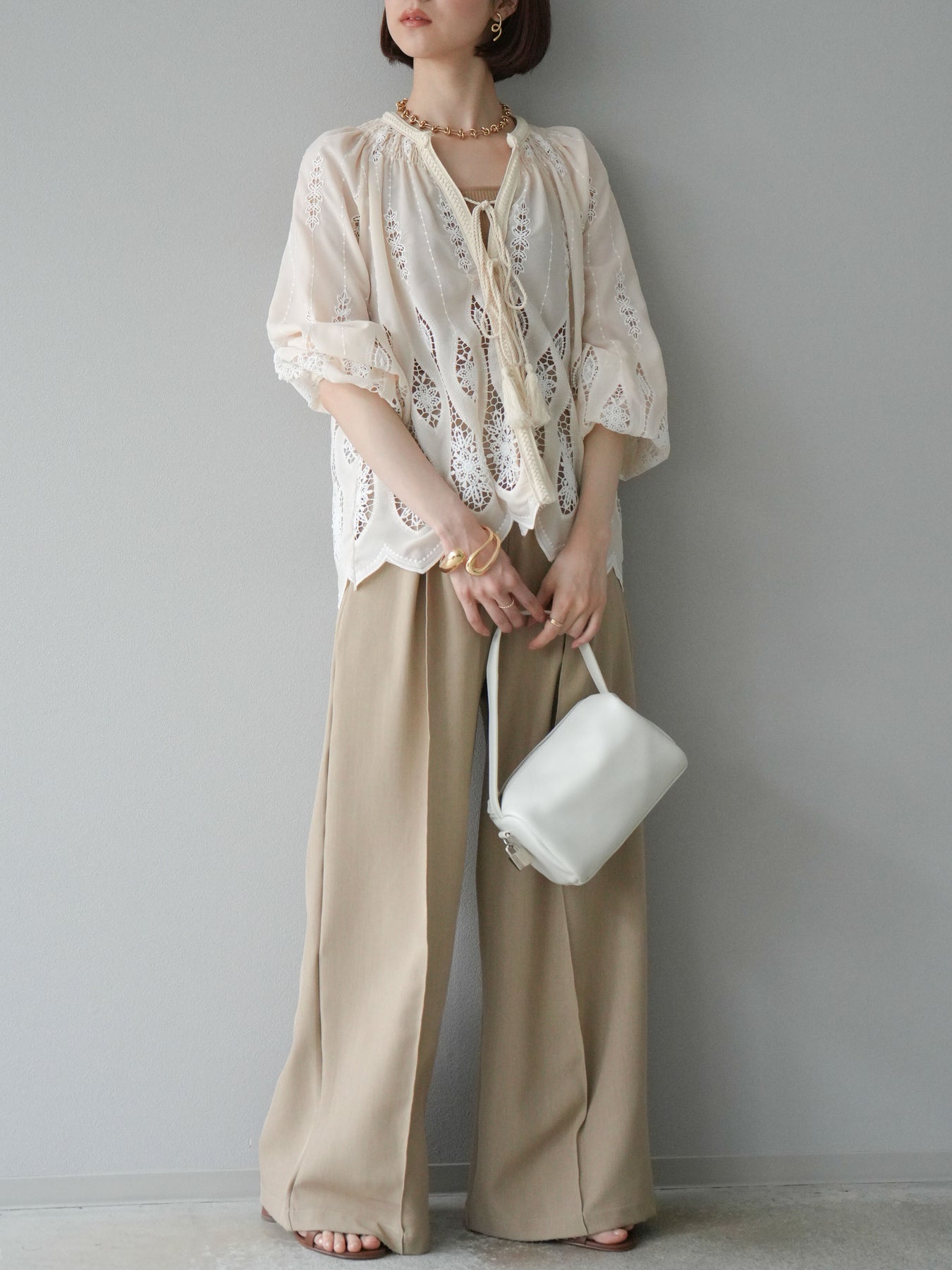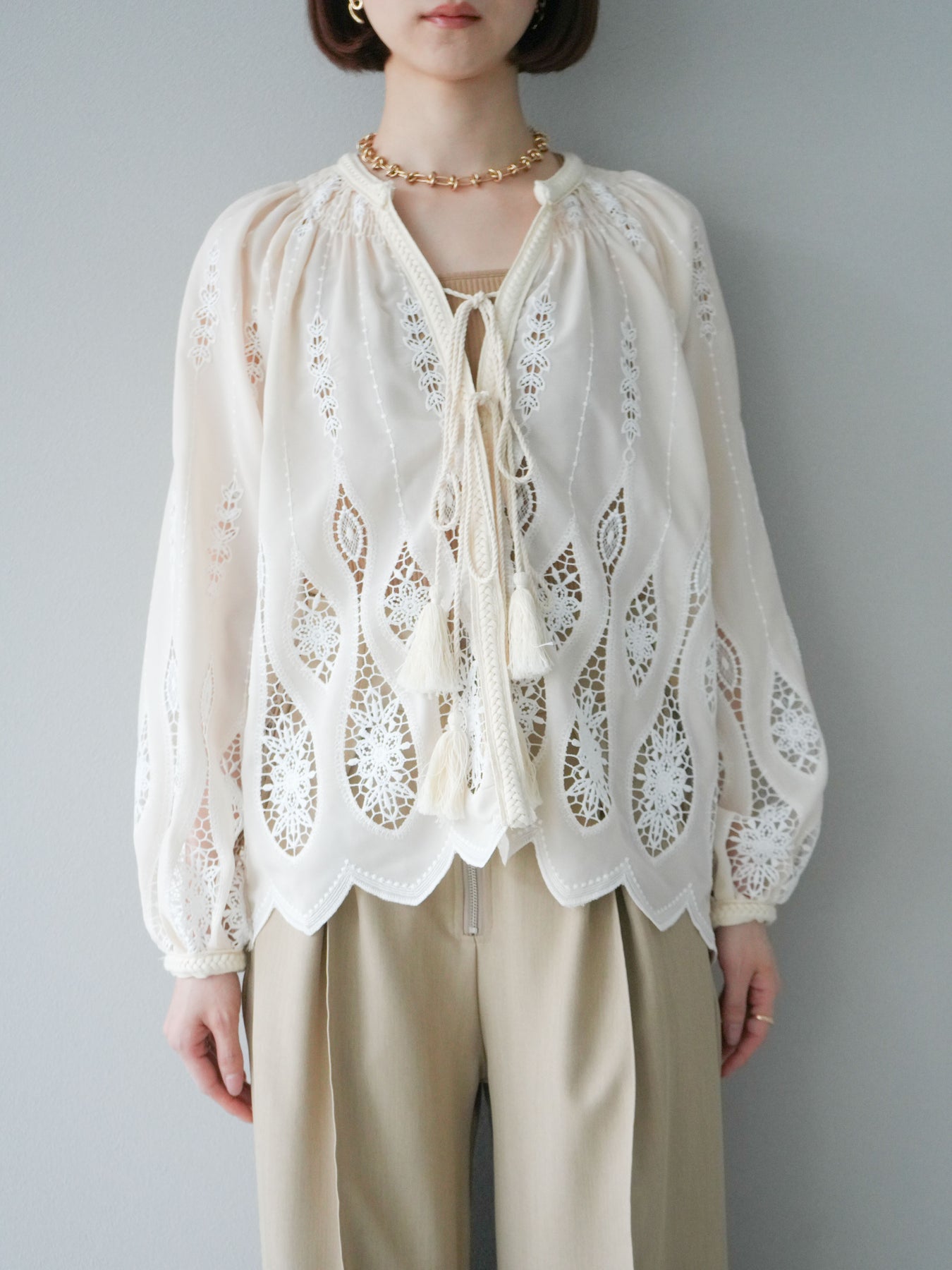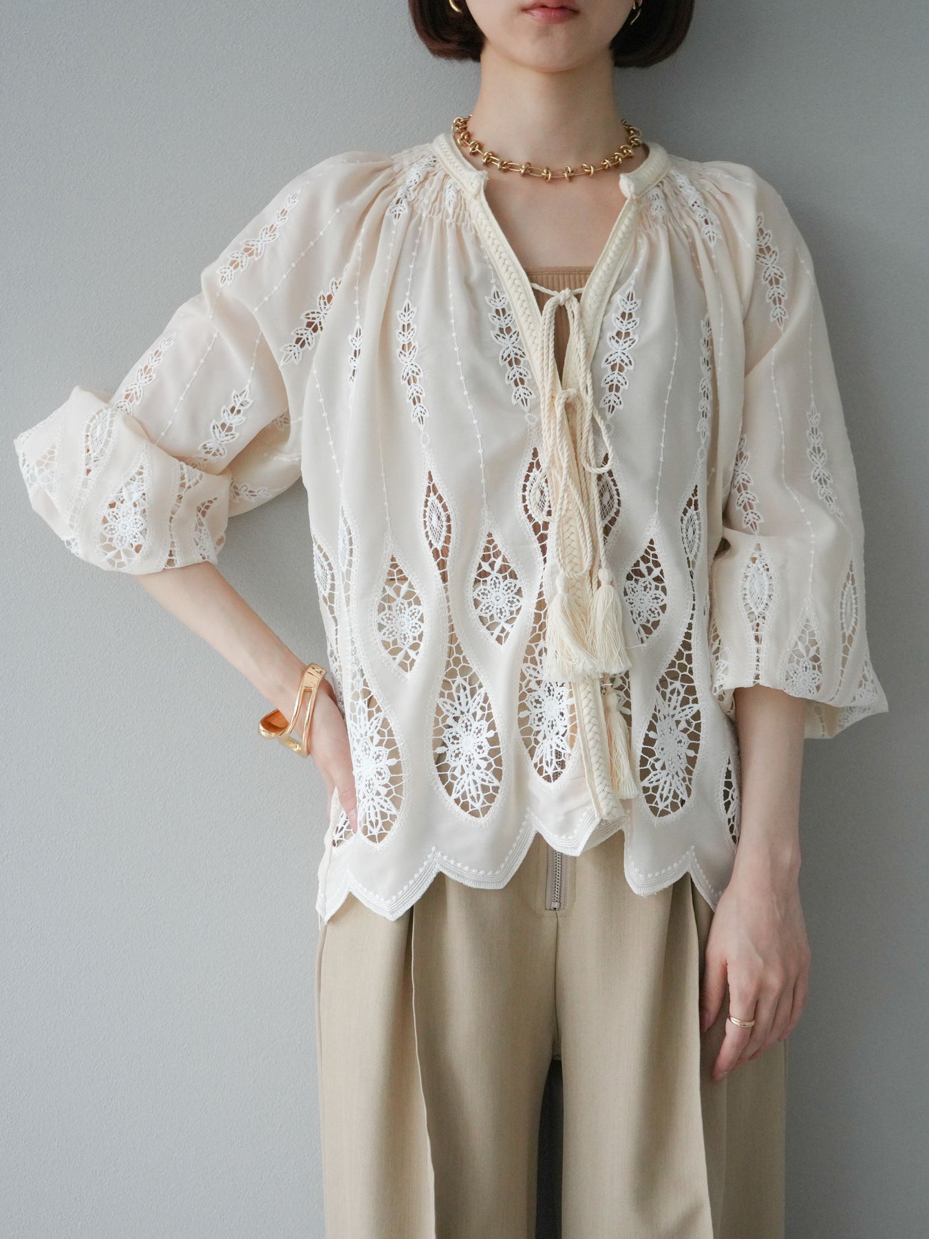 繊細な刺繍が施された、美しいデザインのブラウス。クラシカルな刺繍が前面にあしらわれ、エレガントさと華やかさを演出します。軽やかな素材感とリラックスしたシルエットで、カジュアルにもエレガントにもコーディネートできます。伸縮性のあるウエストと袖口が、さらに着心地をよくし、シンプルながら印象的なスタイルを作り出します。 ※ボトムス、キャミソール(インナー)以外の商品は一律でインナーは付属していません