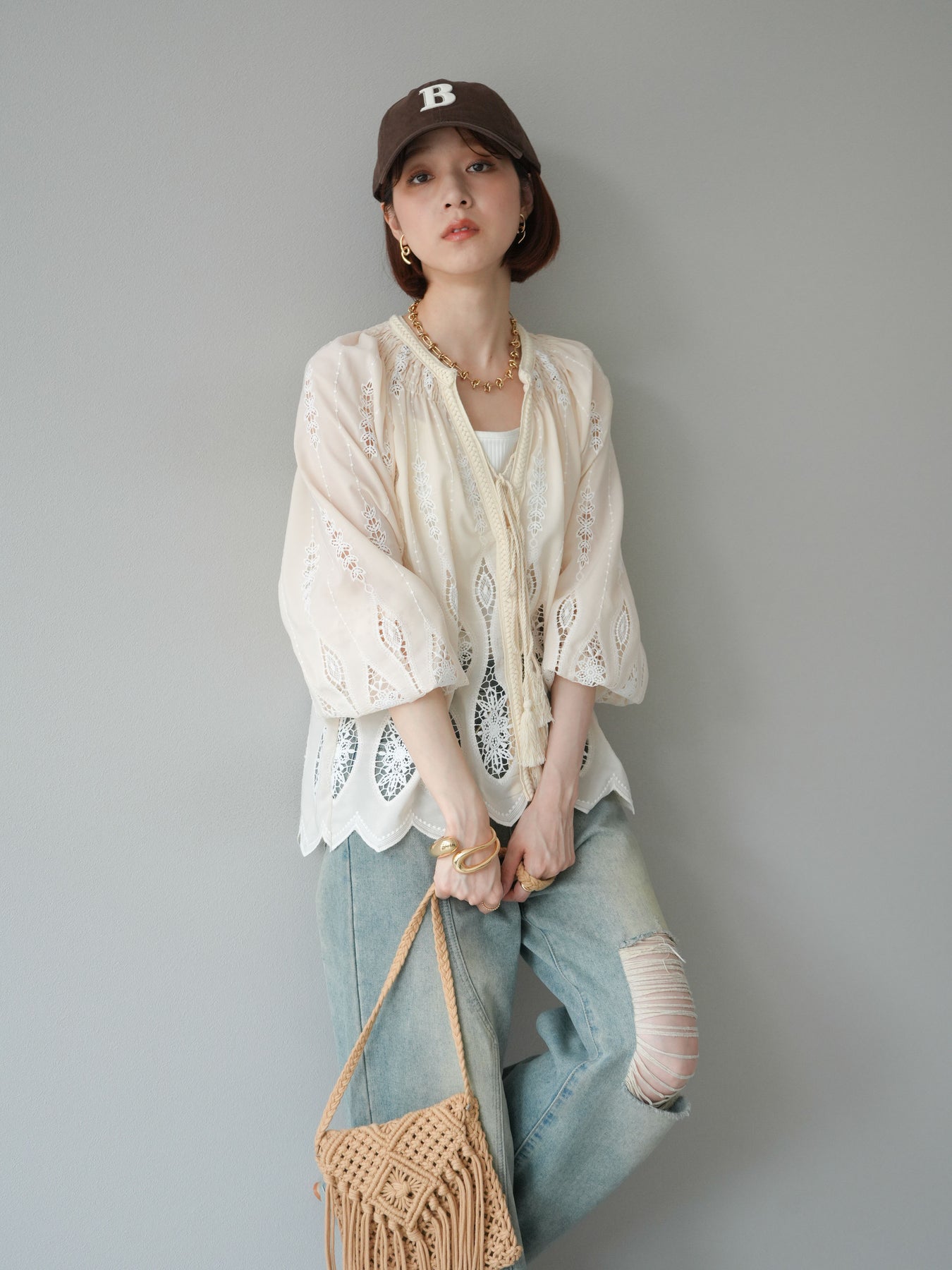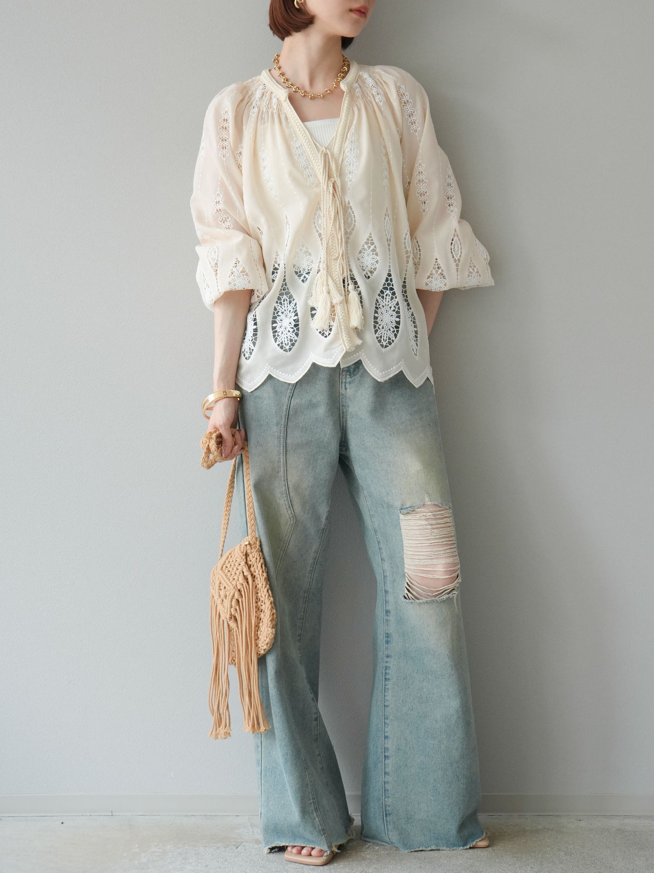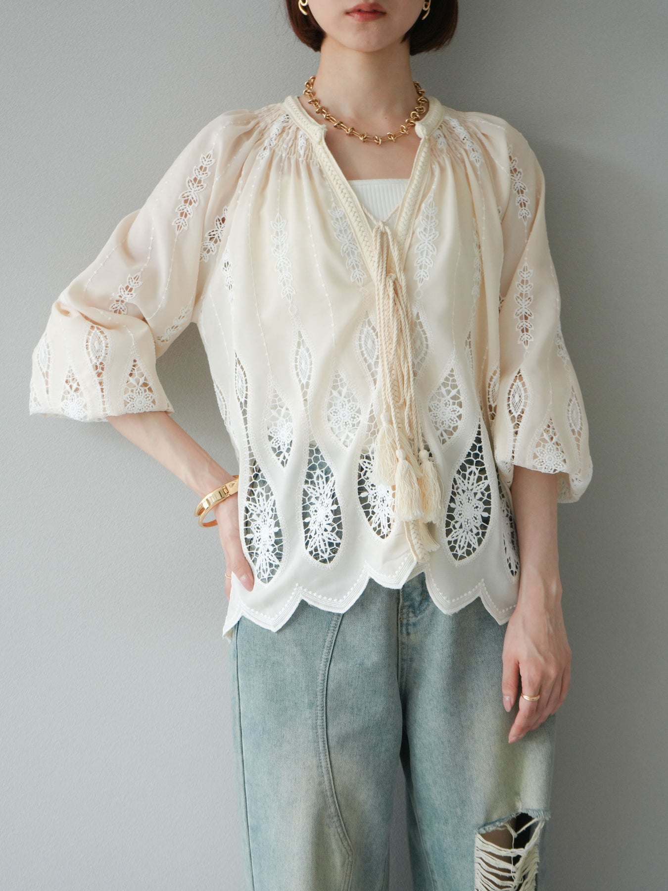 繊細な刺繍が施された、美しいデザインのブラウス。クラシカルな刺繍が前面にあしらわれ、エレガントさと華やかさを演出します。軽やかな素材感とリラックスしたシルエットで、カジュアルにもエレガントにもコーディネートできます。伸縮性のあるウエストと袖口が、さらに着心地をよくし、シンプルながら印象的なスタイルを作り出します。 ※ボトムス、キャミソール(インナー)以外の商品は一律でインナーは付属していません