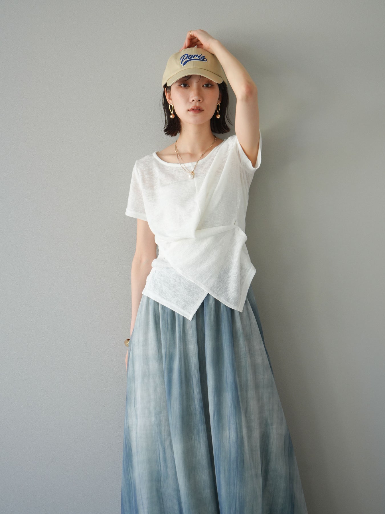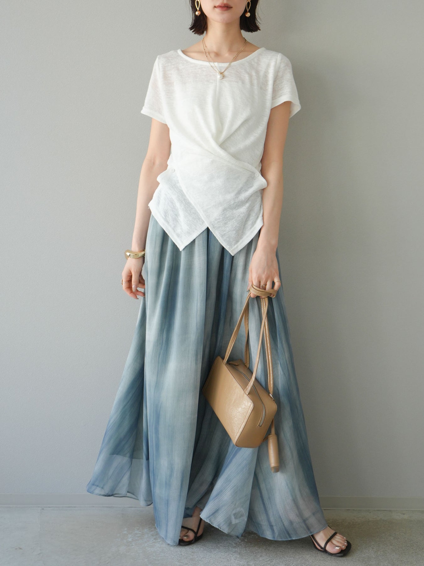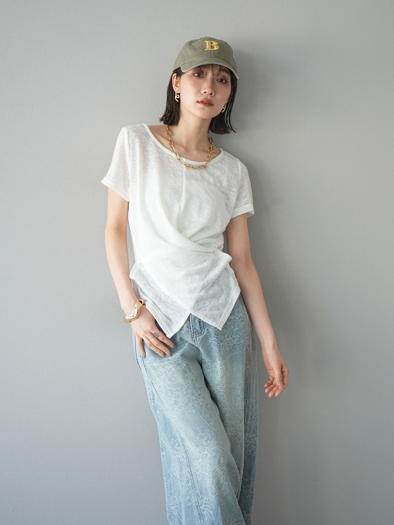 軽やかな透け感が魅力の、カシュクールデザインのシアーニットプルオーバー。やわらかく伸縮性のあるニット素材で、さらりとした着心地と女性らしい抜け感を兼ね備えた一枚です。フロントのドレープが自然にウエストラインをカバーしつつ、ラフになりすぎずこなれた印象に。パンツにもスカートにも合わせやすく、インナーとのレイヤードスタイルも楽しめます。春夏のデイリースタイルにぴったりな、上品カジュアルアイテムです。 ※ボトムス、キャミソール(インナー)以外の商品は一律でインナーは付属していません。