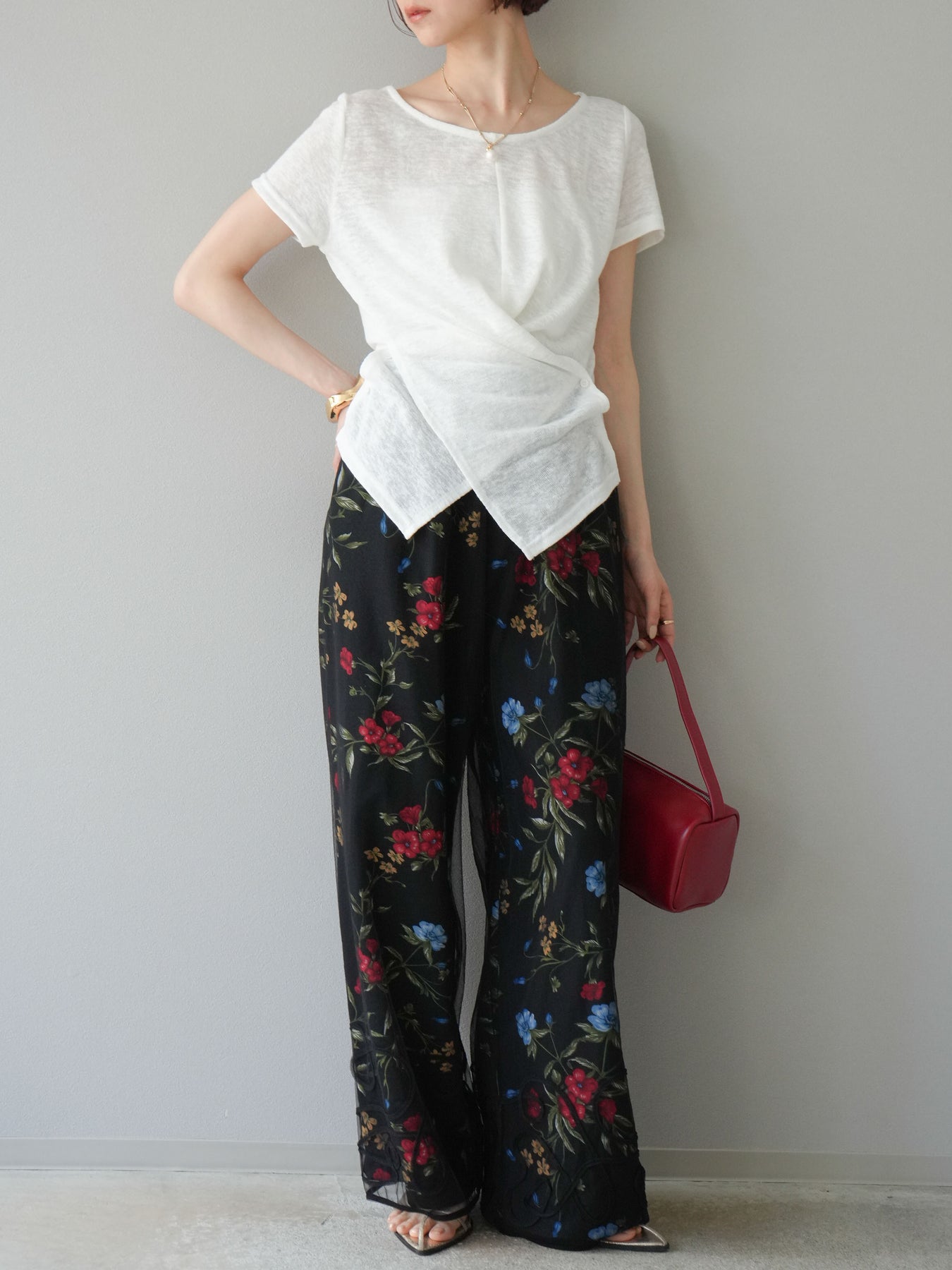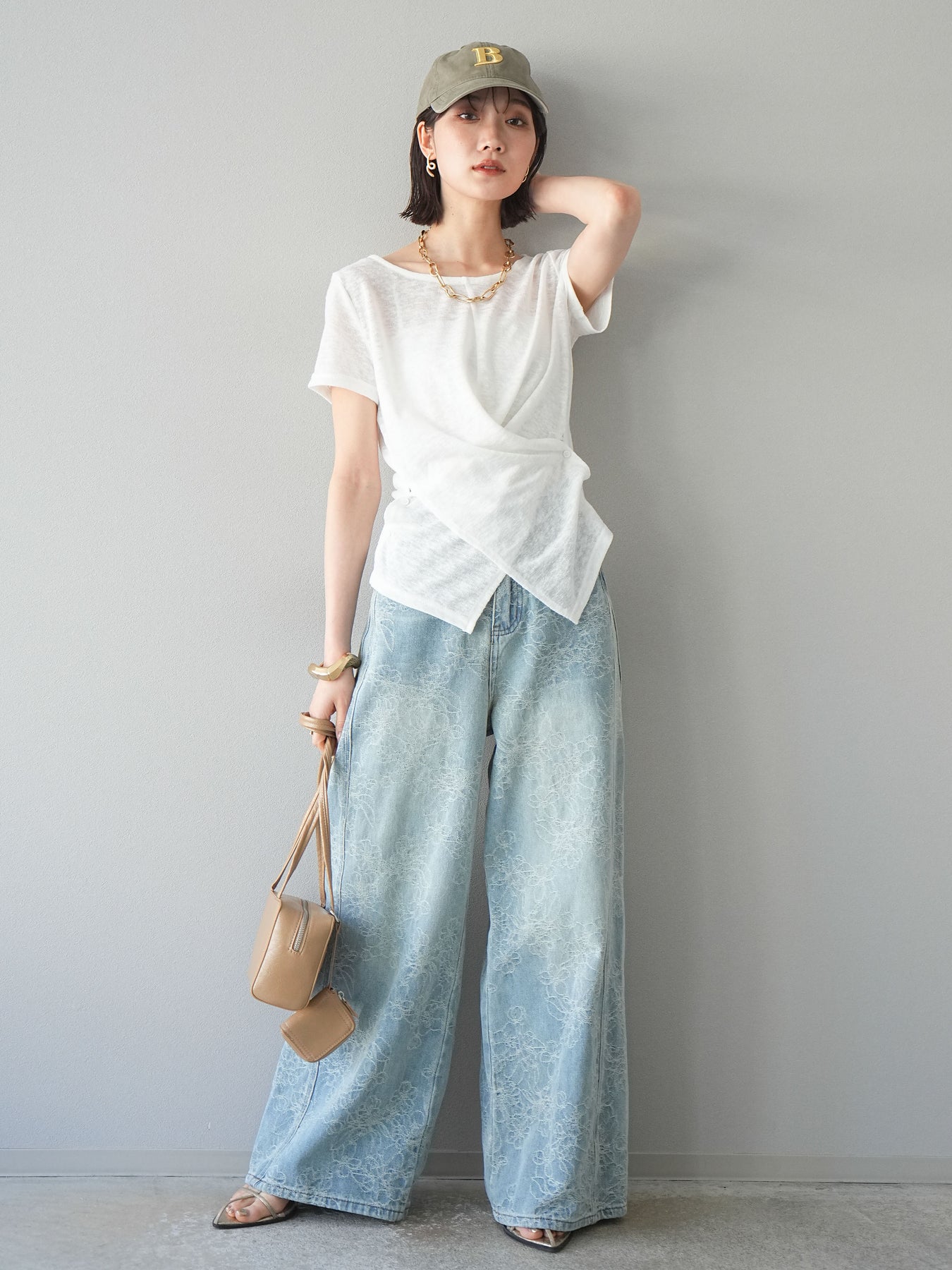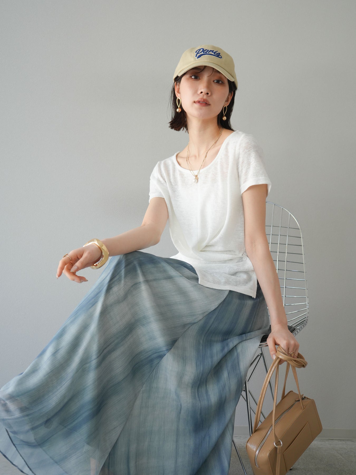 軽やかな透け感が魅力の、カシュクールデザインのシアーニットプルオーバー。やわらかく伸縮性のあるニット素材で、さらりとした着心地と女性らしい抜け感を兼ね備えた一枚です。フロントのドレープが自然にウエストラインをカバーしつつ、ラフになりすぎずこなれた印象に。パンツにもスカートにも合わせやすく、インナーとのレイヤードスタイルも楽しめます。春夏のデイリースタイルにぴったりな、上品カジュアルアイテムです。 ※ボトムス、キャミソール(インナー)以外の商品は一律でインナーは付属していません。