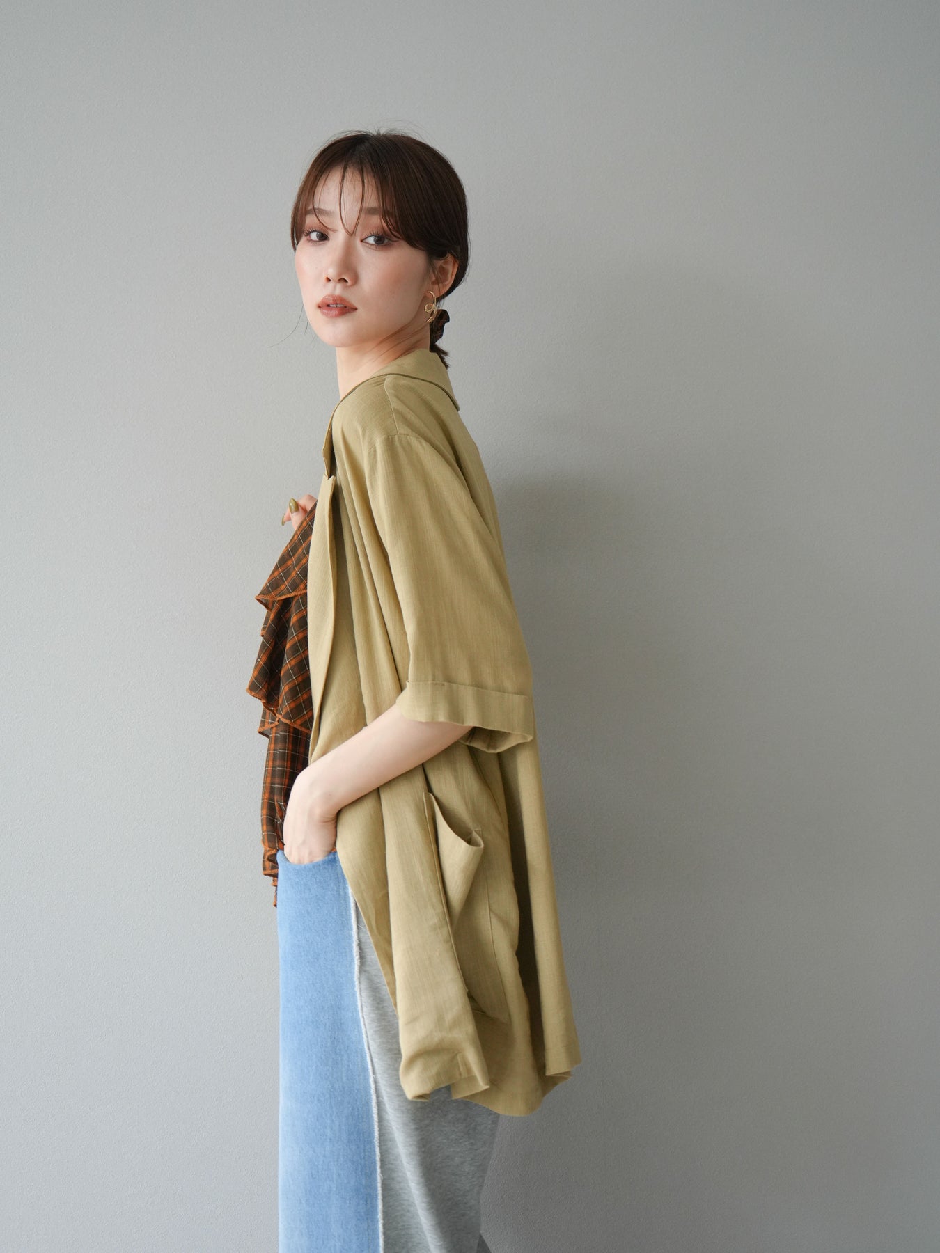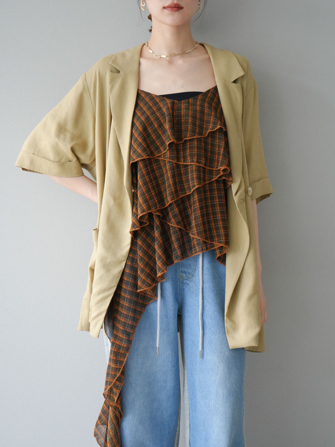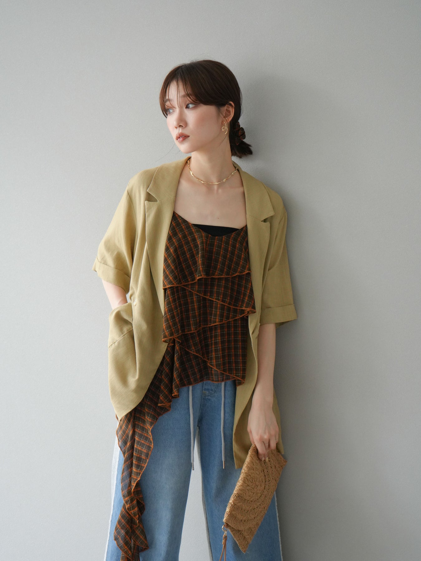 クラシカルなチェック柄に、ボリューム感たっぷりのラッフルをあしらったキャミソール。アシンメトリーに重なるラッフルデザインが動きを生み、スタイリングに華やかさと軽やかさをプラスしてくれます。 細めの肩紐が華奢な印象を与えつつ、リラクシーなフレアシルエットで体のラインを拾わない快適な着心地。1枚ではもちろん、インナーにTシャツを合わせたレイヤードスタイルもおすすめです。 存在感がありながらも抜け感のある、大人の夏にぴったりな主役トップスです。 ※ボトムス、キャミソール(インナー)以外の商品は一律でインナーは付属していません。