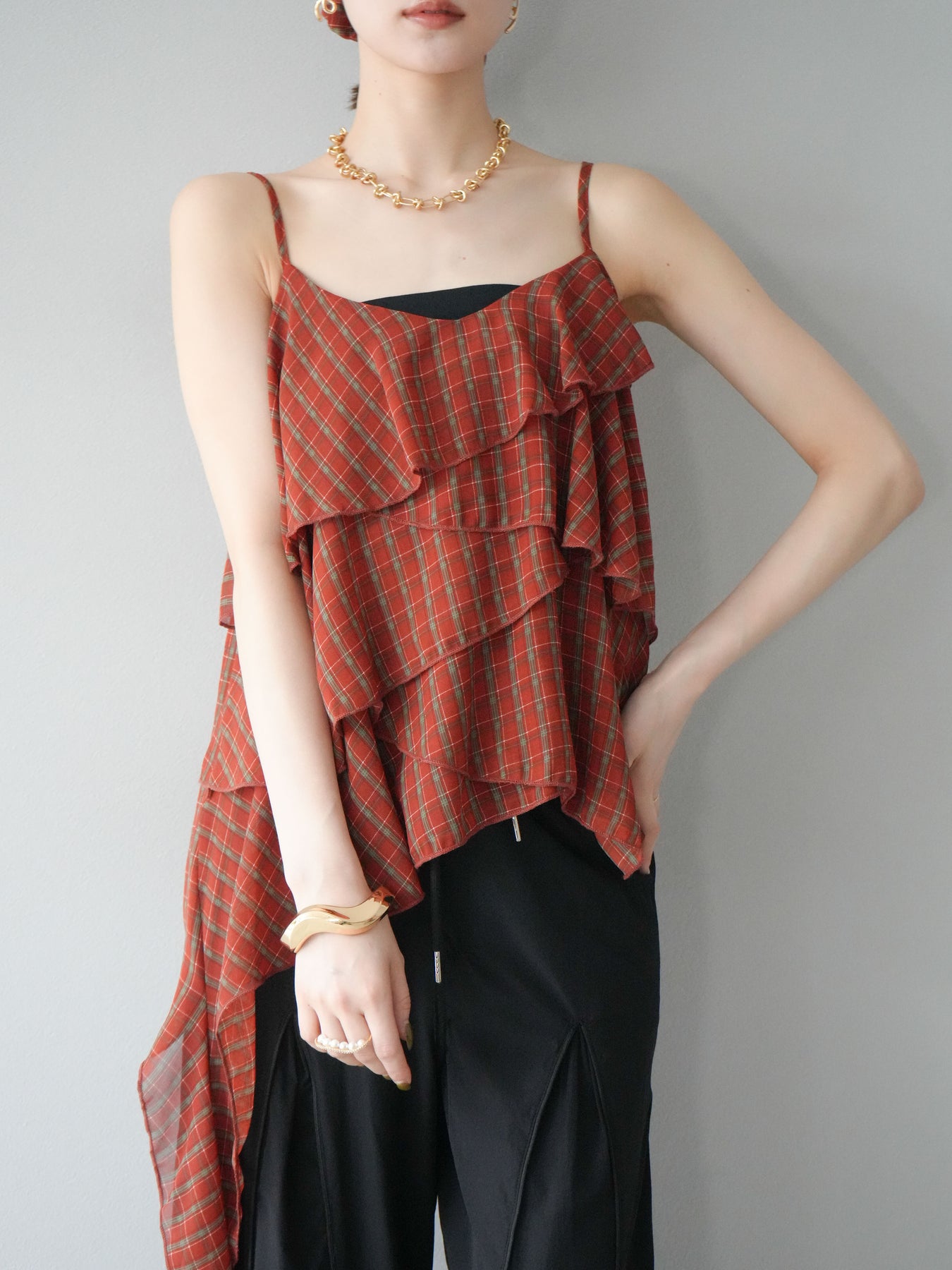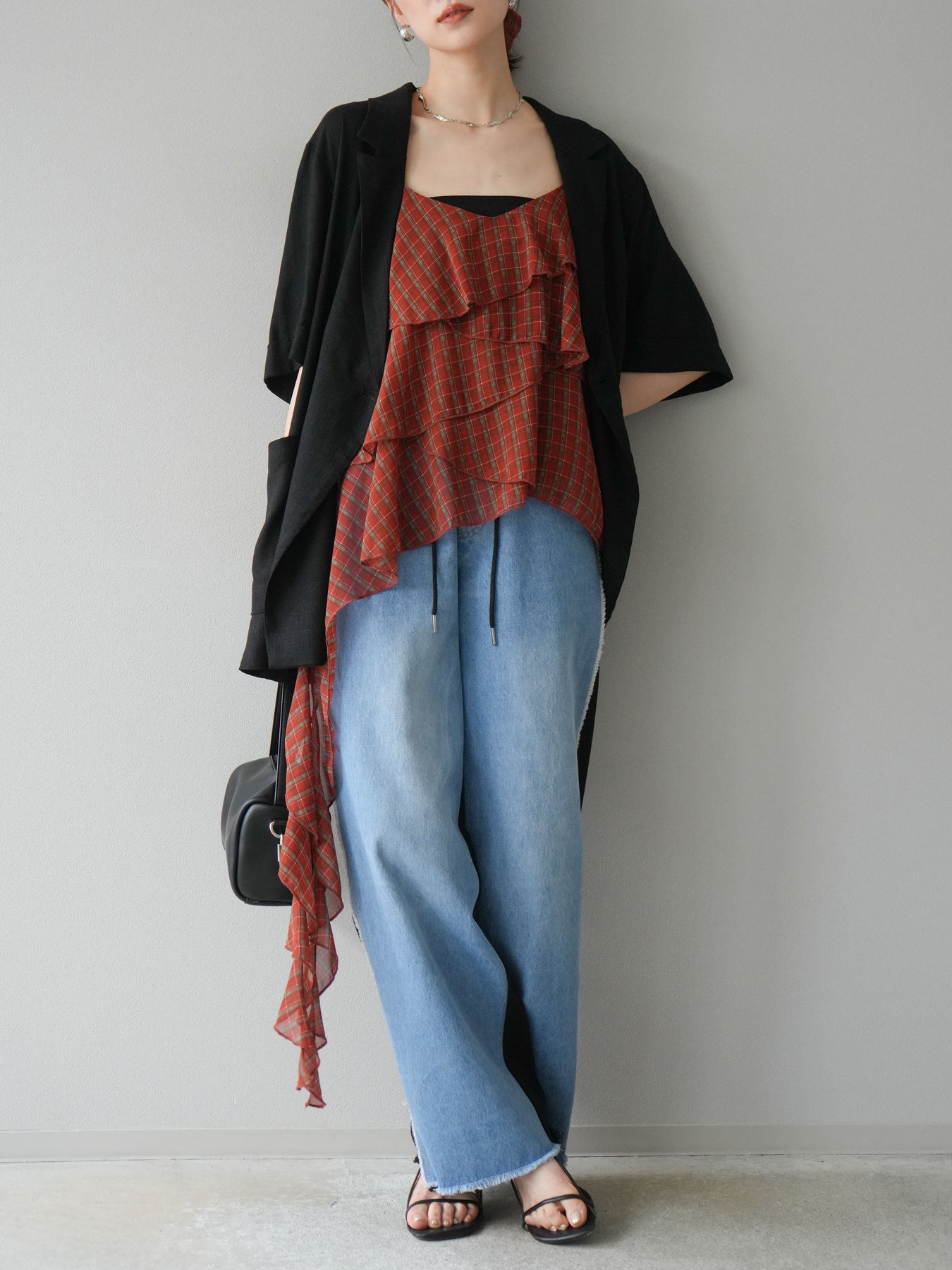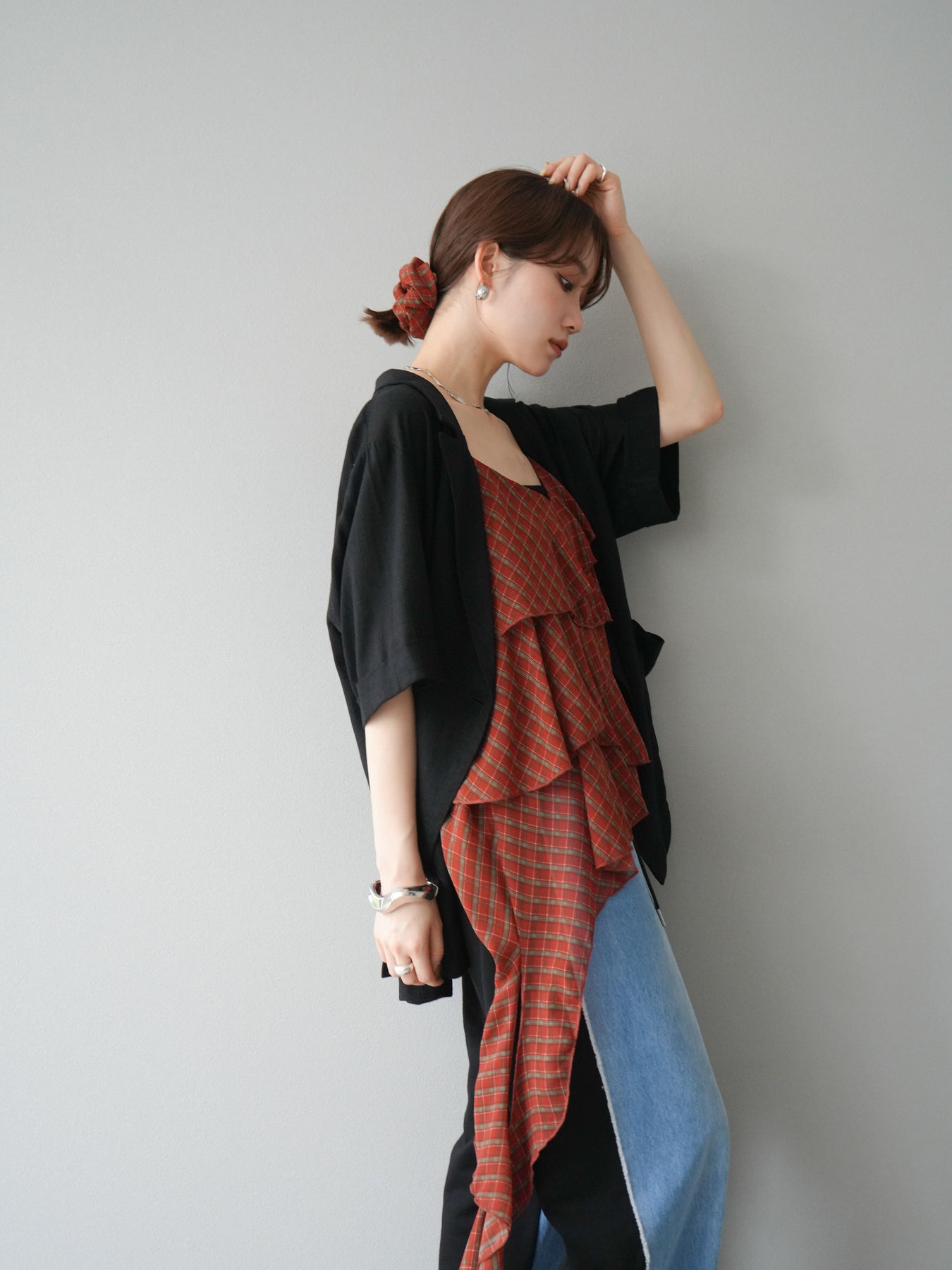 クラシカルなチェック柄に、ボリューム感たっぷりのラッフルをあしらったキャミソール。アシンメトリーに重なるラッフルデザインが動きを生み、スタイリングに華やかさと軽やかさをプラスしてくれます。 細めの肩紐が華奢な印象を与えつつ、リラクシーなフレアシルエットで体のラインを拾わない快適な着心地。1枚ではもちろん、インナーにTシャツを合わせたレイヤードスタイルもおすすめです。 存在感がありながらも抜け感のある、大人の夏にぴったりな主役トップスです。 ※ボトムス、キャミソール(インナー)以外の商品は一律でインナーは付属していません。
