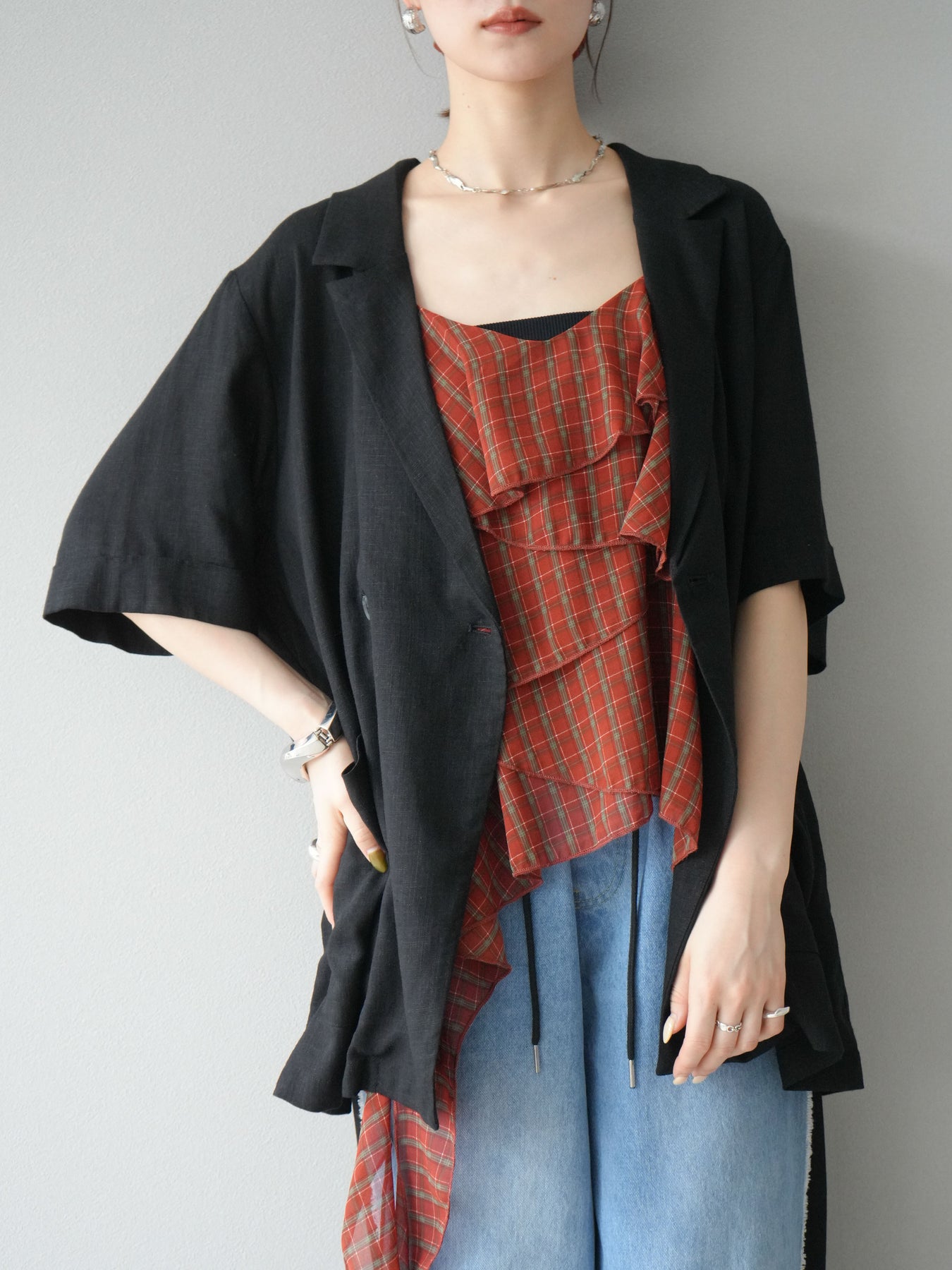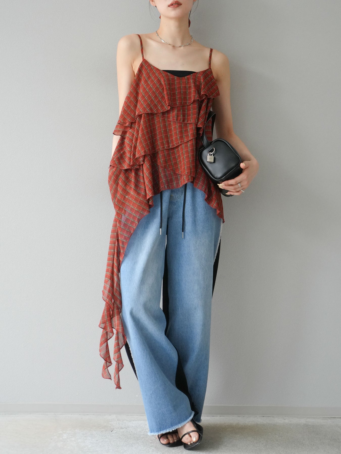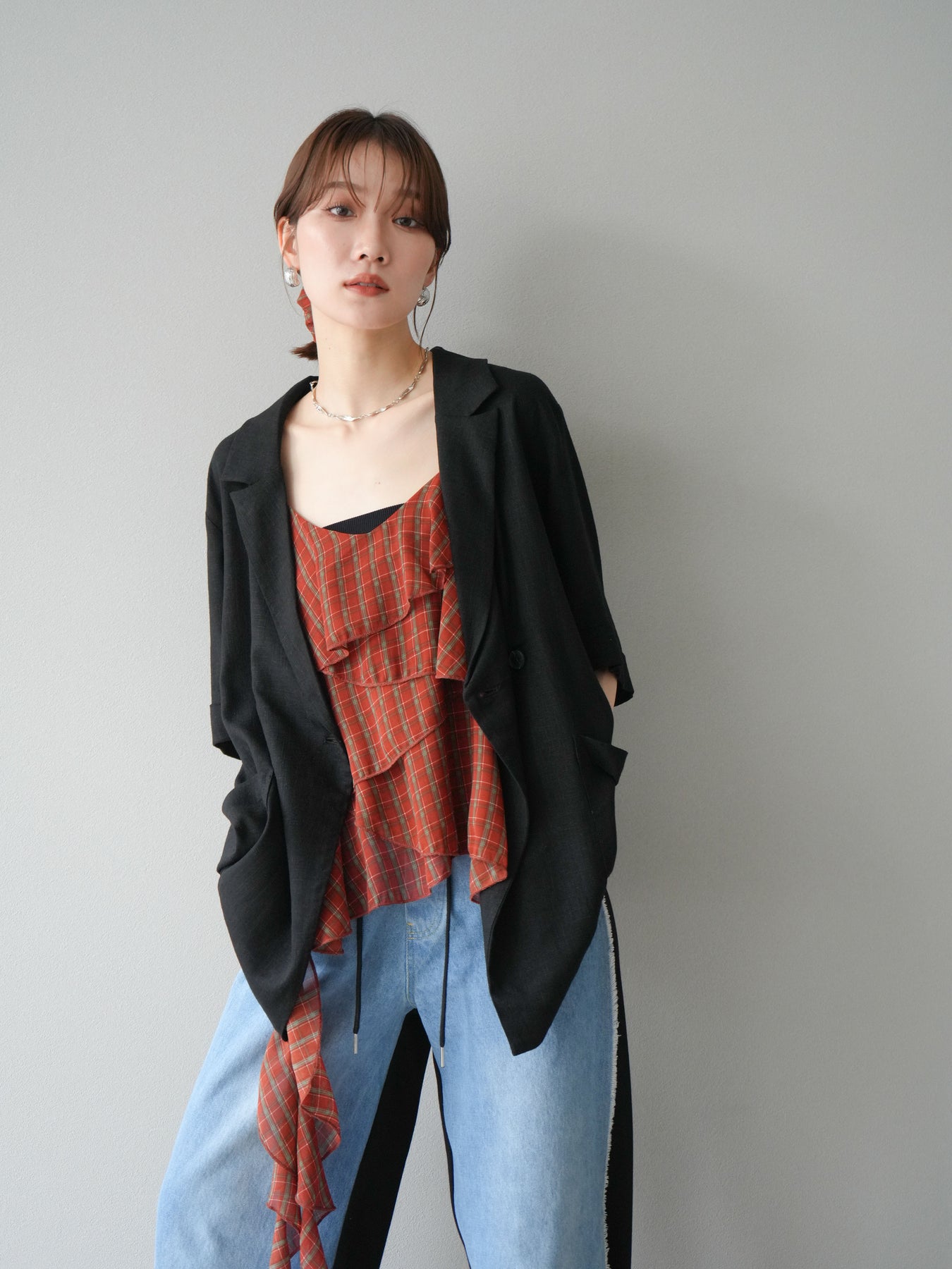 クラシカルなチェック柄に、ボリューム感たっぷりのラッフルをあしらったキャミソール。アシンメトリーに重なるラッフルデザインが動きを生み、スタイリングに華やかさと軽やかさをプラスしてくれます。 細めの肩紐が華奢な印象を与えつつ、リラクシーなフレアシルエットで体のラインを拾わない快適な着心地。1枚ではもちろん、インナーにTシャツを合わせたレイヤードスタイルもおすすめです。 存在感がありながらも抜け感のある、大人の夏にぴったりな主役トップスです。 ※ボトムス、キャミソール(インナー)以外の商品は一律でインナーは付属していません。