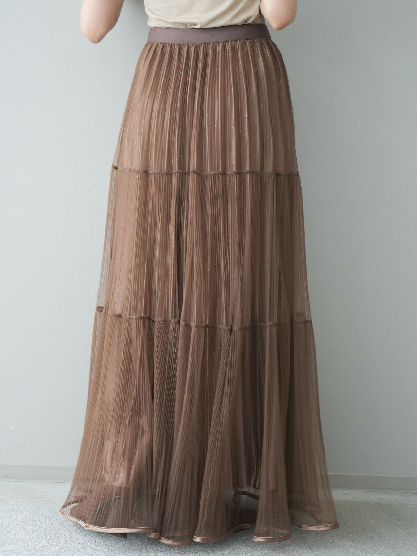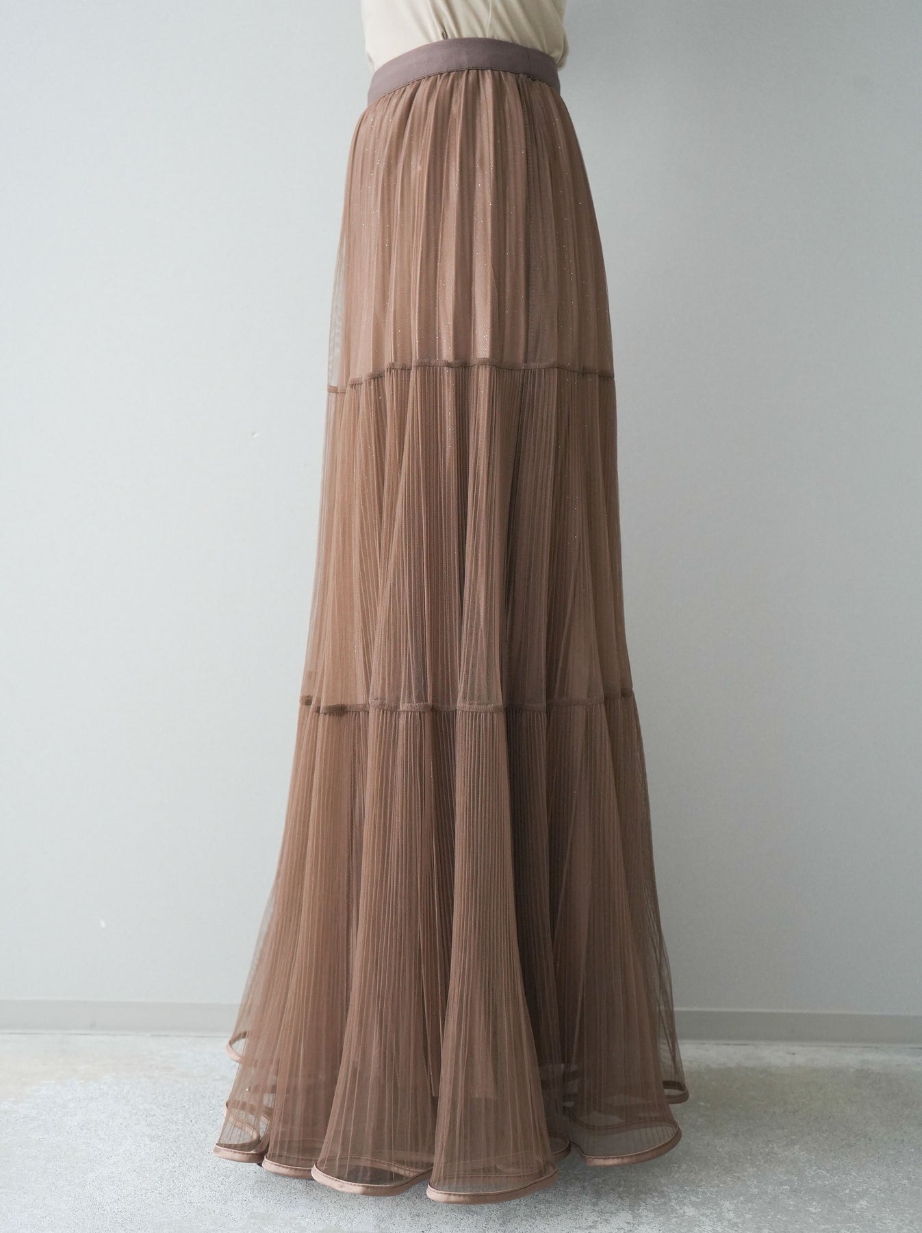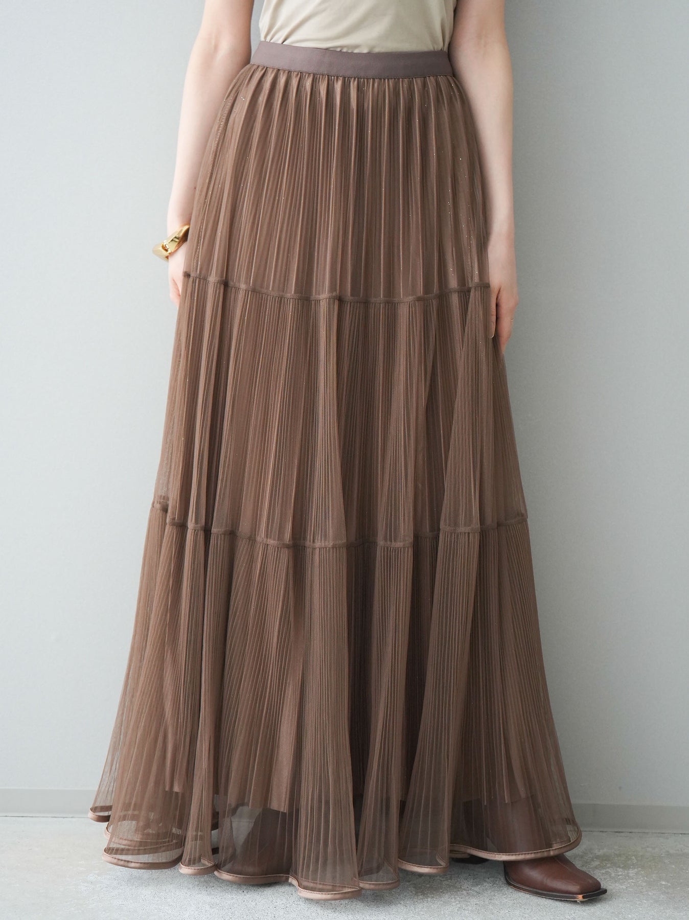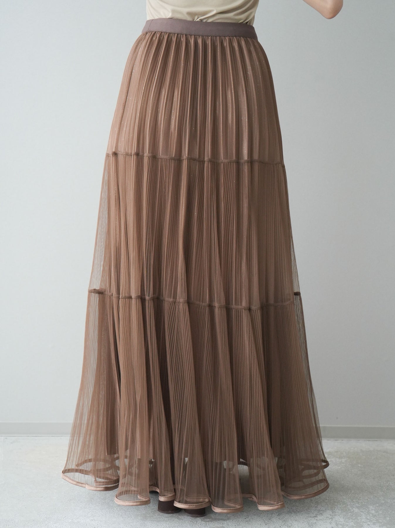 [予約]ラメプリーツレイヤードチュールロングスカート/mocha