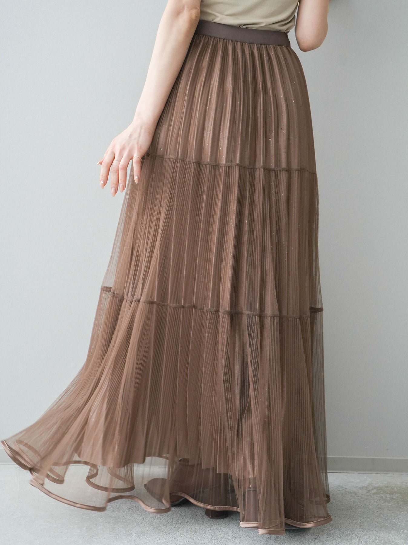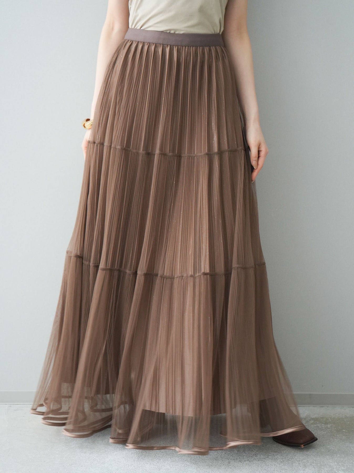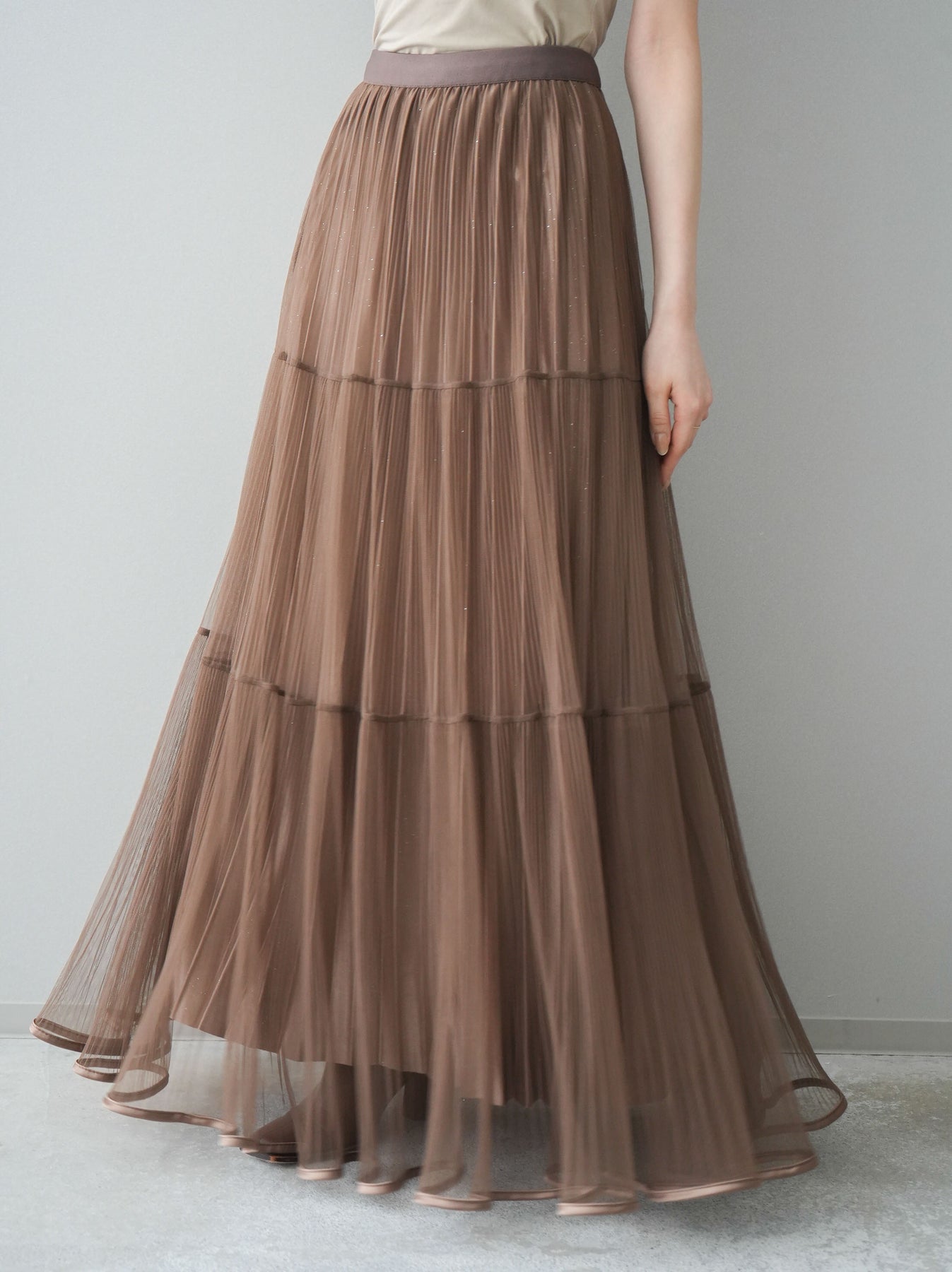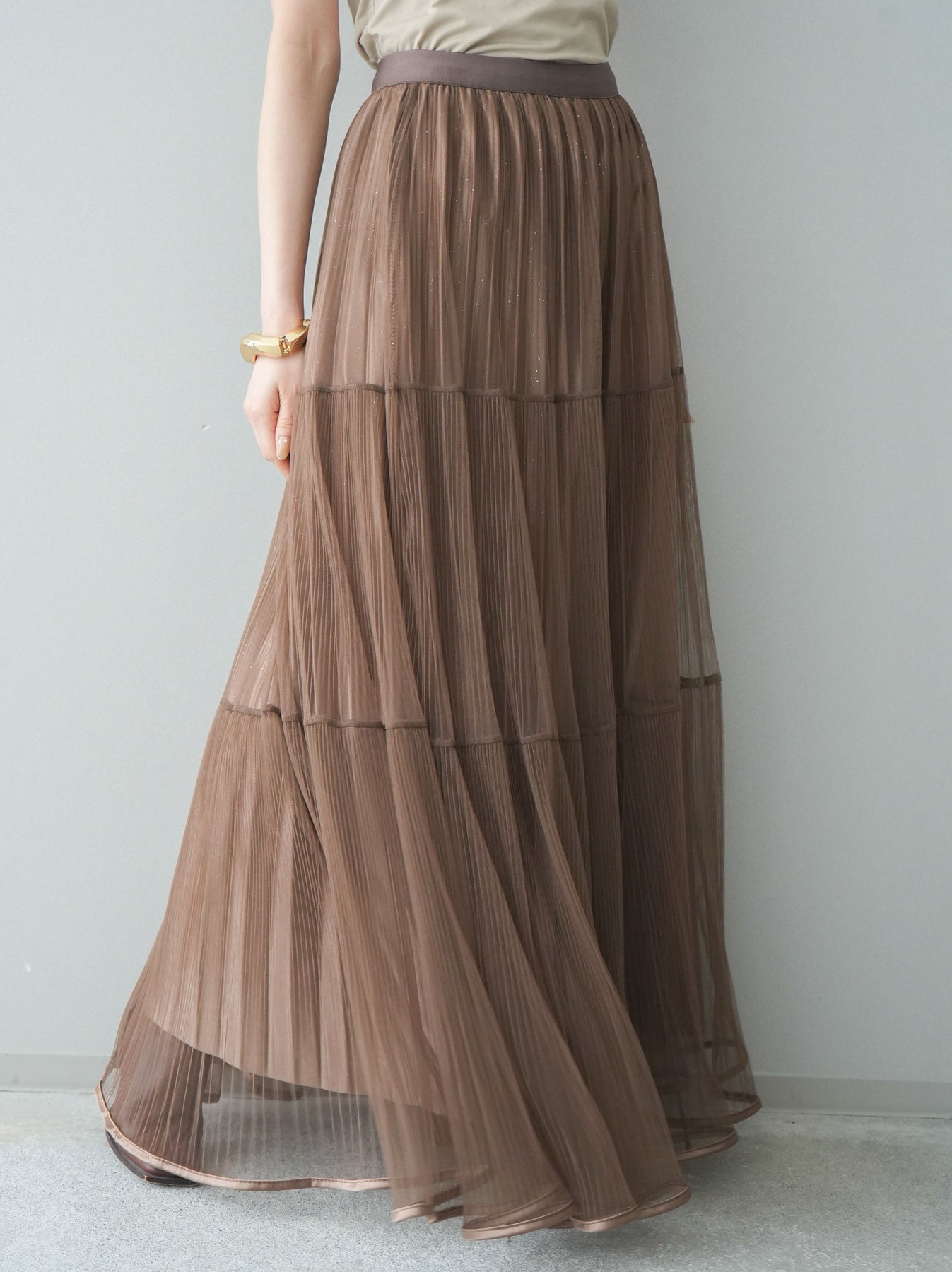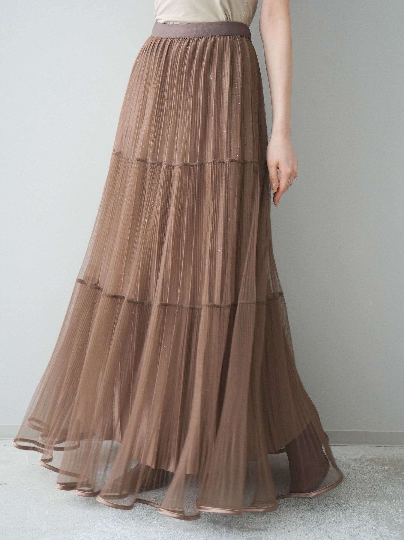 [予約]ラメプリーツレイヤードチュールロングスカート/mocha