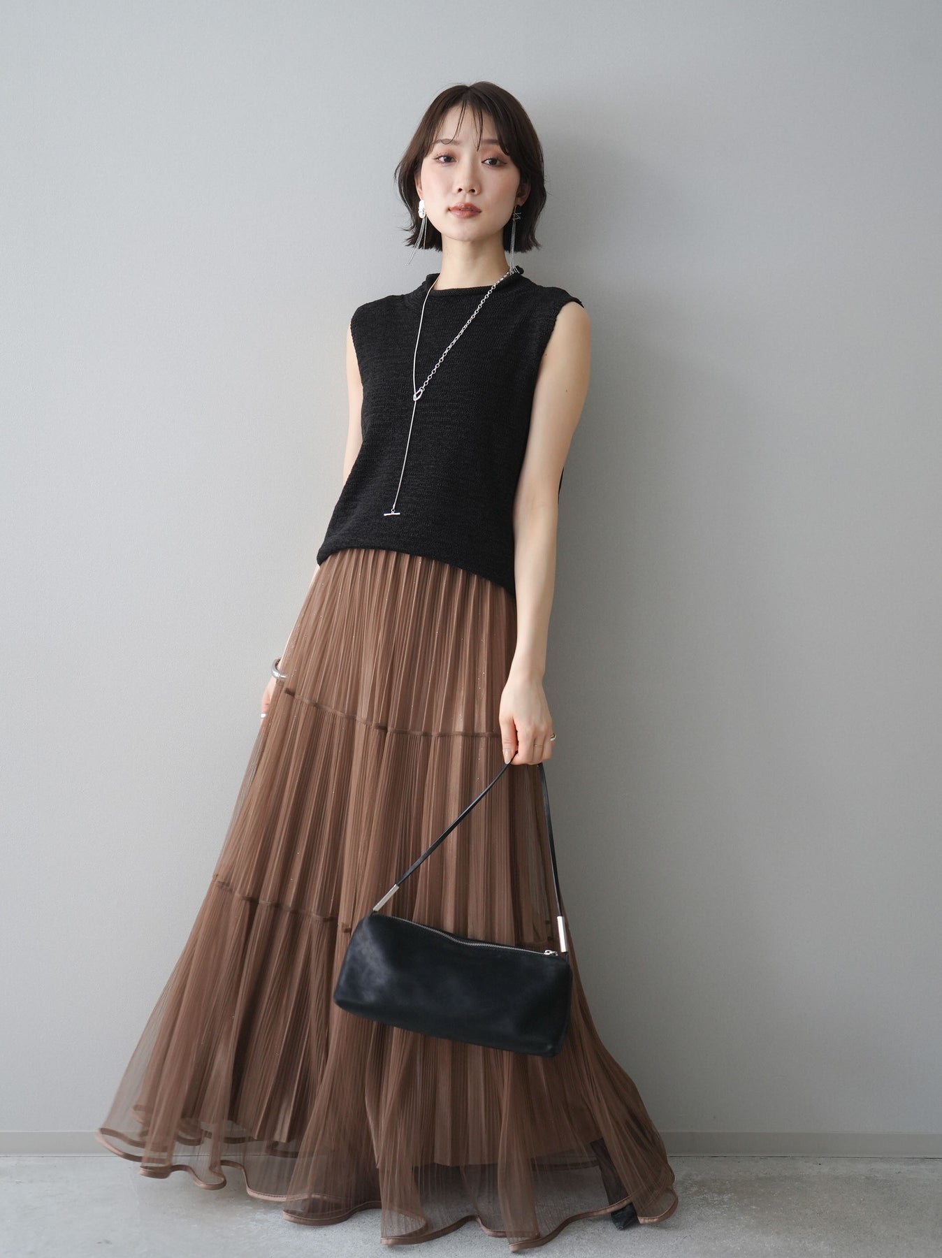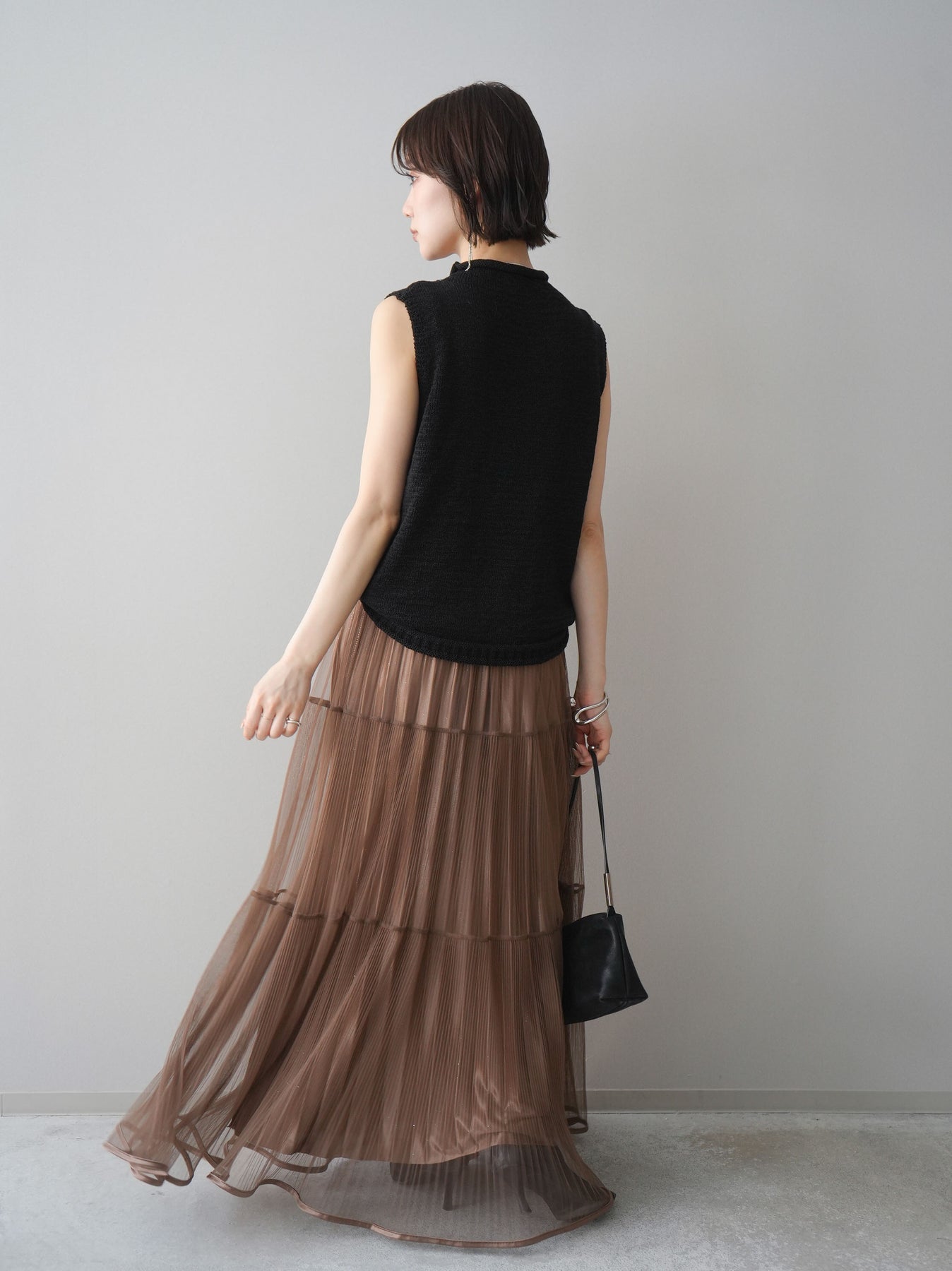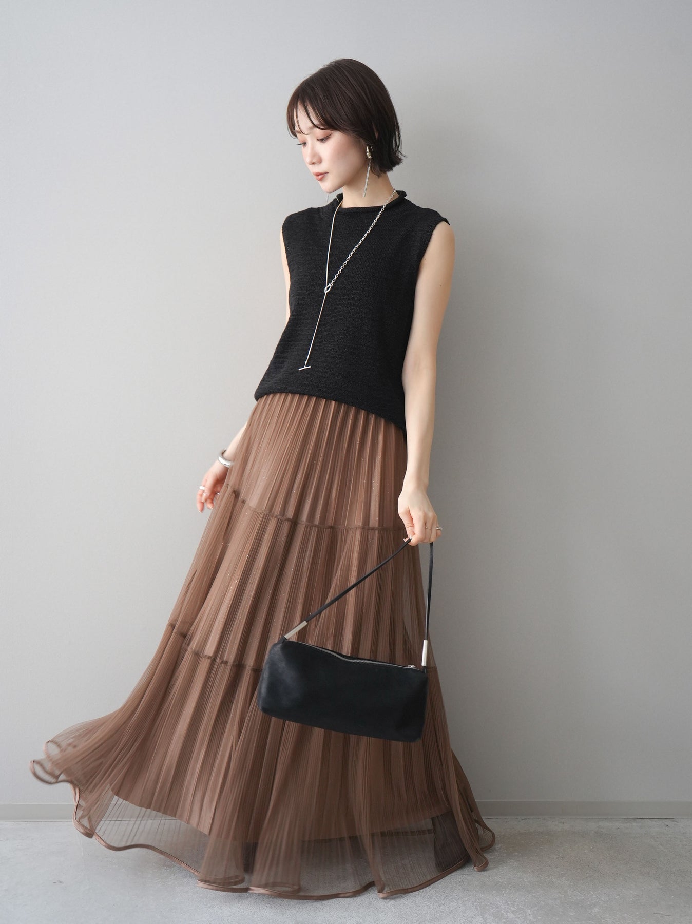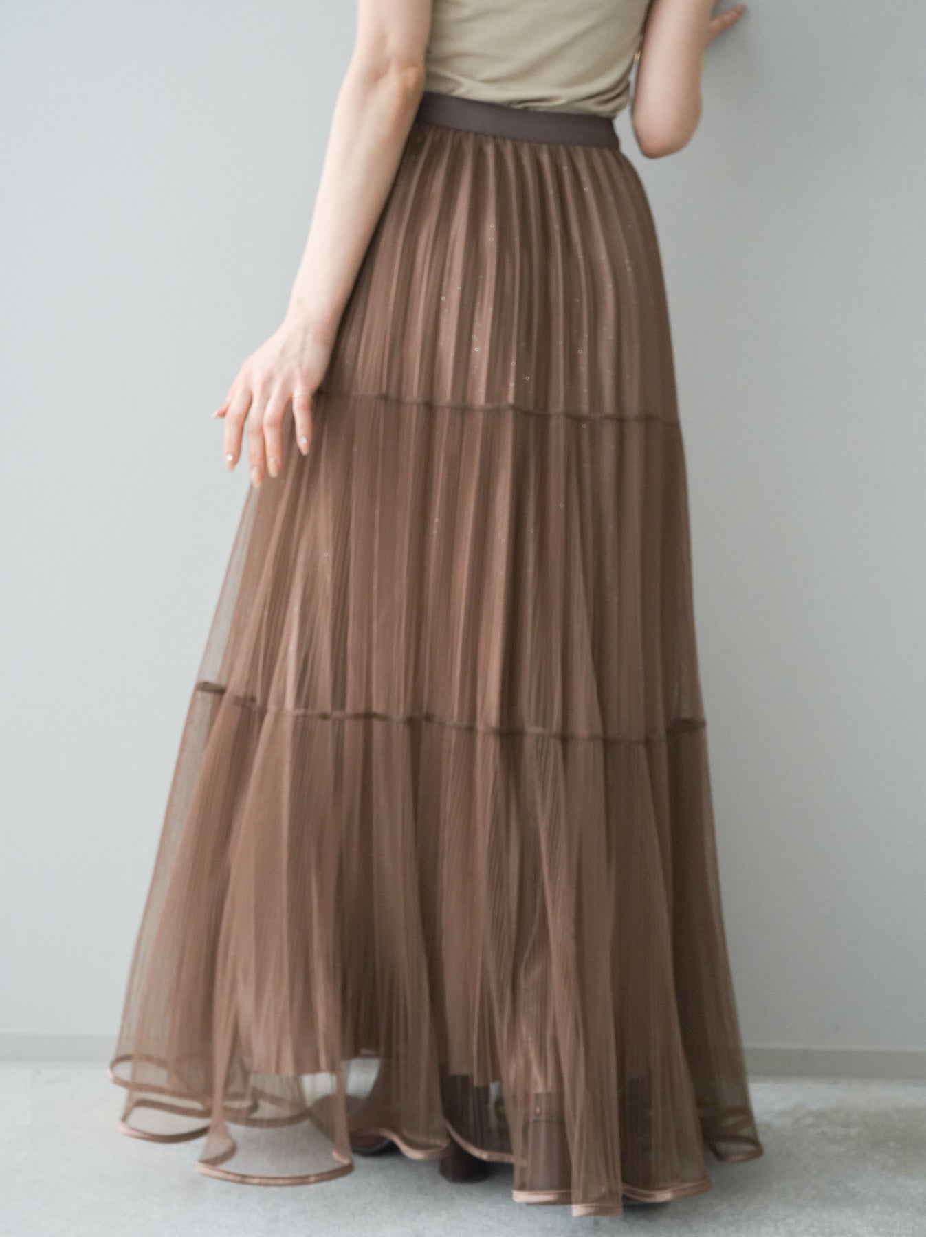 [予約]ラメプリーツレイヤードチュールロングスカート/mocha
