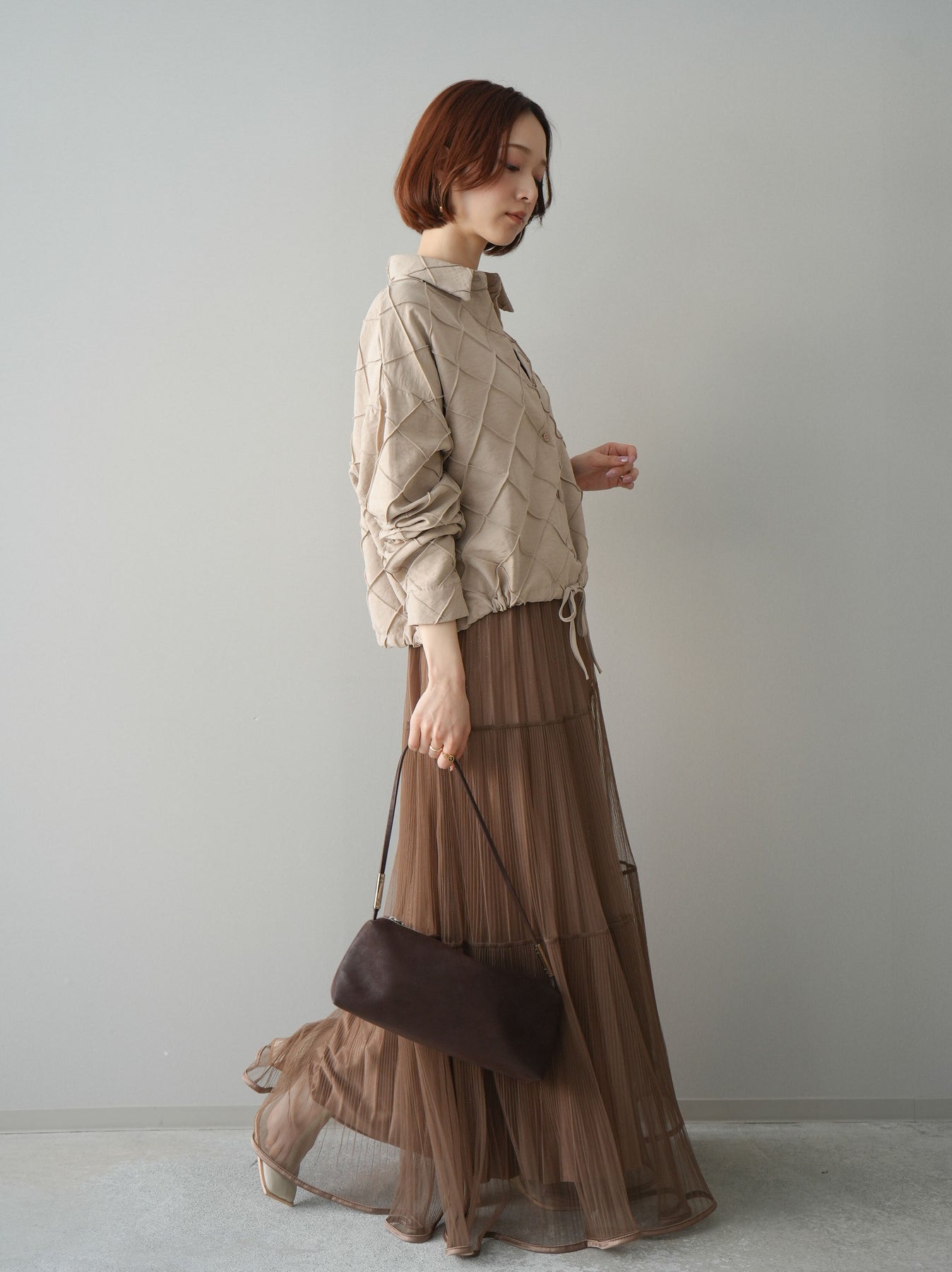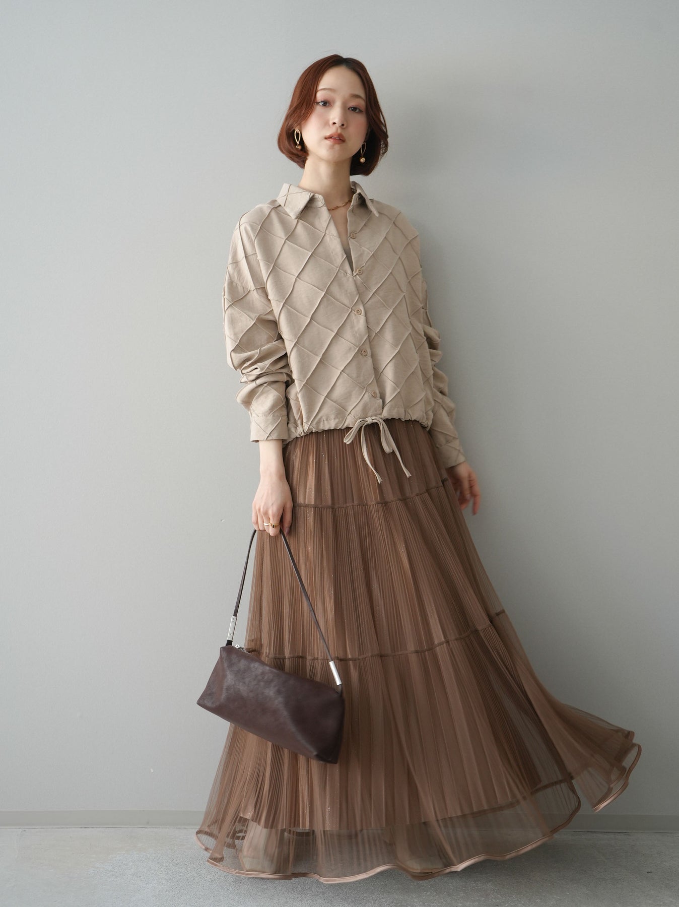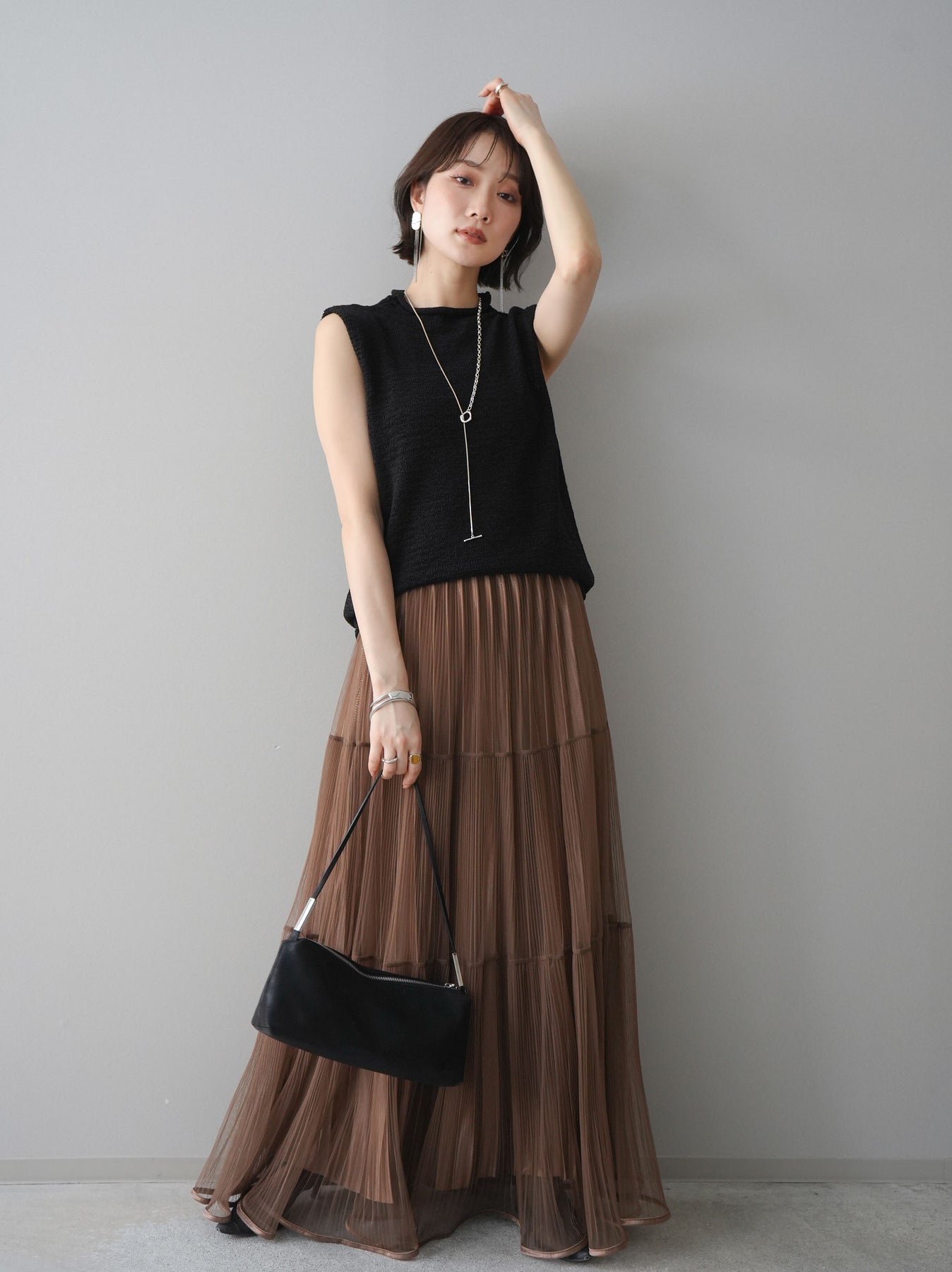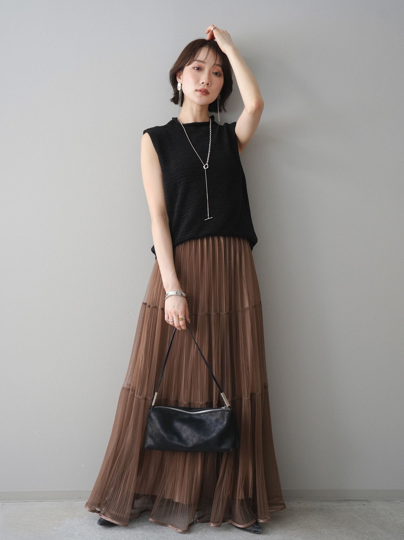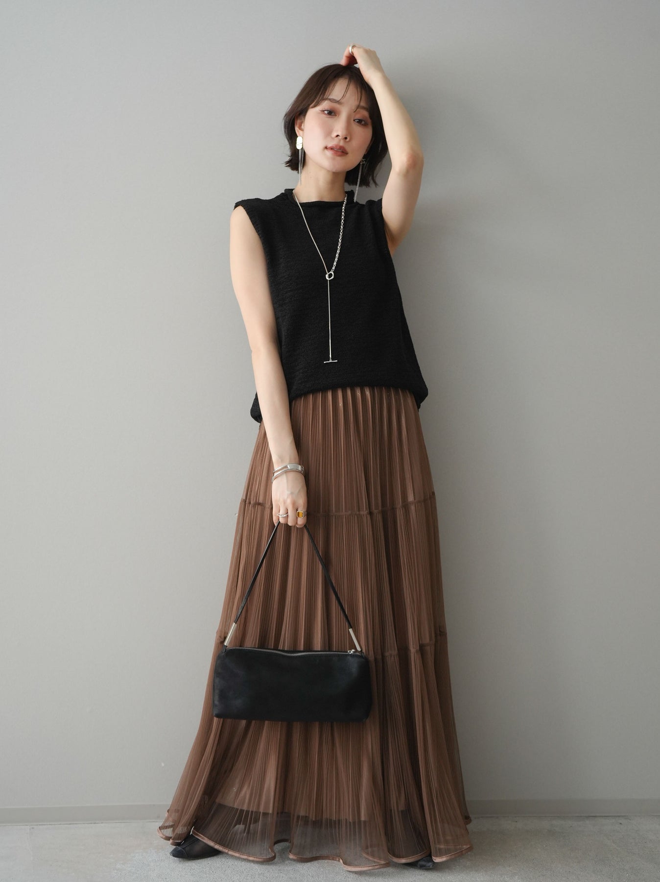 [予約]ラメプリーツレイヤードチュールロングスカート/mocha