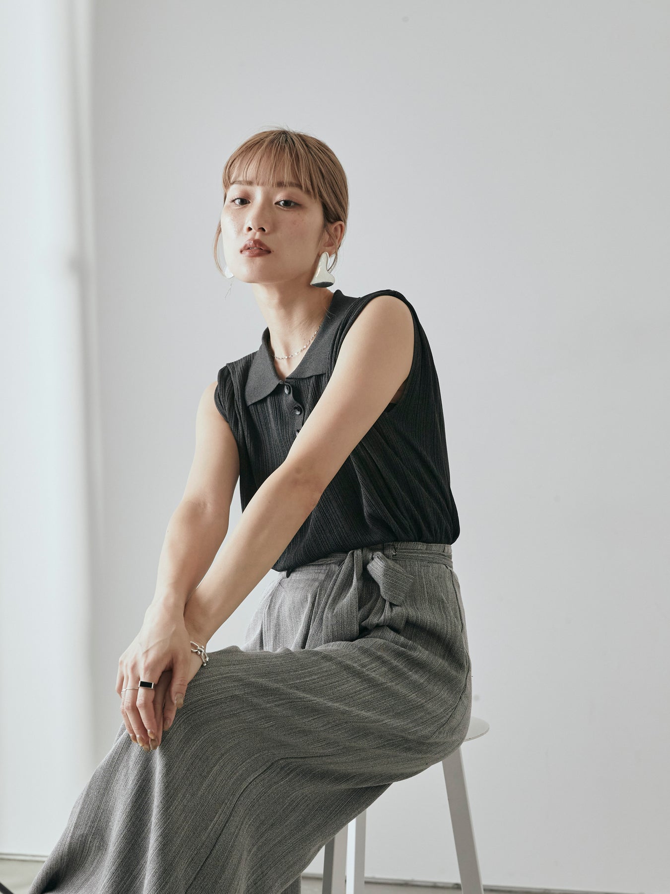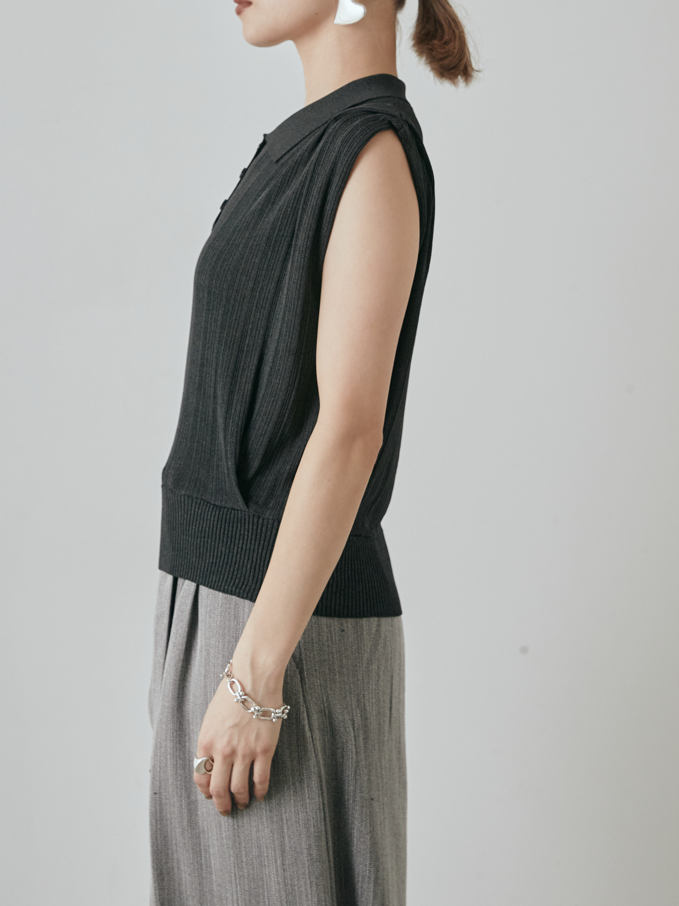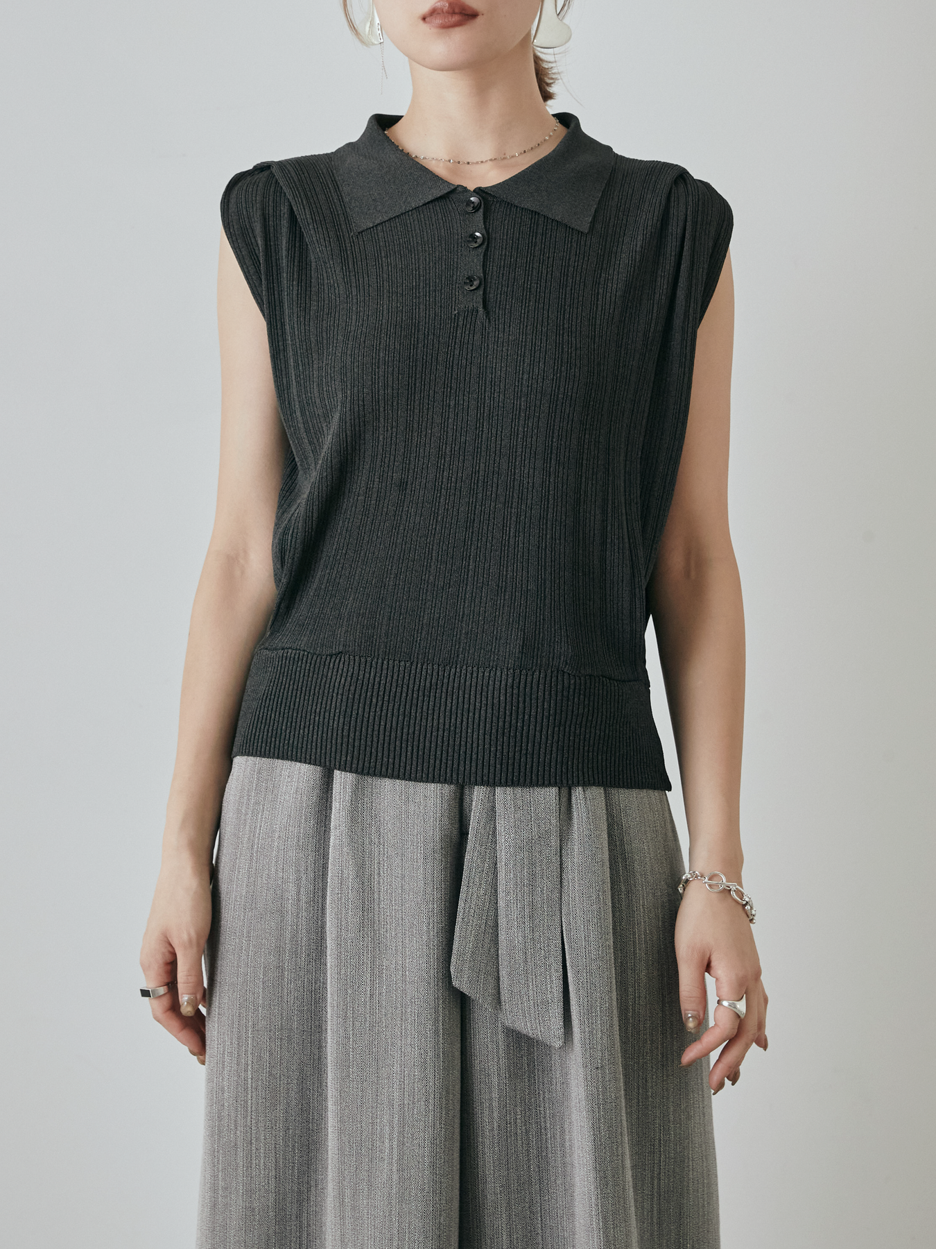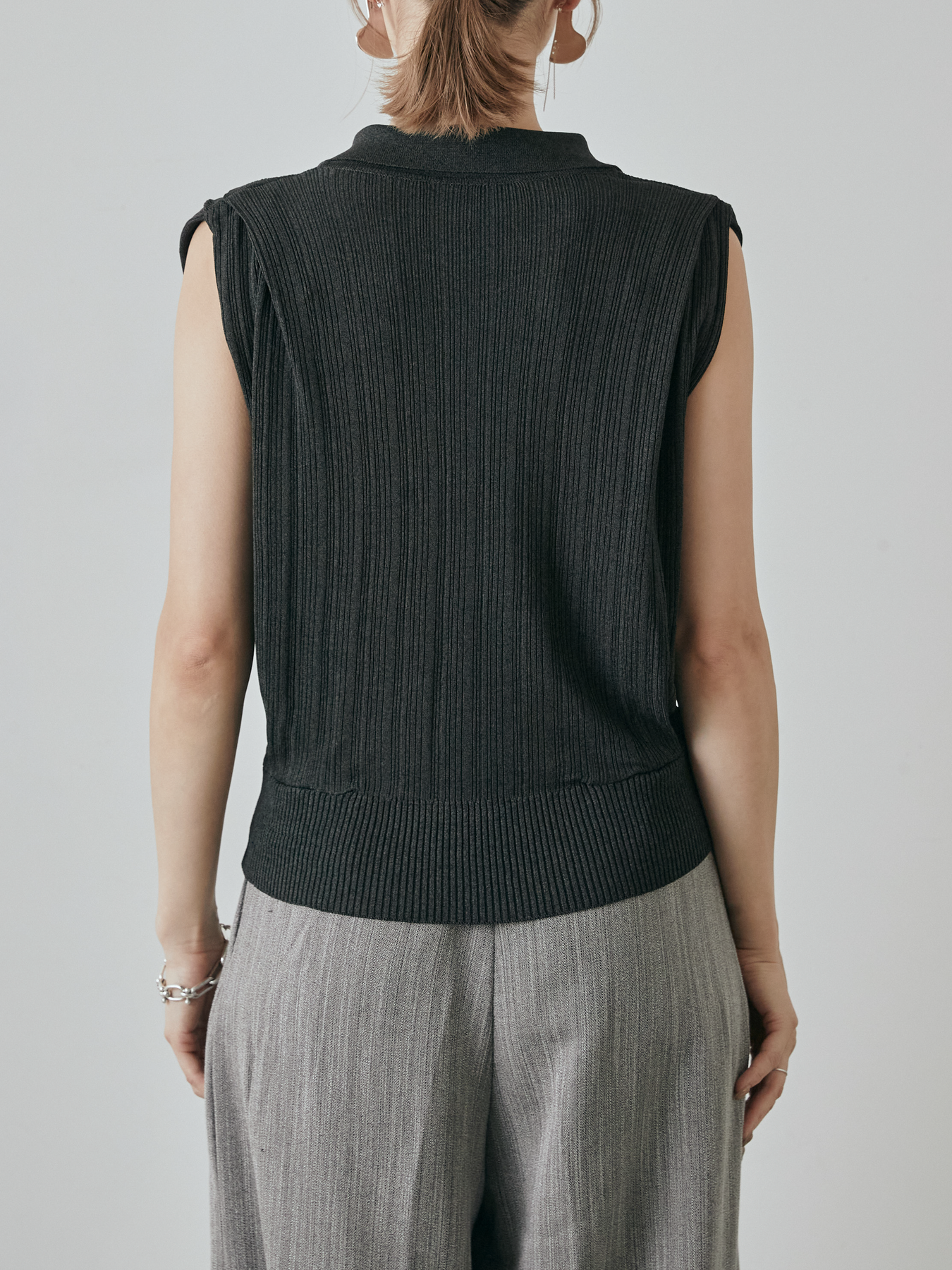 ランダムピッチのリブ編みがさりげなく表情を生み出す、クラシカルな印象のポロニットベスト。 ノースリーブながらも肩にかかるスリーブラインと襟付きデザインで、きちんと感と抜け感を両立した一枚です。 やわらかなニット素材がボディに優しくフィットし、コンパクトすぎない絶妙なシルエットに。 バスト上はほんのり透け感のある編地で、さりげないニュアンスをプラスしています。 パンツにもスカートにも合わせやすく、インでもアウトでも着映えする万能トップス。 ジャケットのインナーとしても活躍し、ロングシーズン使えるベーシックアイテムです。