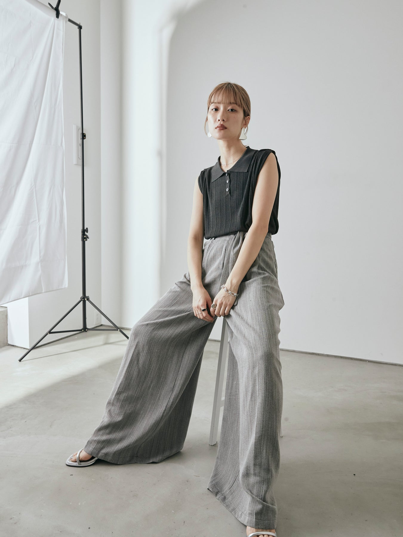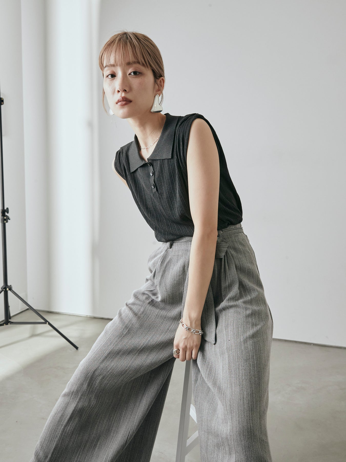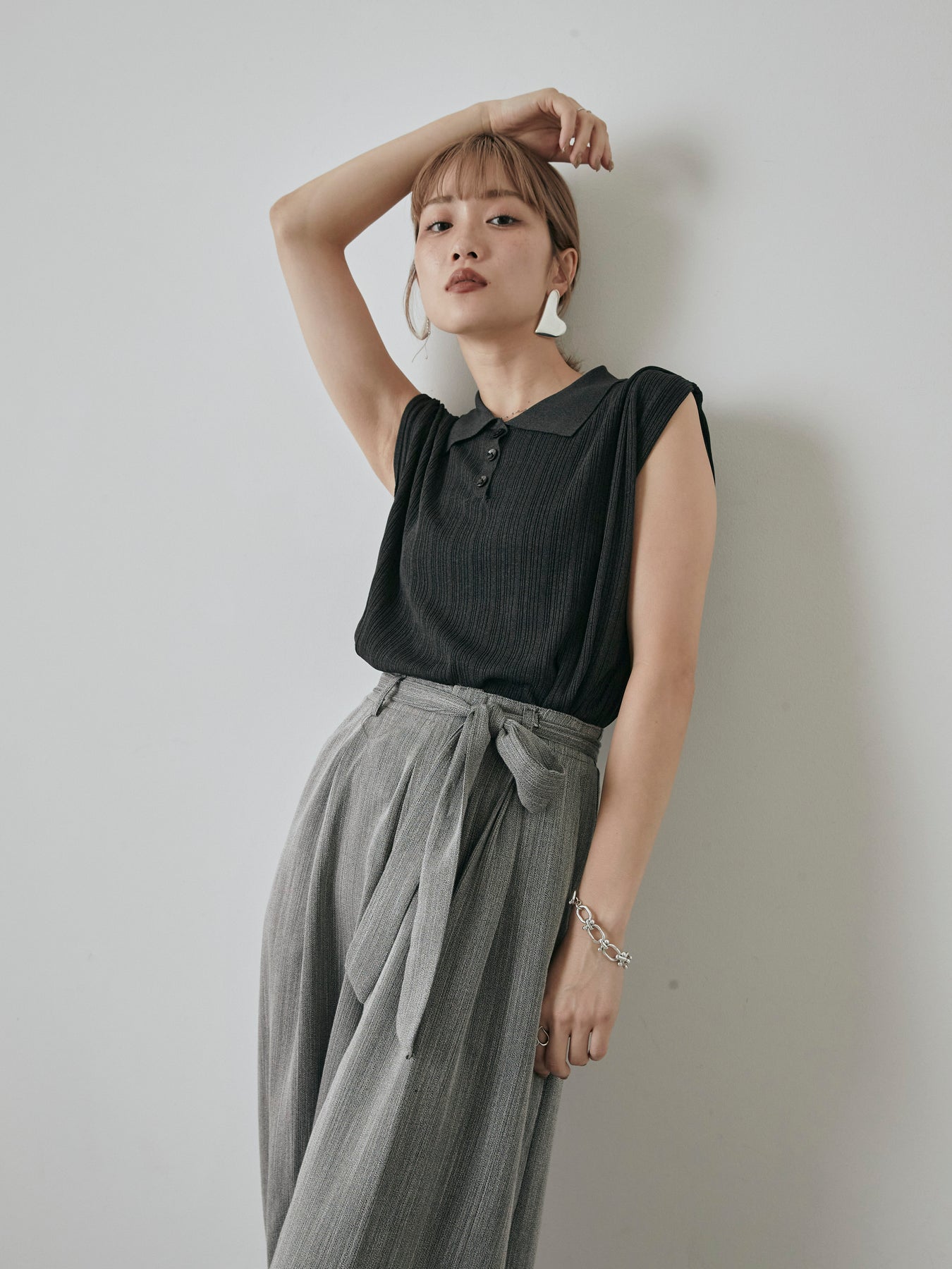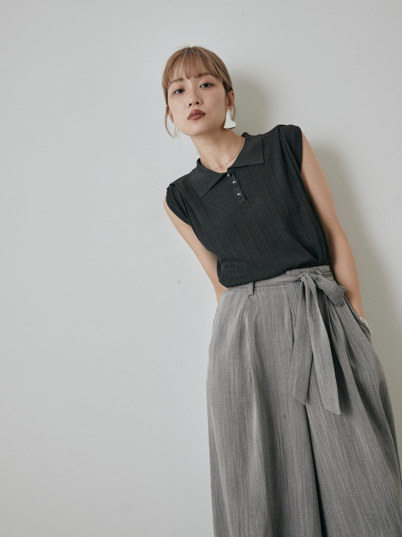 ランダムピッチのリブ編みがさりげなく表情を生み出す、クラシカルな印象のポロニットベスト。 ノースリーブながらも肩にかかるスリーブラインと襟付きデザインで、きちんと感と抜け感を両立した一枚です。 やわらかなニット素材がボディに優しくフィットし、コンパクトすぎない絶妙なシルエットに。 バスト上はほんのり透け感のある編地で、さりげないニュアンスをプラスしています。 パンツにもスカートにも合わせやすく、インでもアウトでも着映えする万能トップス。 ジャケットのインナーとしても活躍し、ロングシーズン使えるベーシックアイテムです。