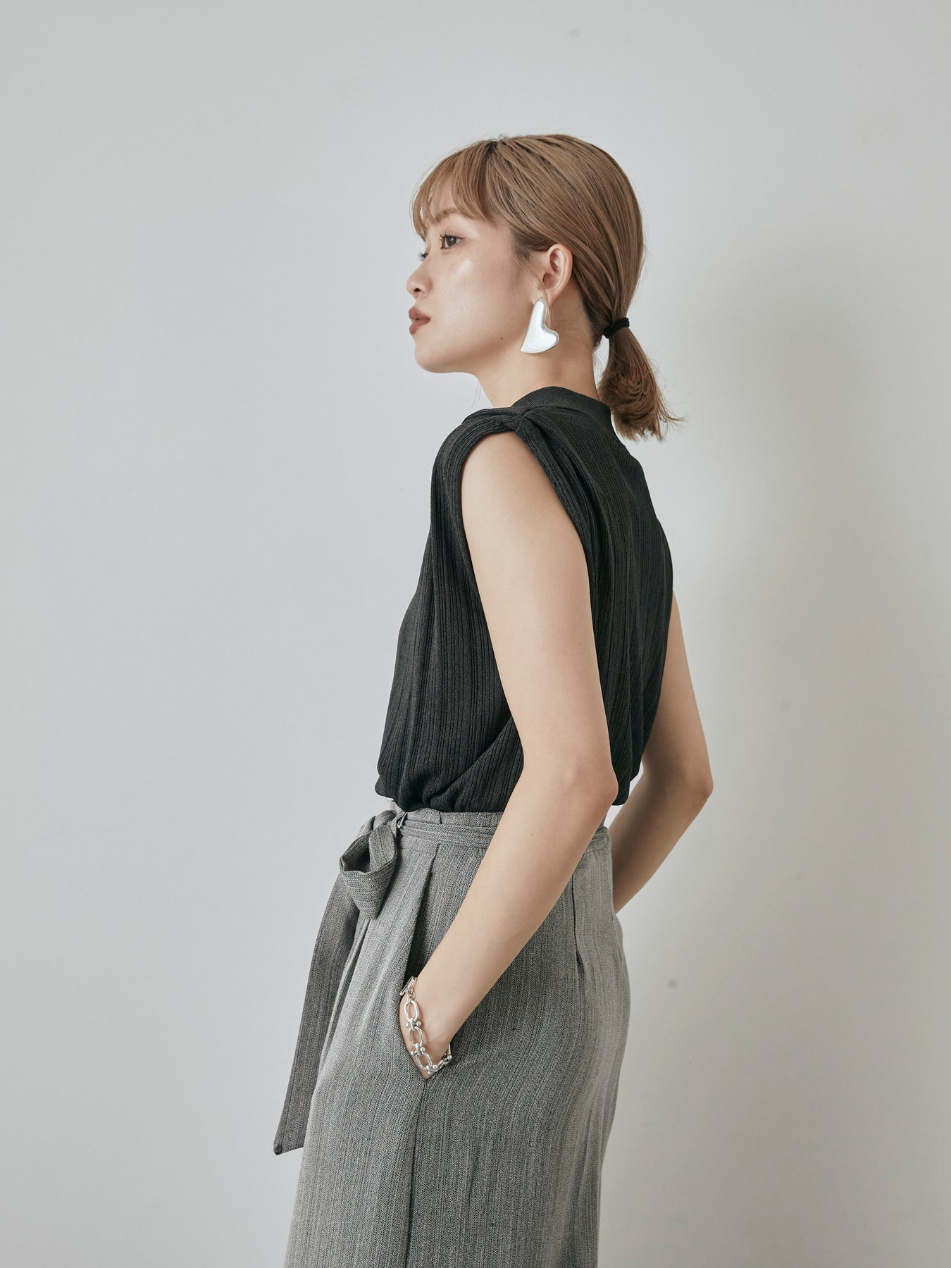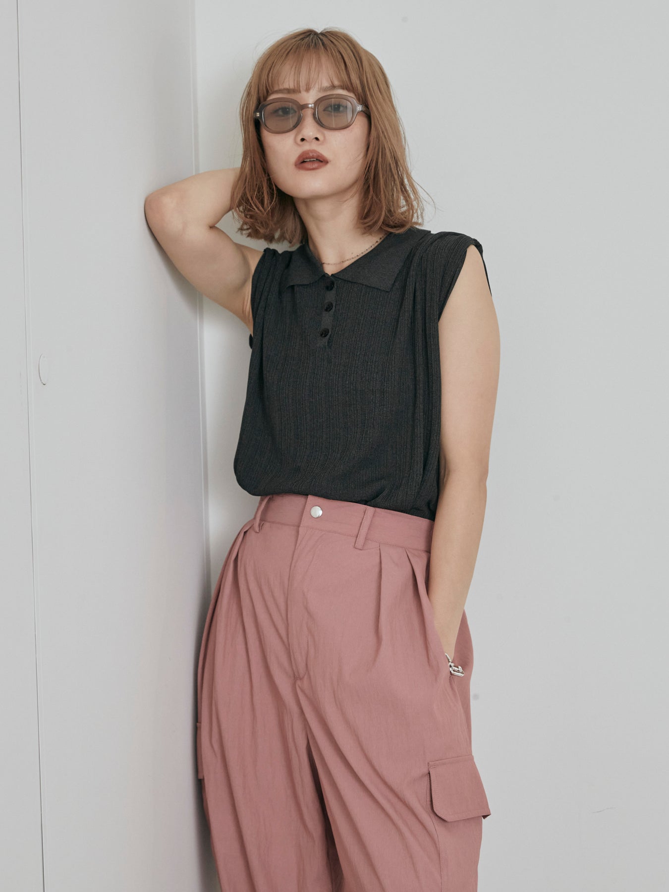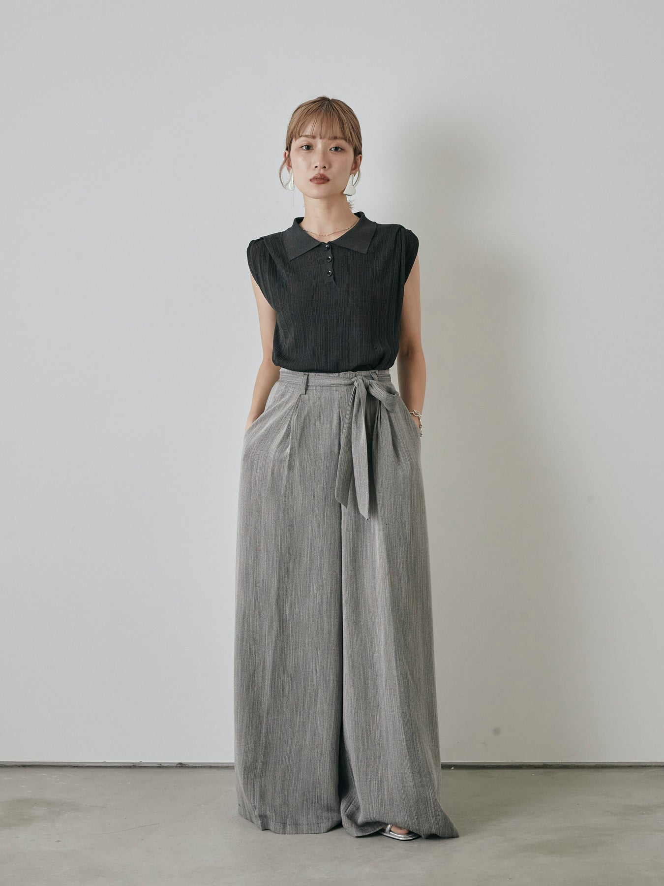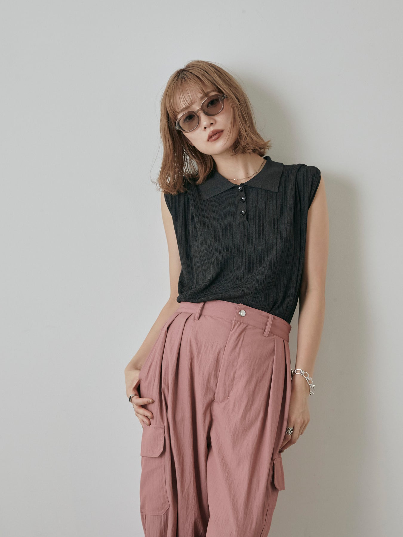 ランダムピッチのリブ編みがさりげなく表情を生み出す、クラシカルな印象のポロニットベスト。 ノースリーブながらも肩にかかるスリーブラインと襟付きデザインで、きちんと感と抜け感を両立した一枚です。 やわらかなニット素材がボディに優しくフィットし、コンパクトすぎない絶妙なシルエットに。 バスト上はほんのり透け感のある編地で、さりげないニュアンスをプラスしています。 パンツにもスカートにも合わせやすく、インでもアウトでも着映えする万能トップス。 ジャケットのインナーとしても活躍し、ロングシーズン使えるベーシックアイテムです。