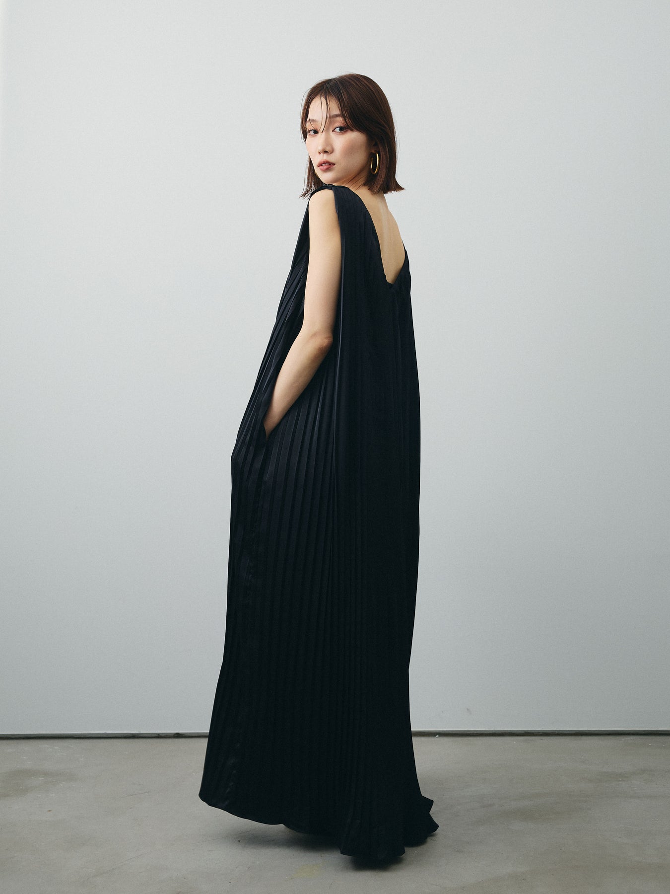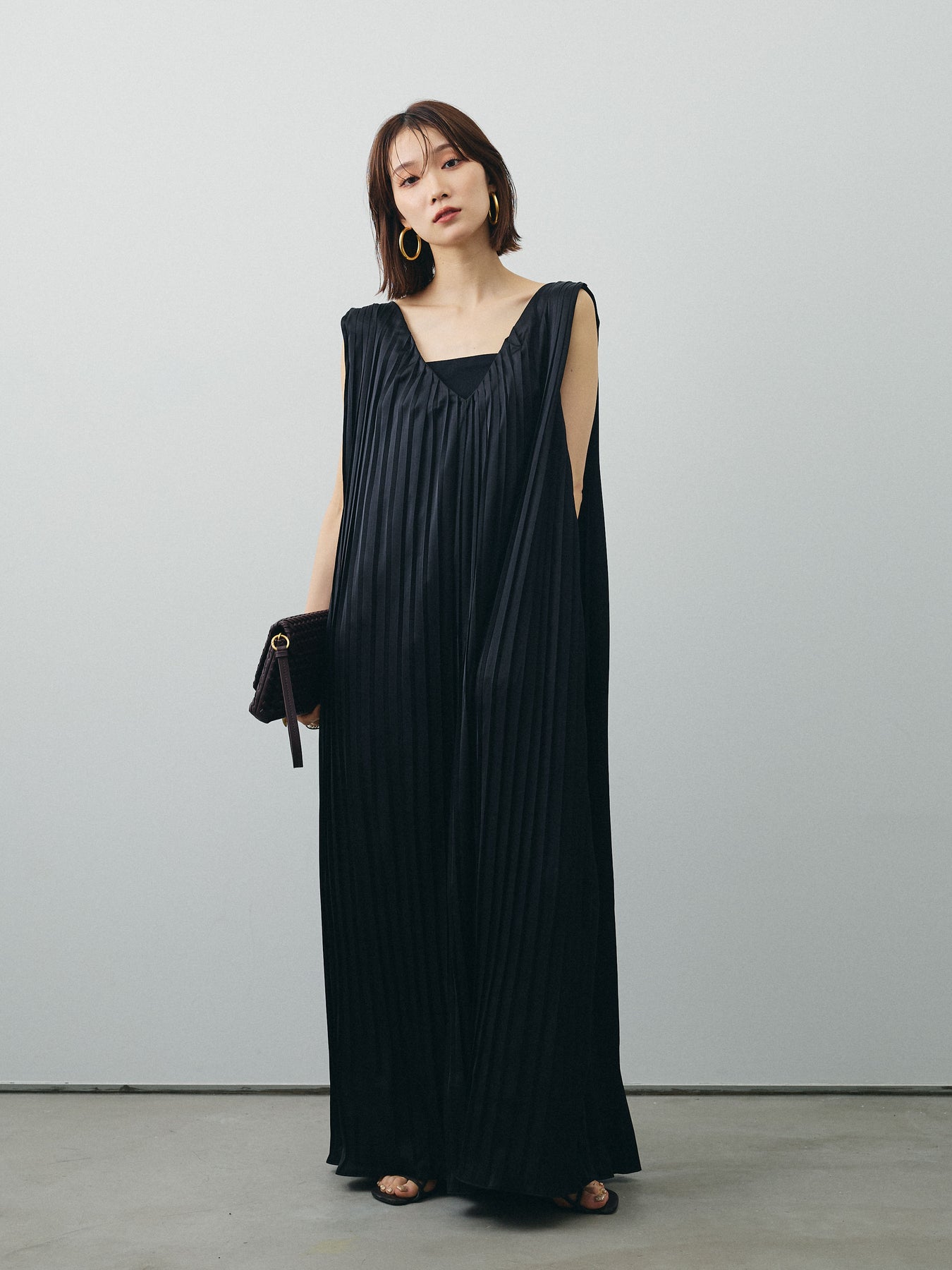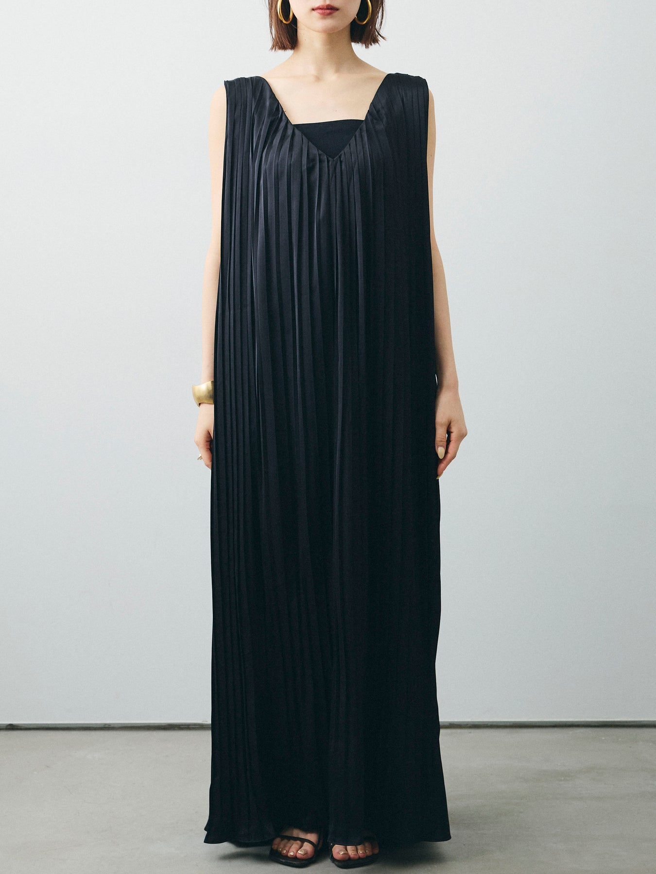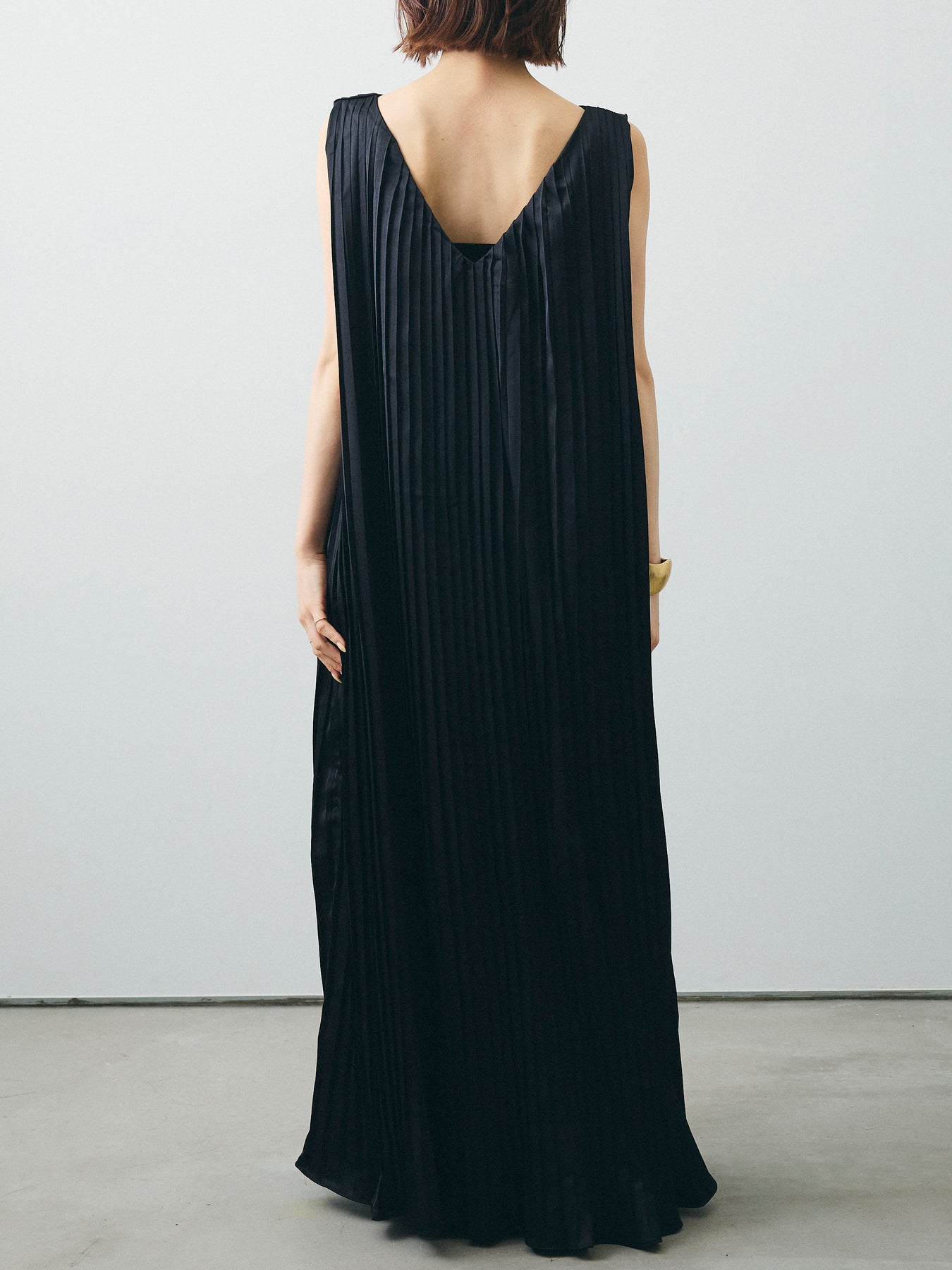 [予約]サテンプリーツVネックワンピース/ブラック