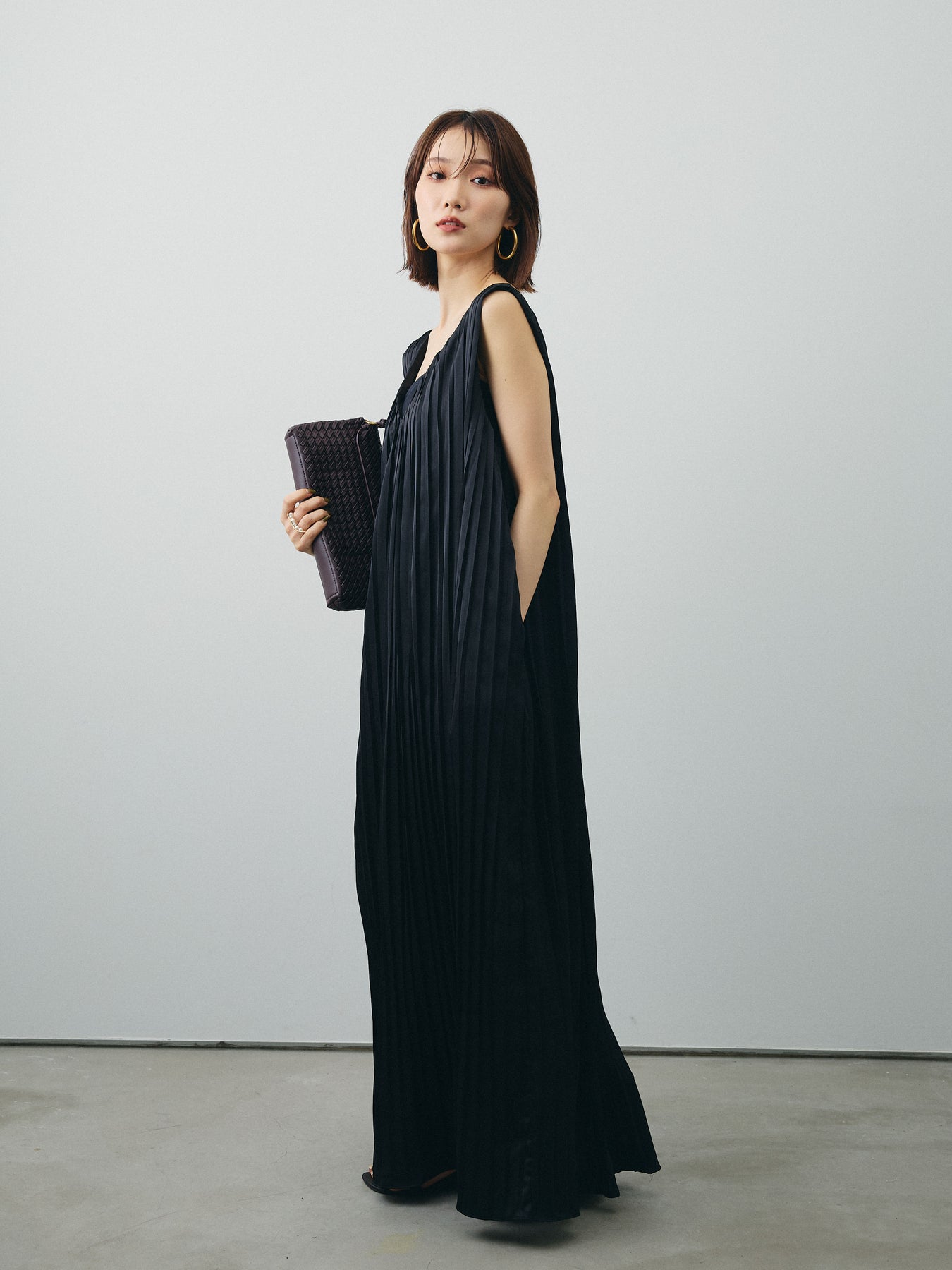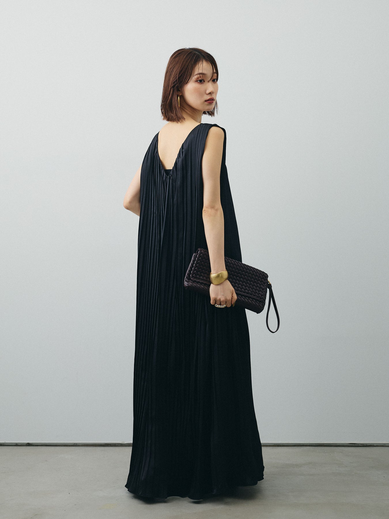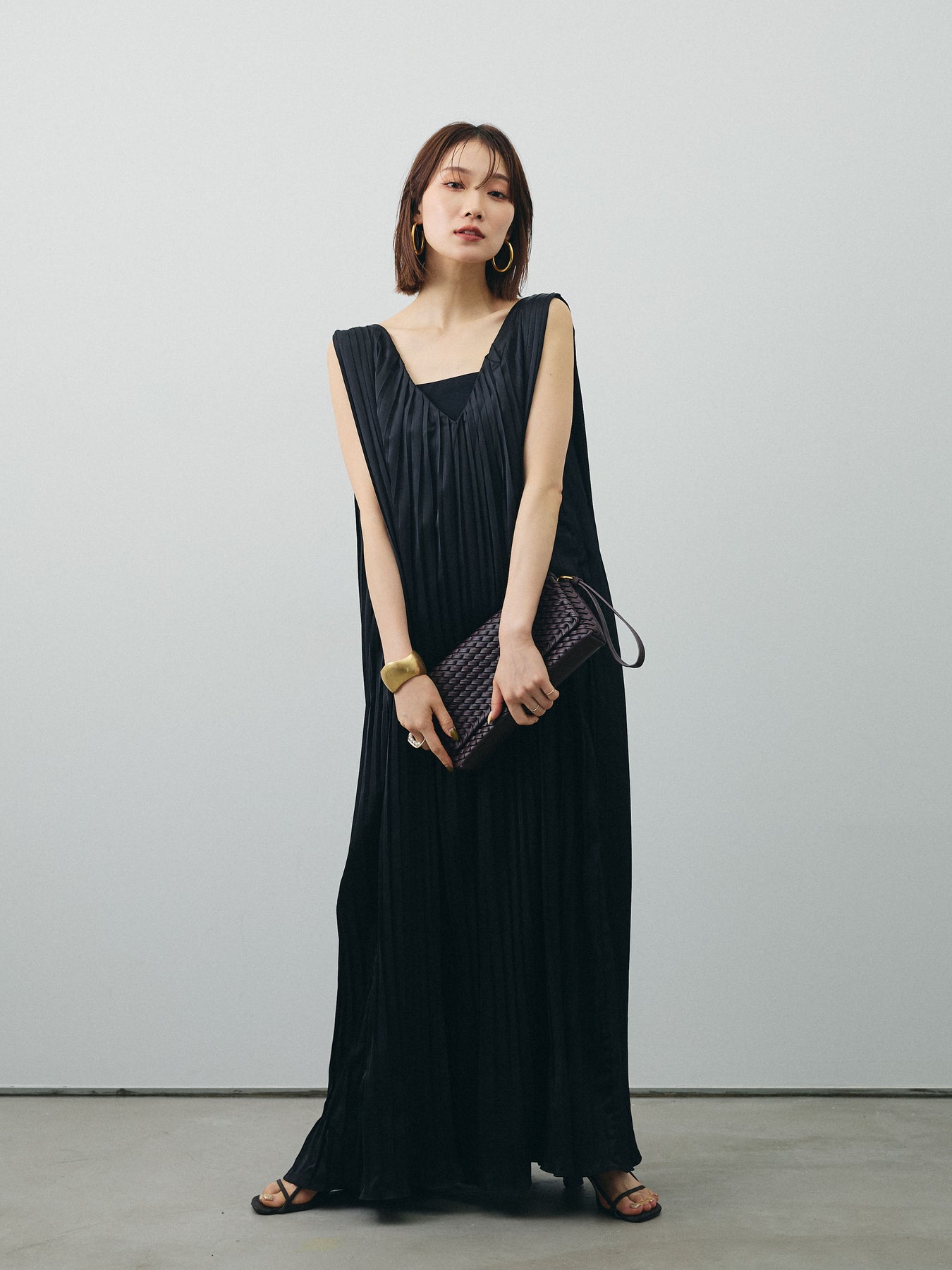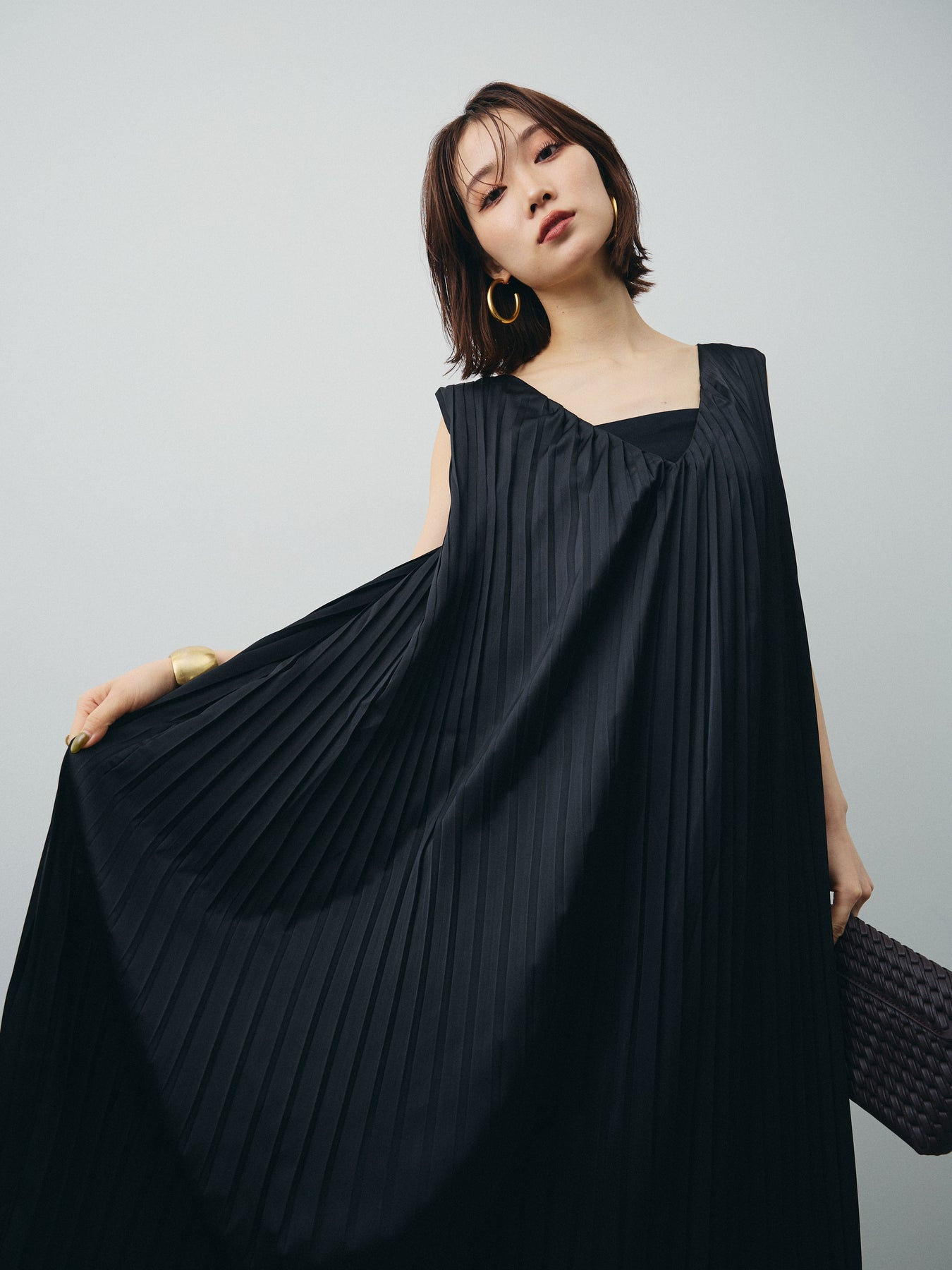 [予約]サテンプリーツVネックワンピース/ブラック
