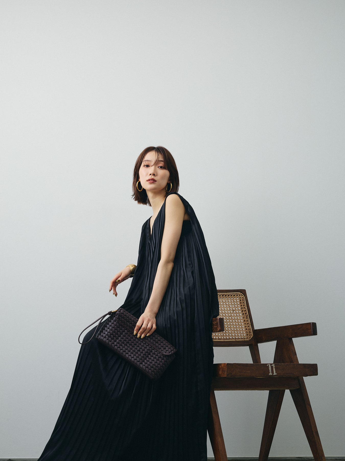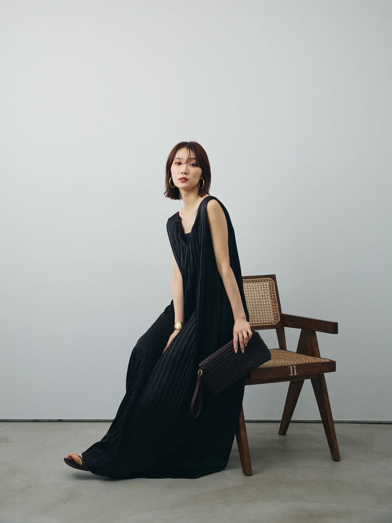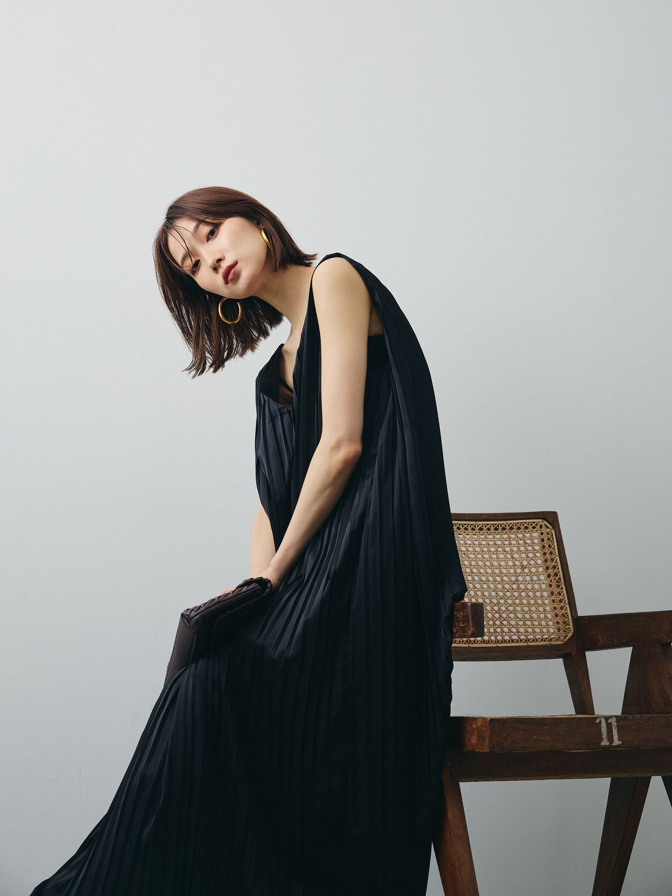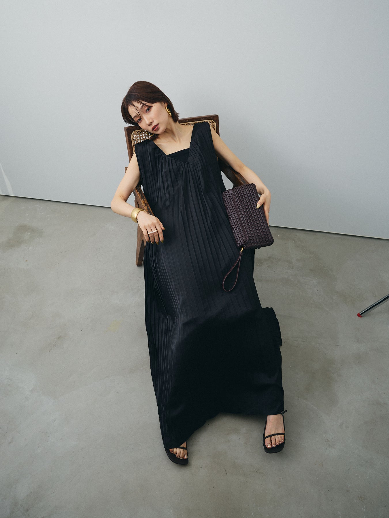 [予約]サテンプリーツVネックワンピース/ブラック