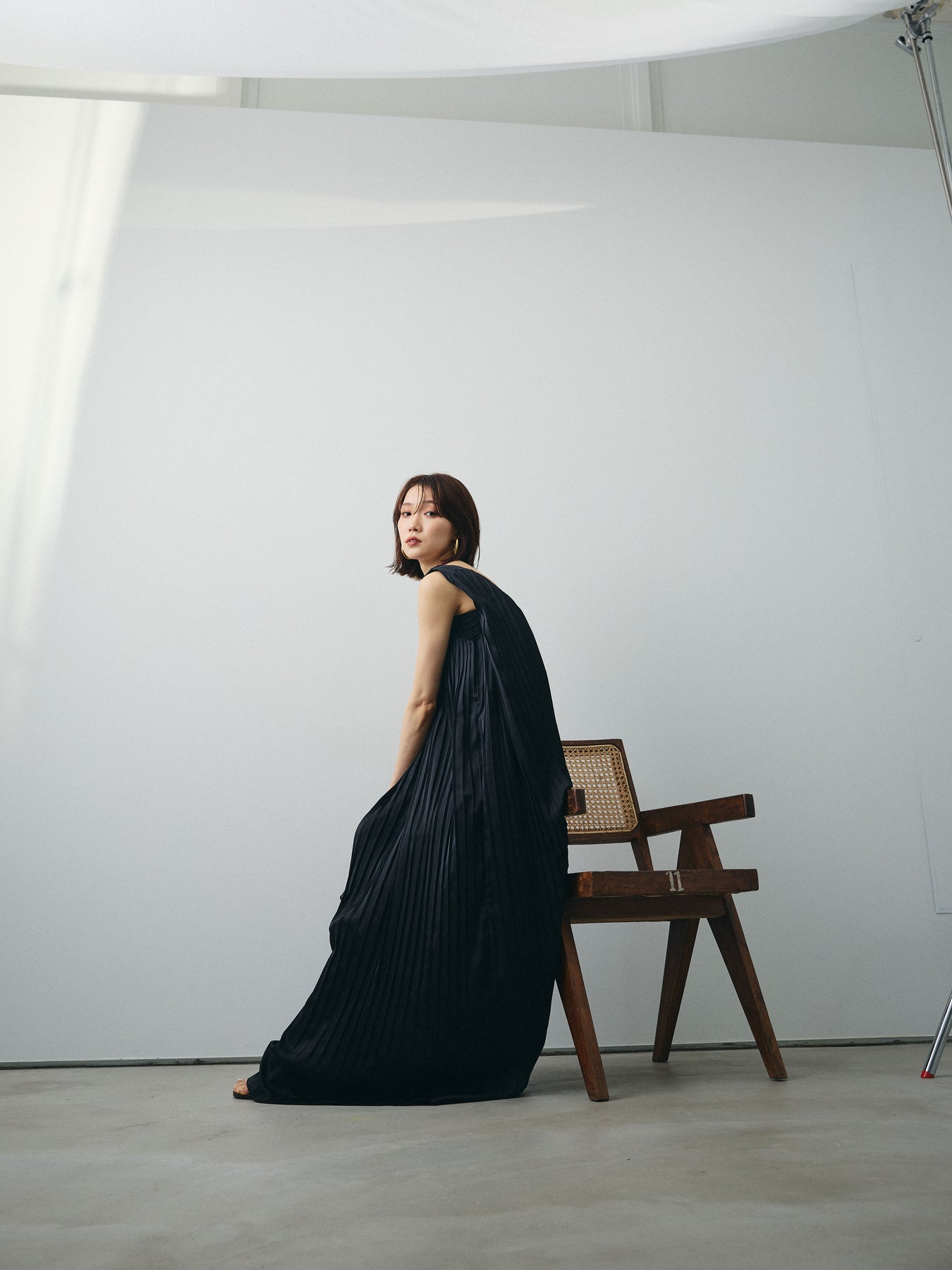 上品な艶感が魅力のサテン素材に、贅沢なプリーツを施したエレガントなVネックワンピース。 光の当たり方で表情を変えるとろみのある生地が、動くたびに美しく揺れ、1枚で存在感のあるスタイルを演出します。 深めのVネックがデコルテをすっきりと見せつつ、抜け感のある洗練された印象に。 ゆったりとしたシルエットで、体のラインを拾わずリラクシーな着心地ながらも、縦ラインを強調してスタイルアップ効果も◎ 1枚で着るのはもちろん、Tシャツやタートルネックとのレイヤードでロングシーズン活躍。 パーティーシーンからカジュアルダウンまで、着回し力にも優れた万能ワンピースです。