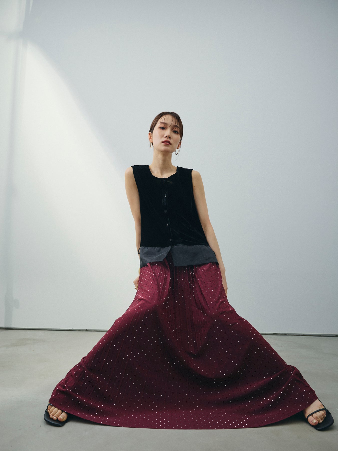 柔らかな光沢を放つベロア素材に、裾のチュールレイヤーがフェミニンなアクセントを添えるノースリーブプルオーバー。 異素材の組み合わせが、シンプルながらも印象的なスタイリングを叶える1枚です。 程よいゆとりのあるシルエットで、ボディラインを拾いにくく着心地も快適。 裾のチュール部分には細やかなドロストリボン付きで、シルエットのアレンジが可能です。 デニムやスラックスと合わせてモードに、スカートと合わせればレディな着こなしにも◎ インナー使いとしても、トップスの主役としても活躍する、着回し力の高いアイテムです。