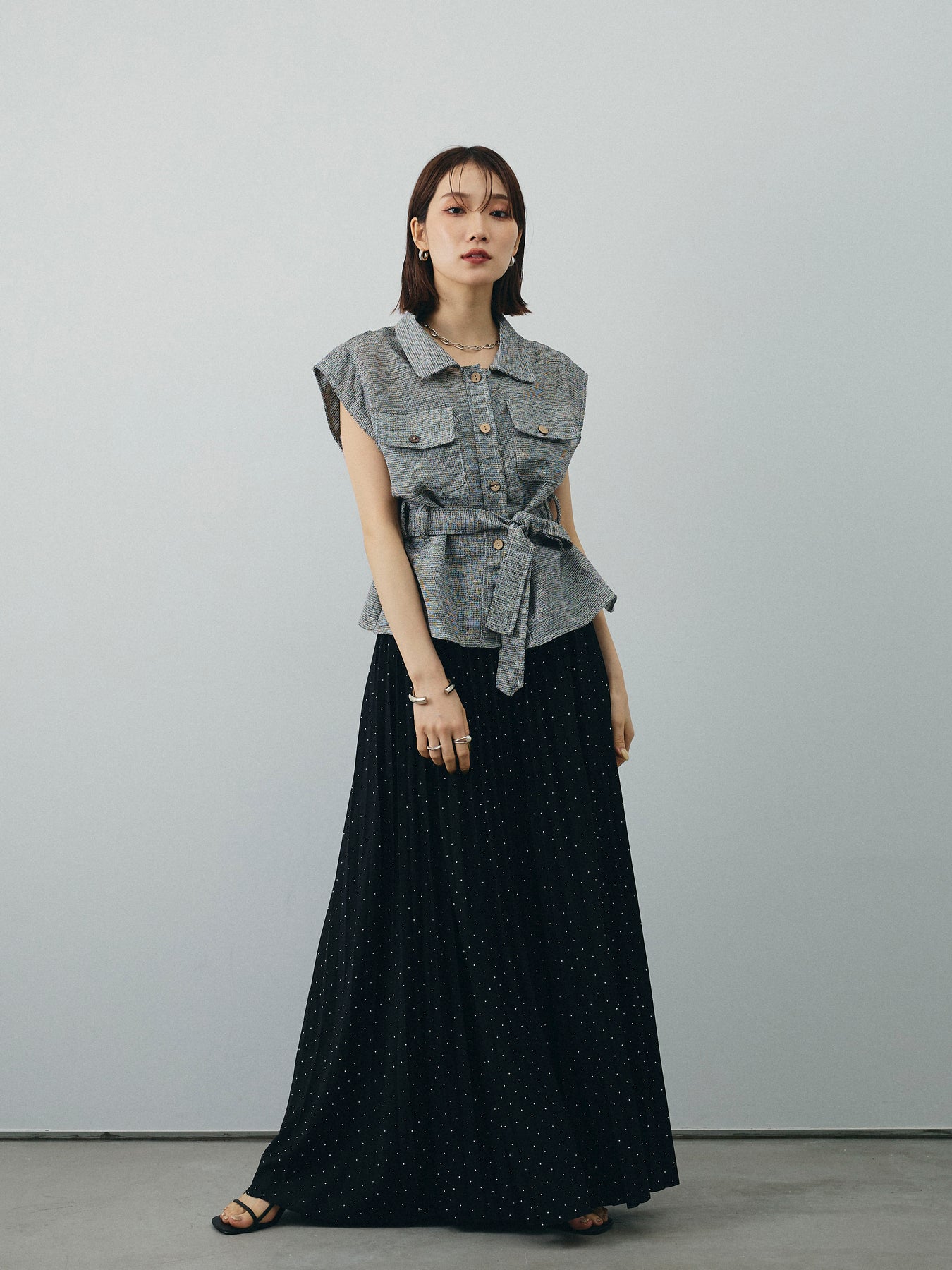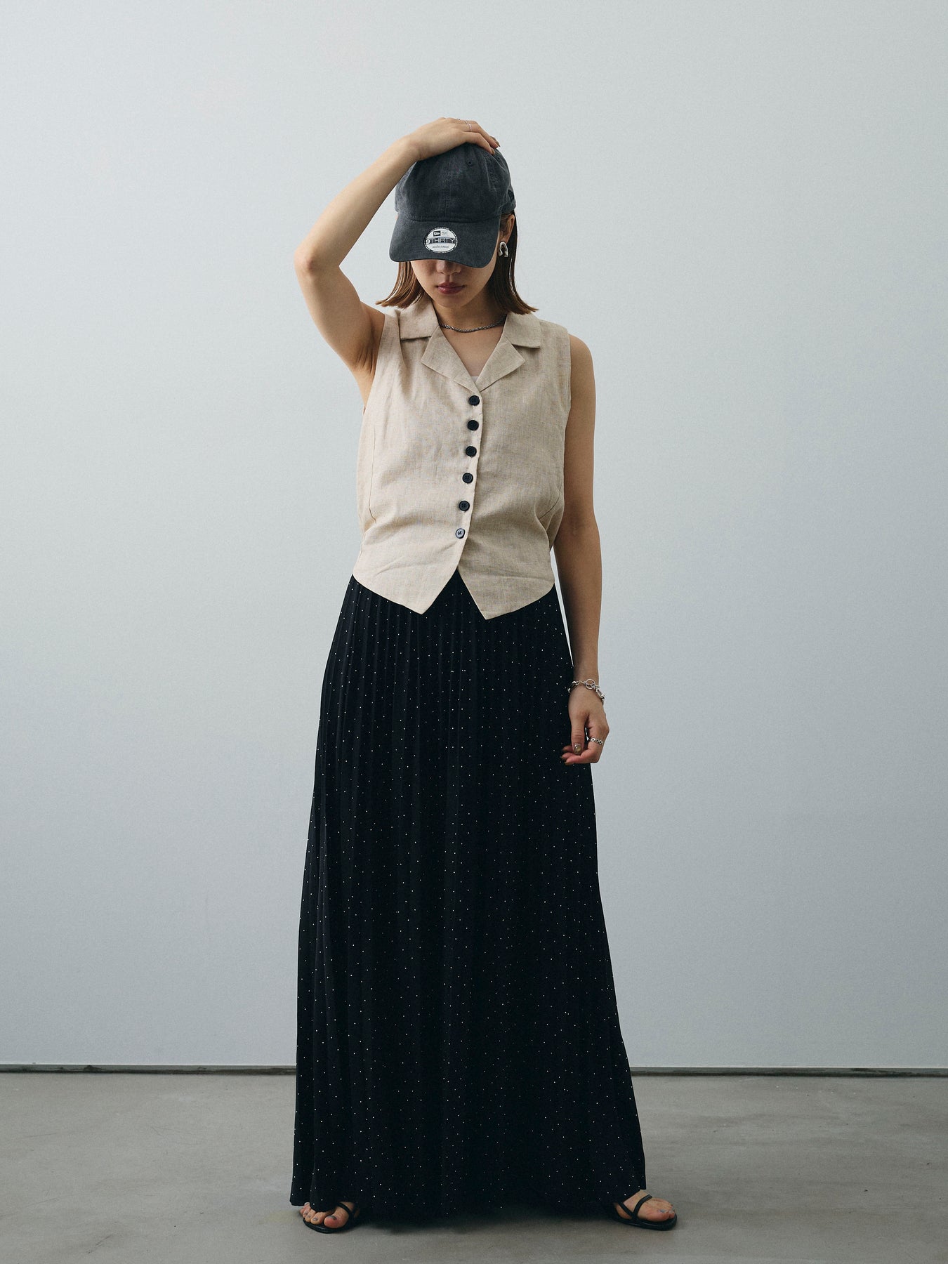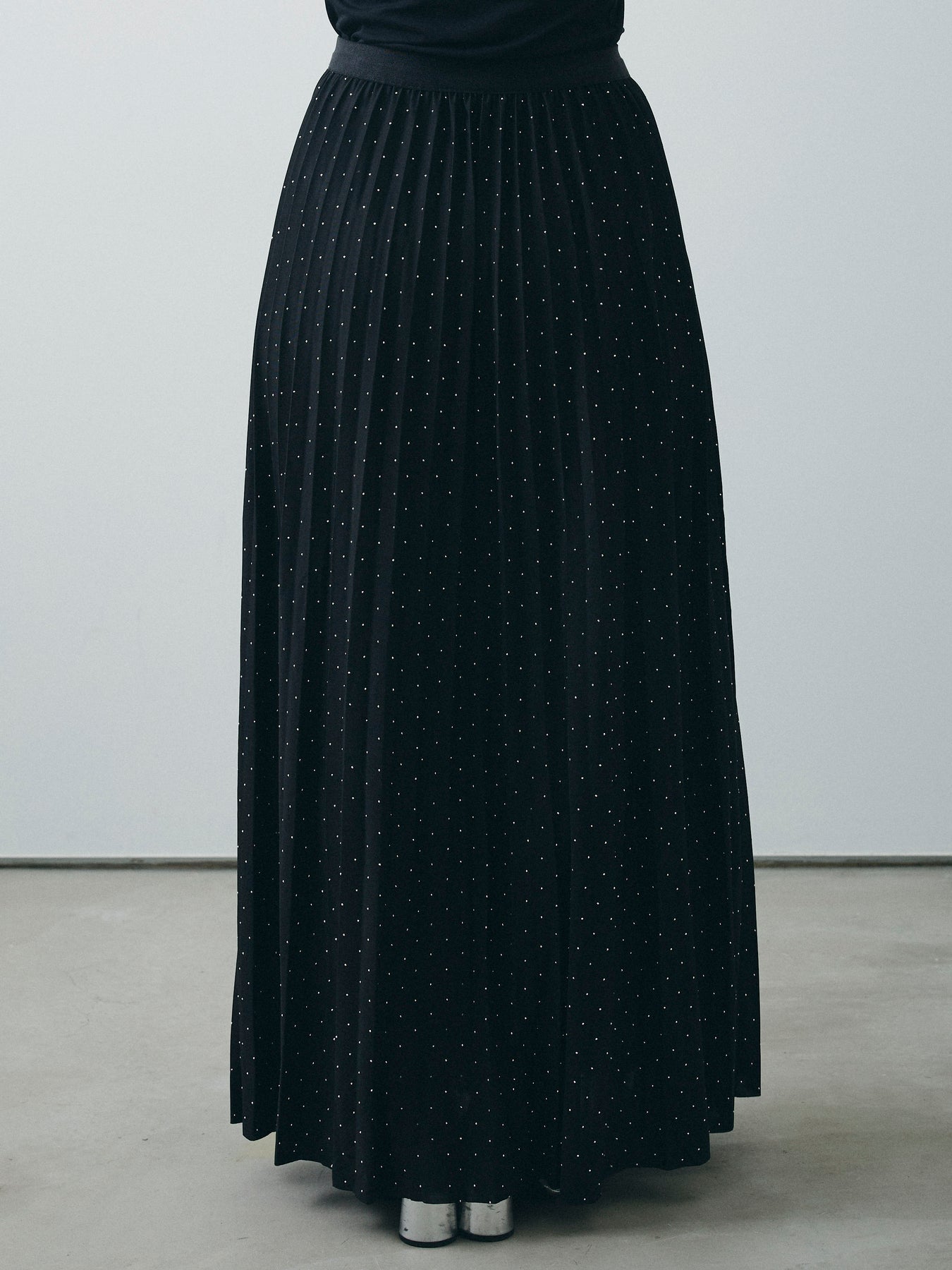 きらりと輝くラインストーンが散りばめられた、華やかさと上品さを兼ね備えたプリーツスカート。 動くたびに繊細な輝きを放ち、コーディネートにアクセントを加えてくれる主役級アイテムです。 しなやかに揺れる細やかなプリーツが美しいシルエットを生み出し、歩くだけで優雅な印象に。 ウエストはゴム仕様で、ストレスフリーな履き心地と自然なフィット感を実現します。 ニットやスウェットと合わせてカジュアルダウンさせたり、ブラウスと合わせてオケージョンスタイルにも◎ シーズンレスで着回せる、ワードローブに加えたい一着です。 カラーはベーシックからアクセントカラーまで豊富にラインナップ。気分やスタイルに合わせてお選びいただけます。