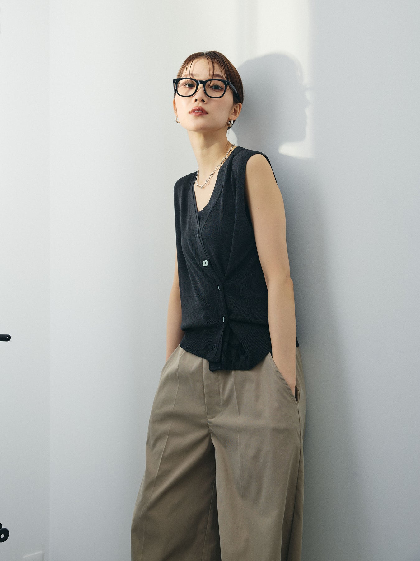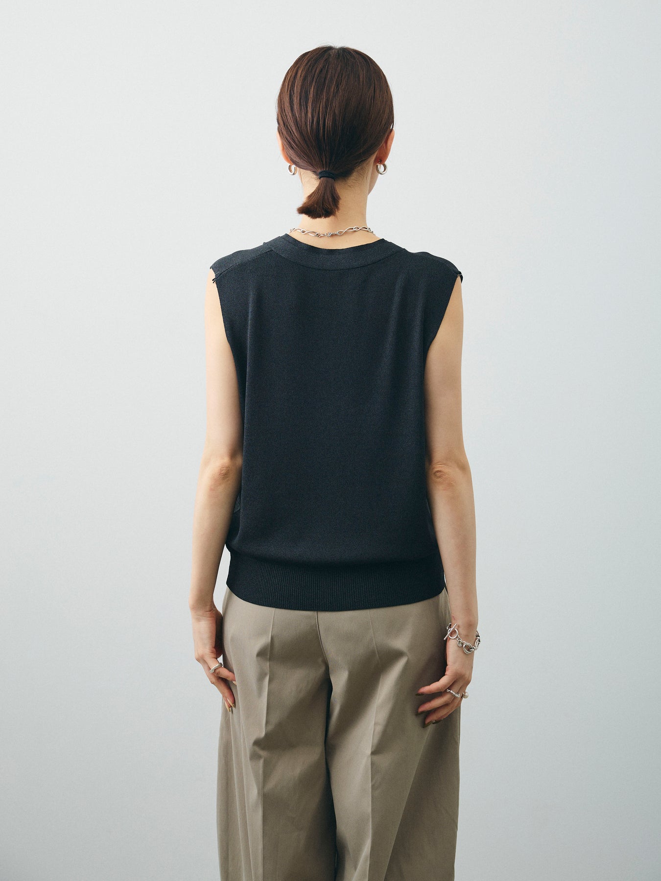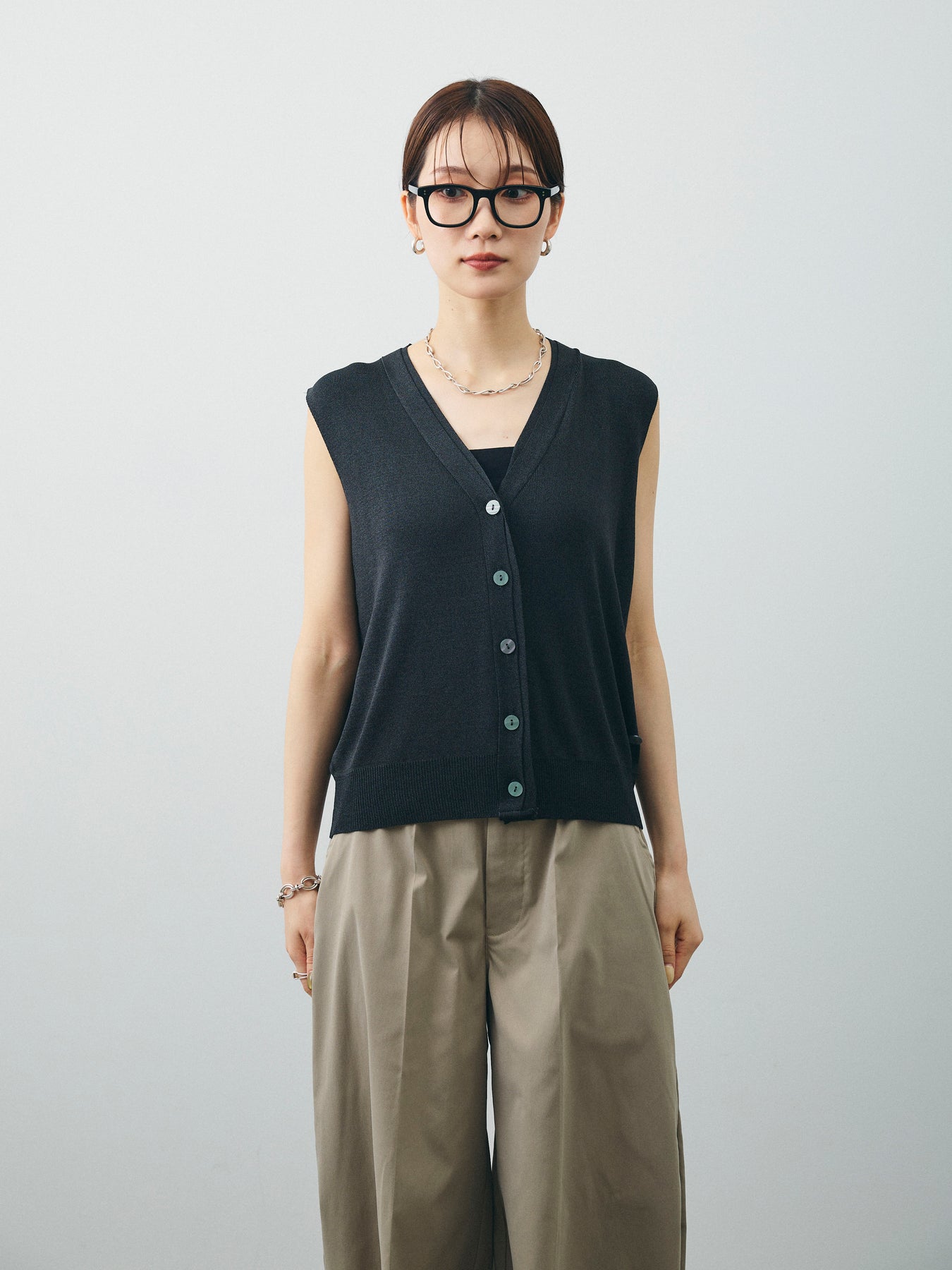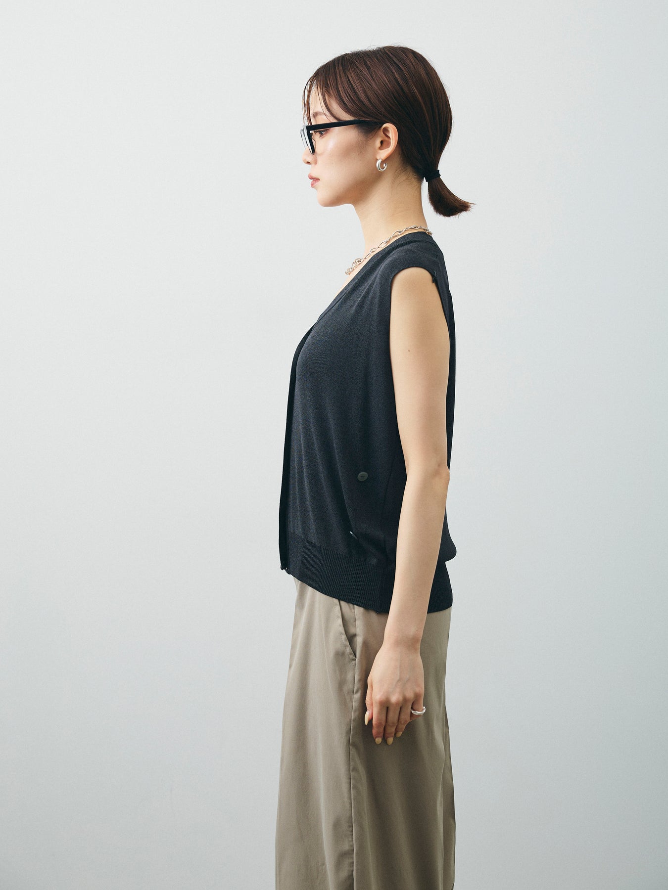 さらりとした肌触りが魅力のクールタッチ素材を使用した、2WAY仕様のニットベスト。 前後どちらでも着用できるデザインで、シーンや気分に合わせてアレンジが楽しめる万能アイテムです。 Vネックとクルーネック、2つの表情を持つデザインに加え、ややゆとりのあるシルエットがこなれ感を演出。 ボタンを閉じてプルオーバー風に、開けて羽織りとしても着用可能です。 ノースリーブなのでTシャツやブラウスとのレイヤードはもちろん、ワンピースに重ねても◎ シンプルながらも洗練された印象で、着回し力抜群の1枚です。