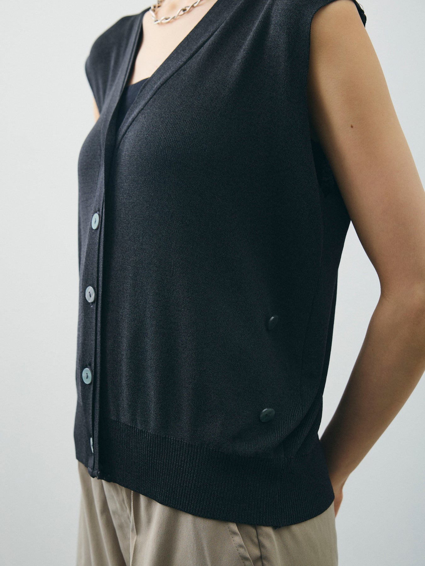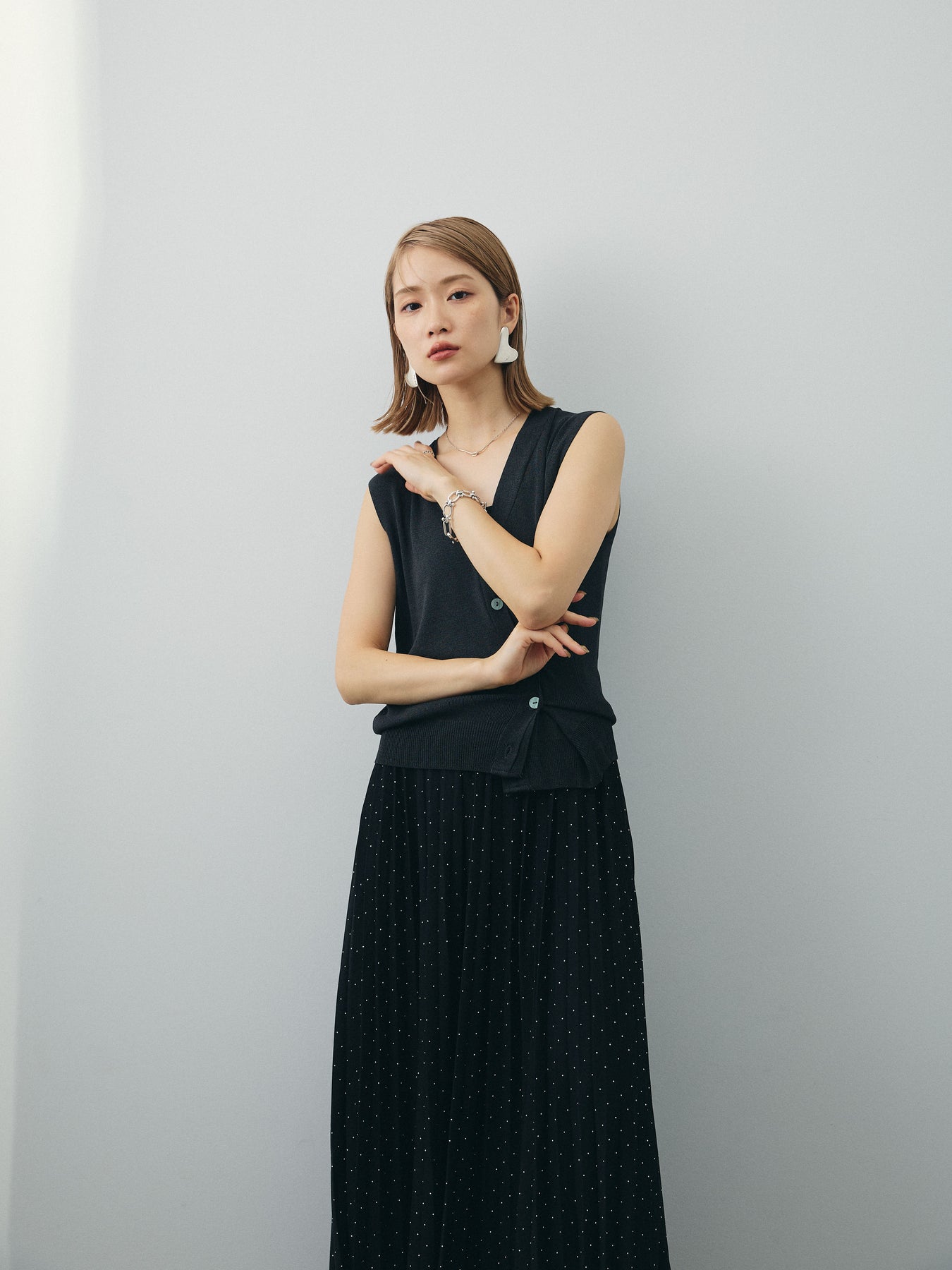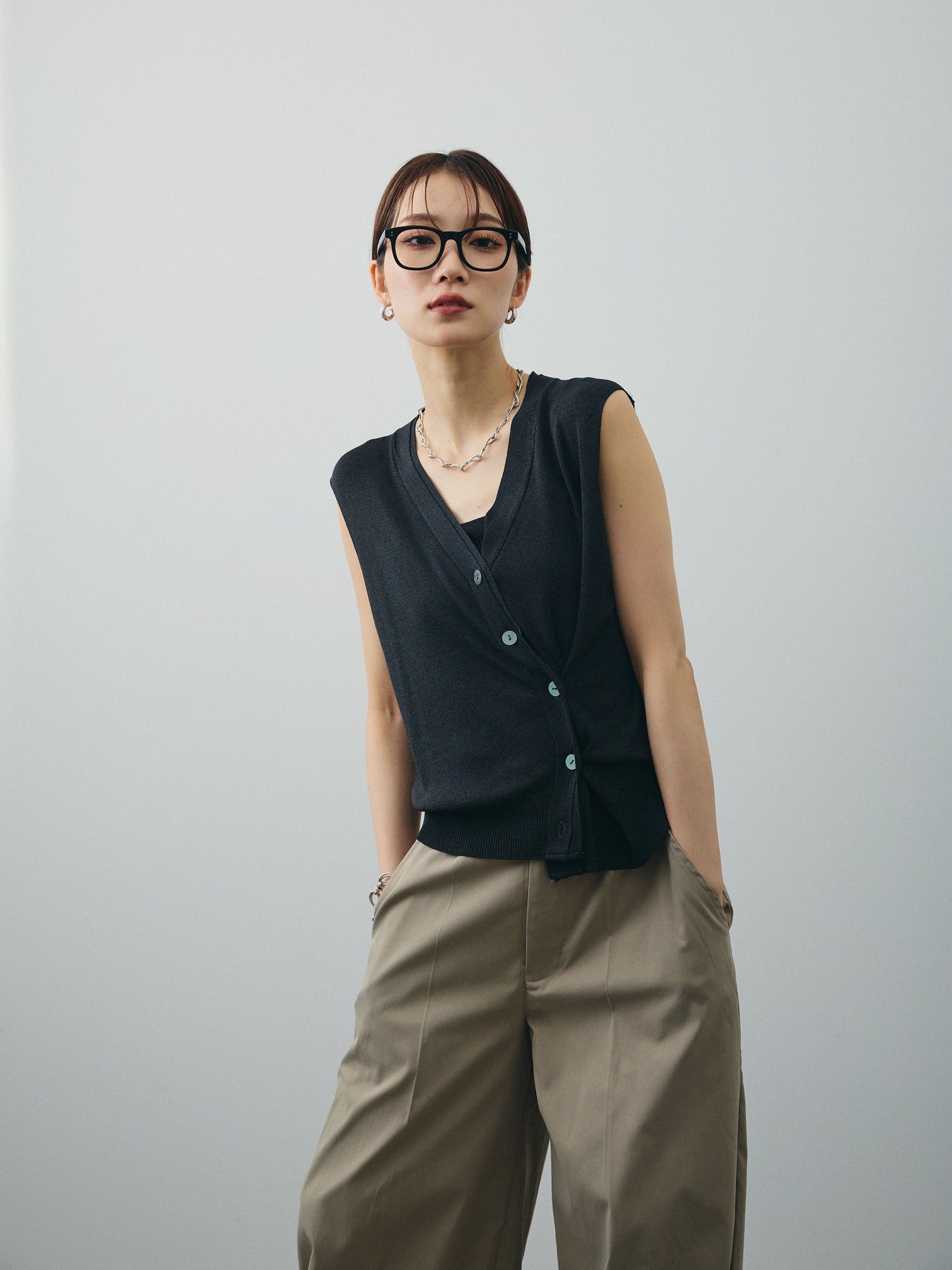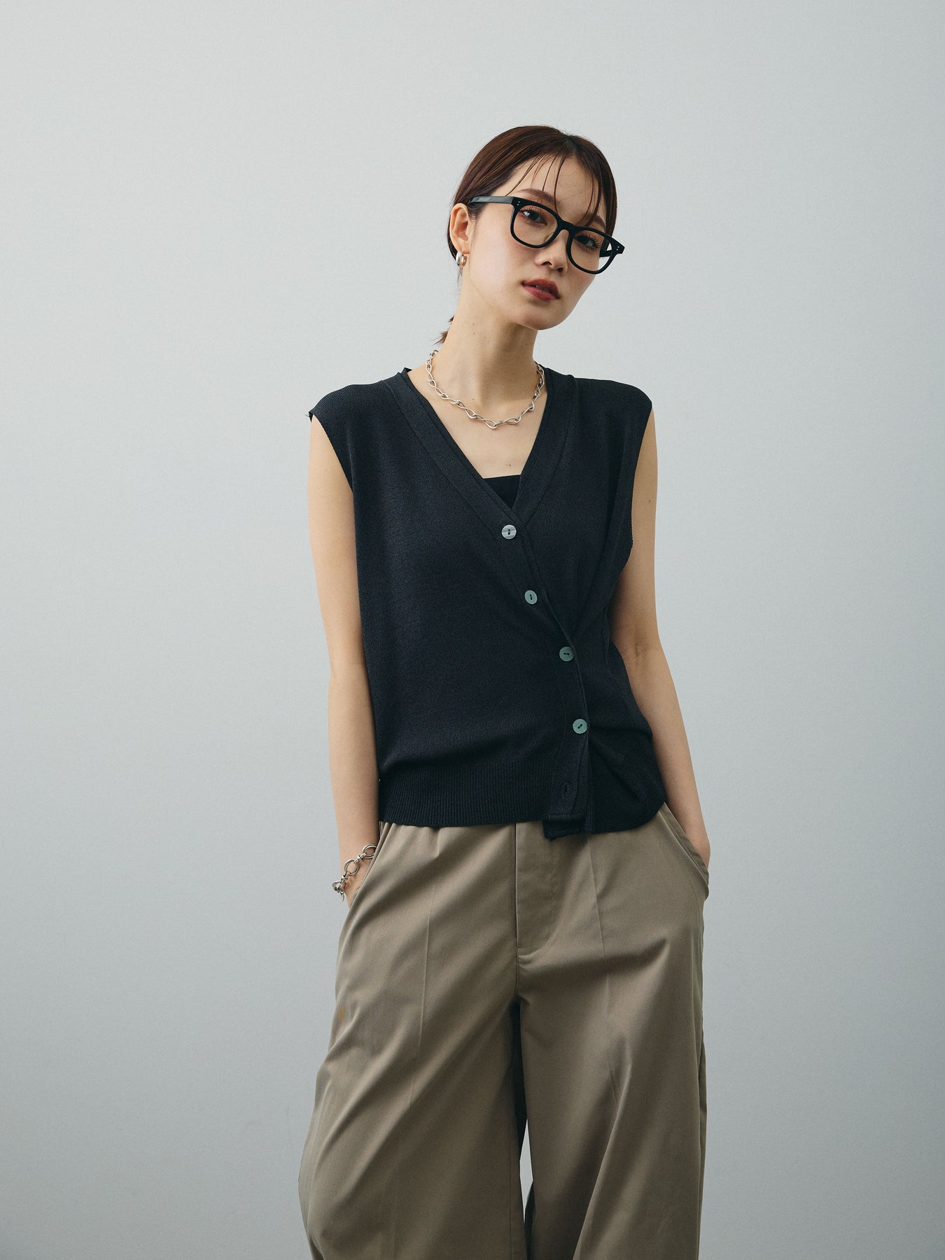 さらりとした肌触りが魅力のクールタッチ素材を使用した、2WAY仕様のニットベスト。 前後どちらでも着用できるデザインで、シーンや気分に合わせてアレンジが楽しめる万能アイテムです。 Vネックとクルーネック、2つの表情を持つデザインに加え、ややゆとりのあるシルエットがこなれ感を演出。 ボタンを閉じてプルオーバー風に、開けて羽織りとしても着用可能です。 ノースリーブなのでTシャツやブラウスとのレイヤードはもちろん、ワンピースに重ねても◎ シンプルながらも洗練された印象で、着回し力抜群の1枚です。