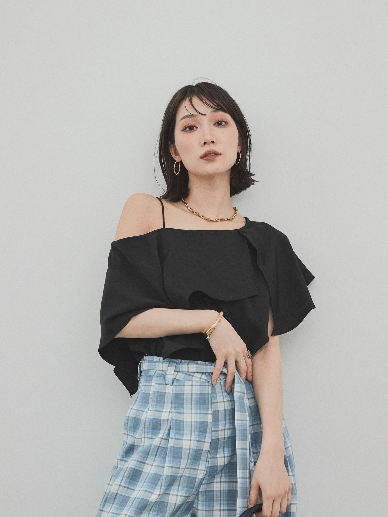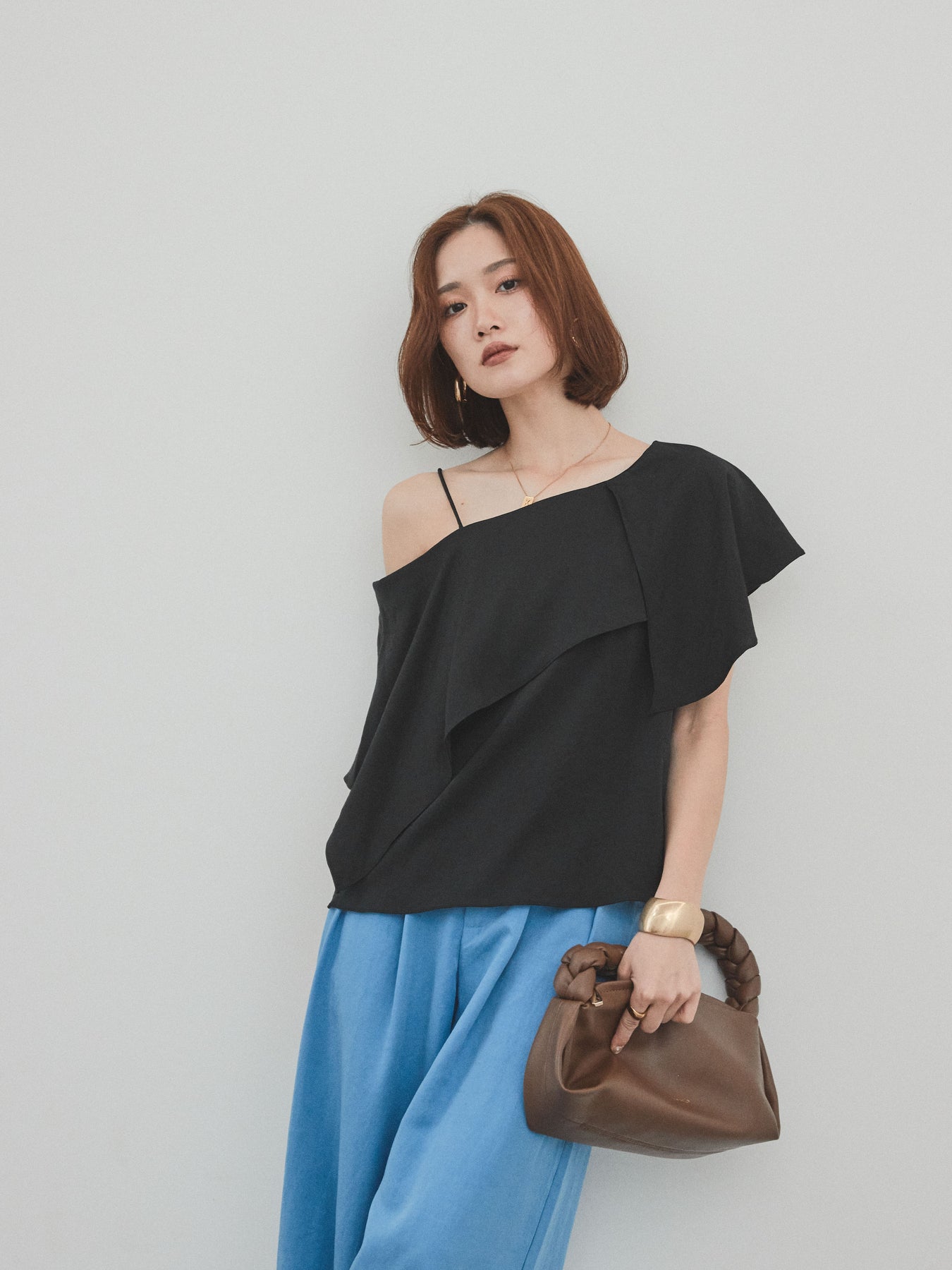 華やかさと抜け感を兼ね備えた、ワンショルダー仕様のラッフルブラウス。アシンメトリーなシルエットがスタイリングに動きを与え、女性らしさを引き立ててくれます。肩のストラップと程よい肌見せがヘルシーな印象に。軽やかな素材感で着心地も良く、デイリーからお出かけシーンまで幅広く活躍します。シンプルなボトムと合わせるだけでトレンド感のあるコーディネートが完成する、主役級のアイテムです。 ※ボトムス、キャミソール(インナー)以外の商品は一律でインナーは付属していません。
