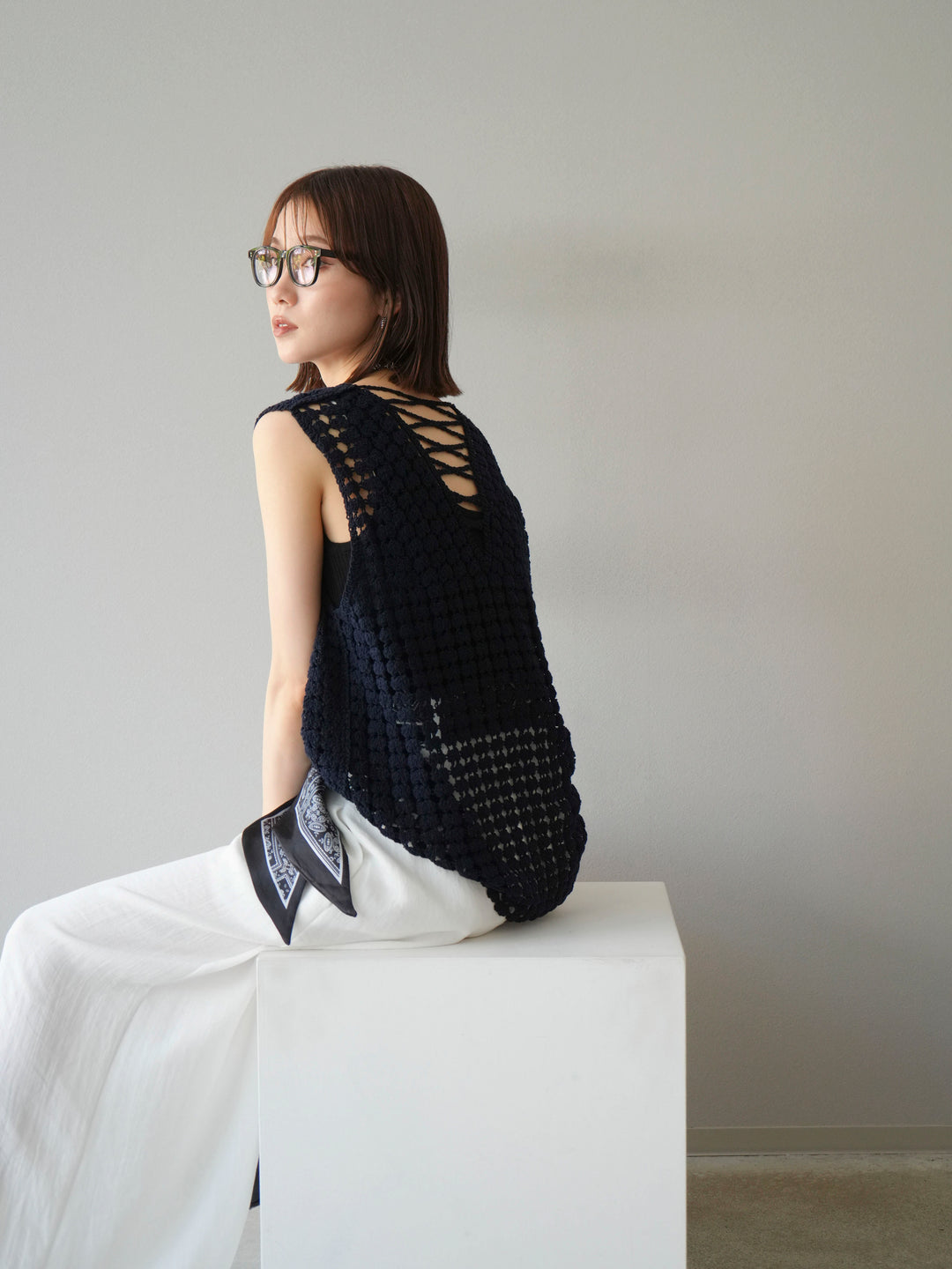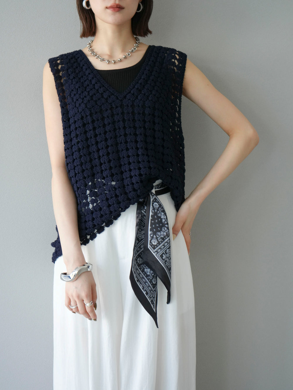 [予約]レースアップクロシェ編みニットベスト/ネイビー