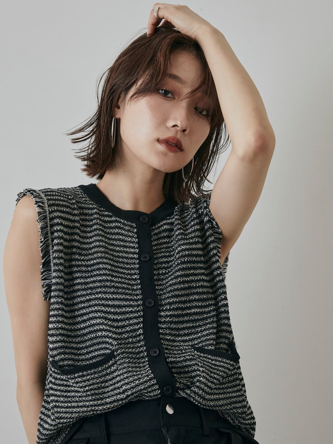 [予約]ボーダー袖フリンジニットベスト/ブラック