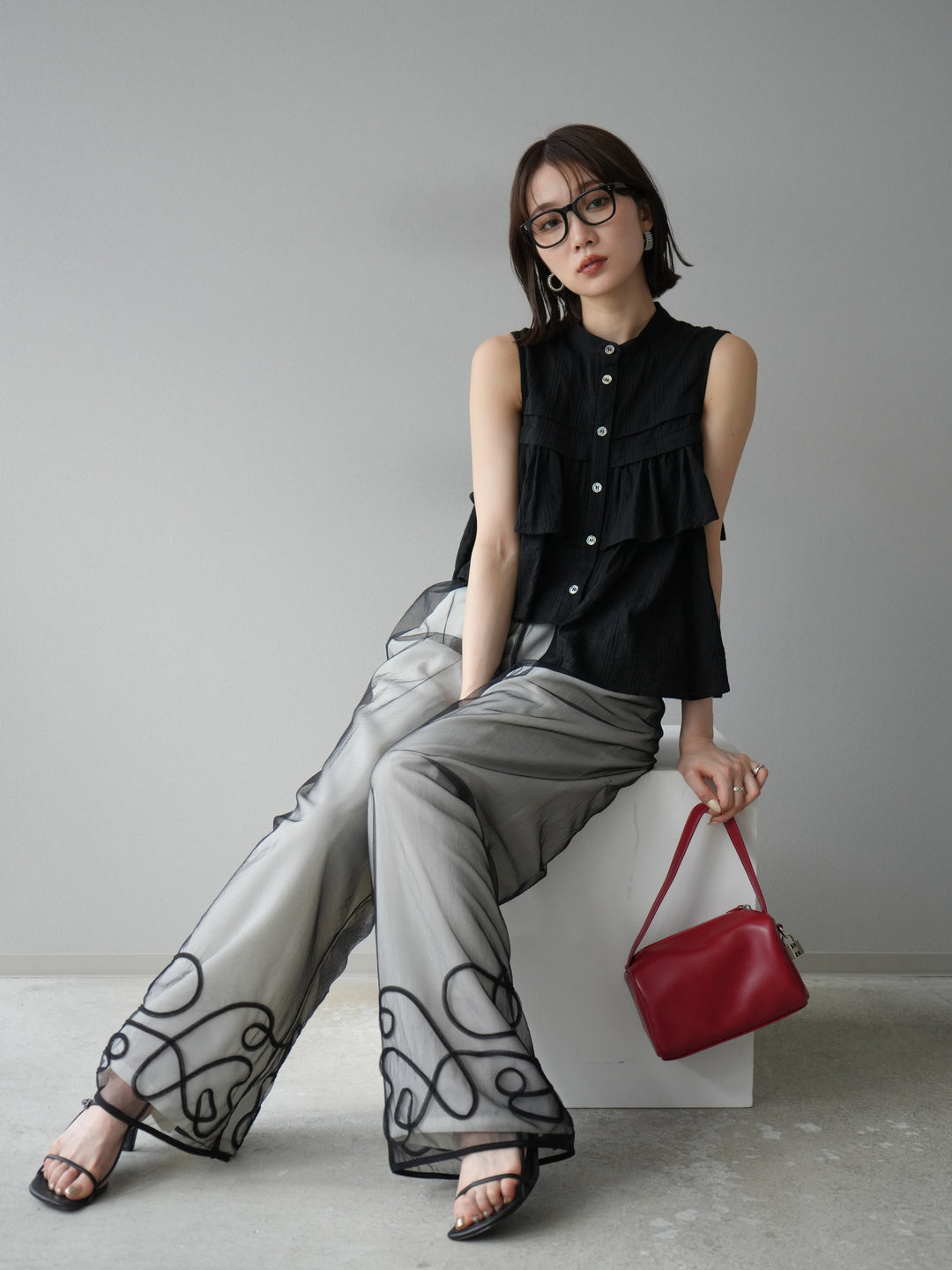 [SET]ドビーストライプアシンメトリーフリルノースリブラウス+コード刺繍チュールレイヤードパンツ+リネンライクイージーワイドパンツ(3set)