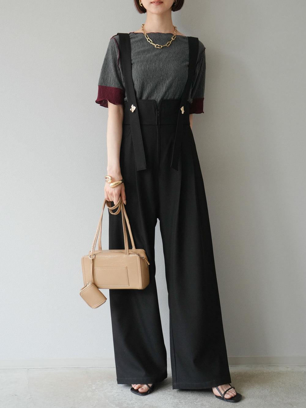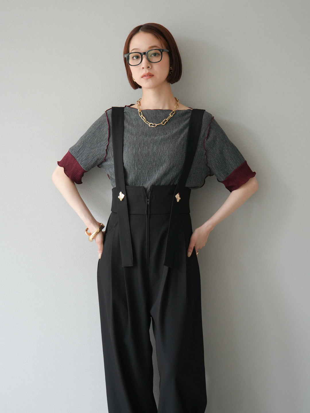 [SET]プリーツ配色ボートネックプルオーバー+ゴールドボタンサスペンダーワイドパンツ(2set)