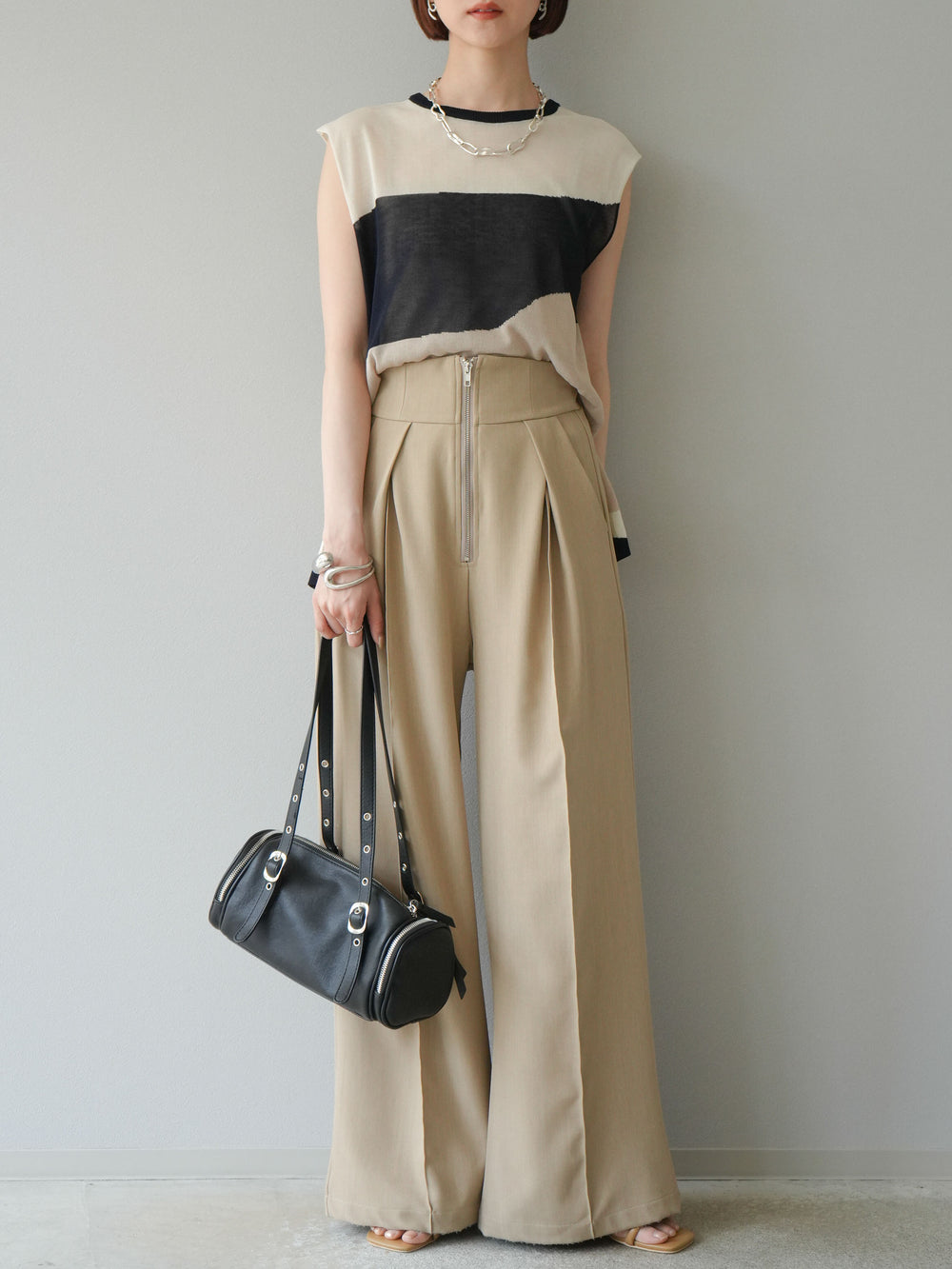 [SET]バイカラーシアーニットノースリーブ+ジップタックワイドパンツ(2set)