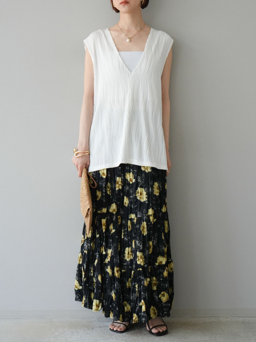 [SET]ウェーブパイピングVネックベスト+フラワーワッシャーロングスカート(2set)
