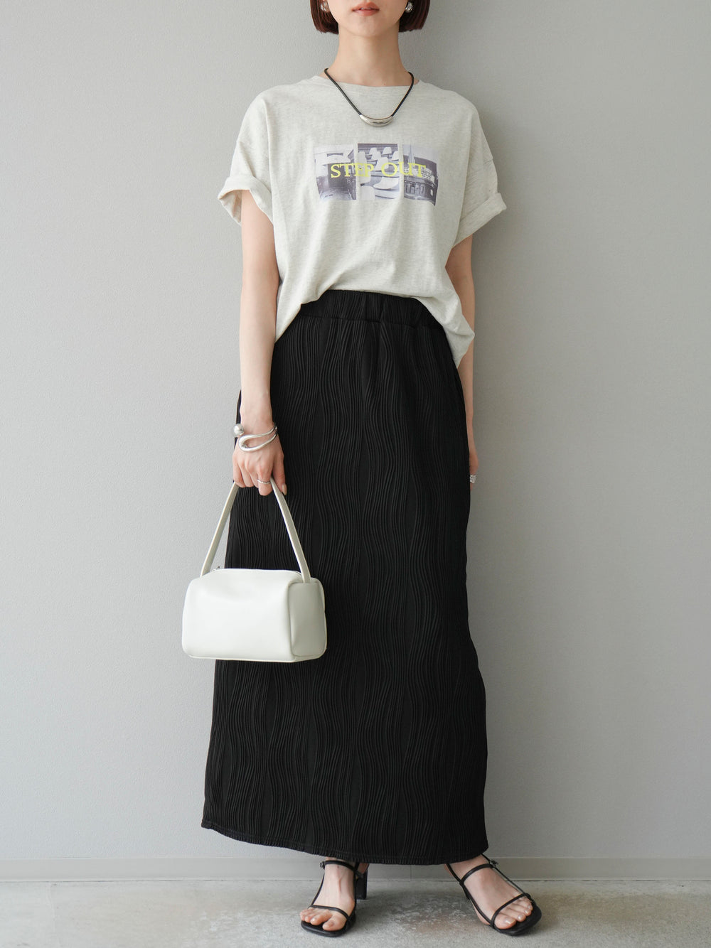 [SET]ネオンロゴコラージュフォトプリントオーバーTシャツ+ウェーブパイピングタイトスカート(2set)